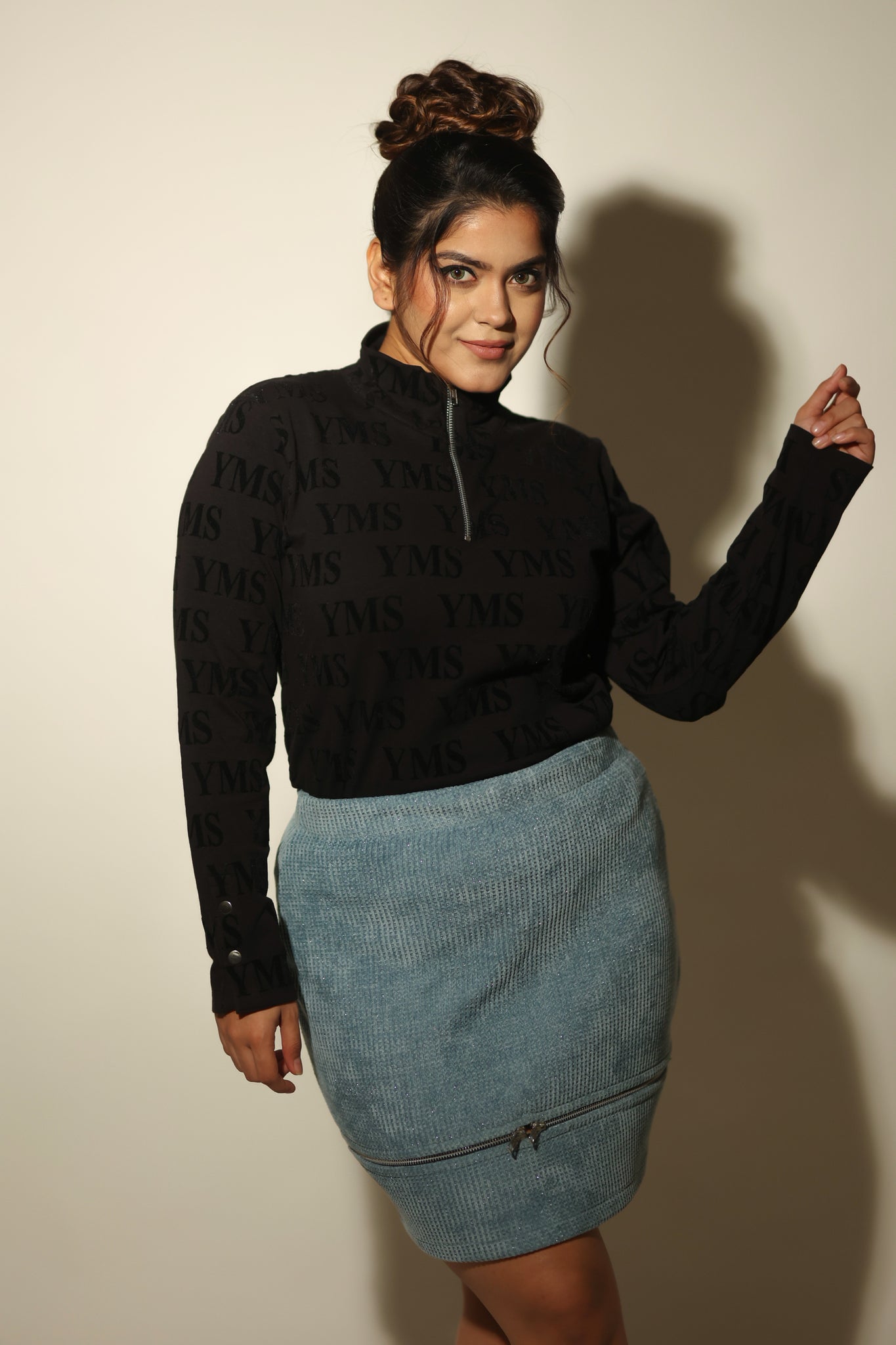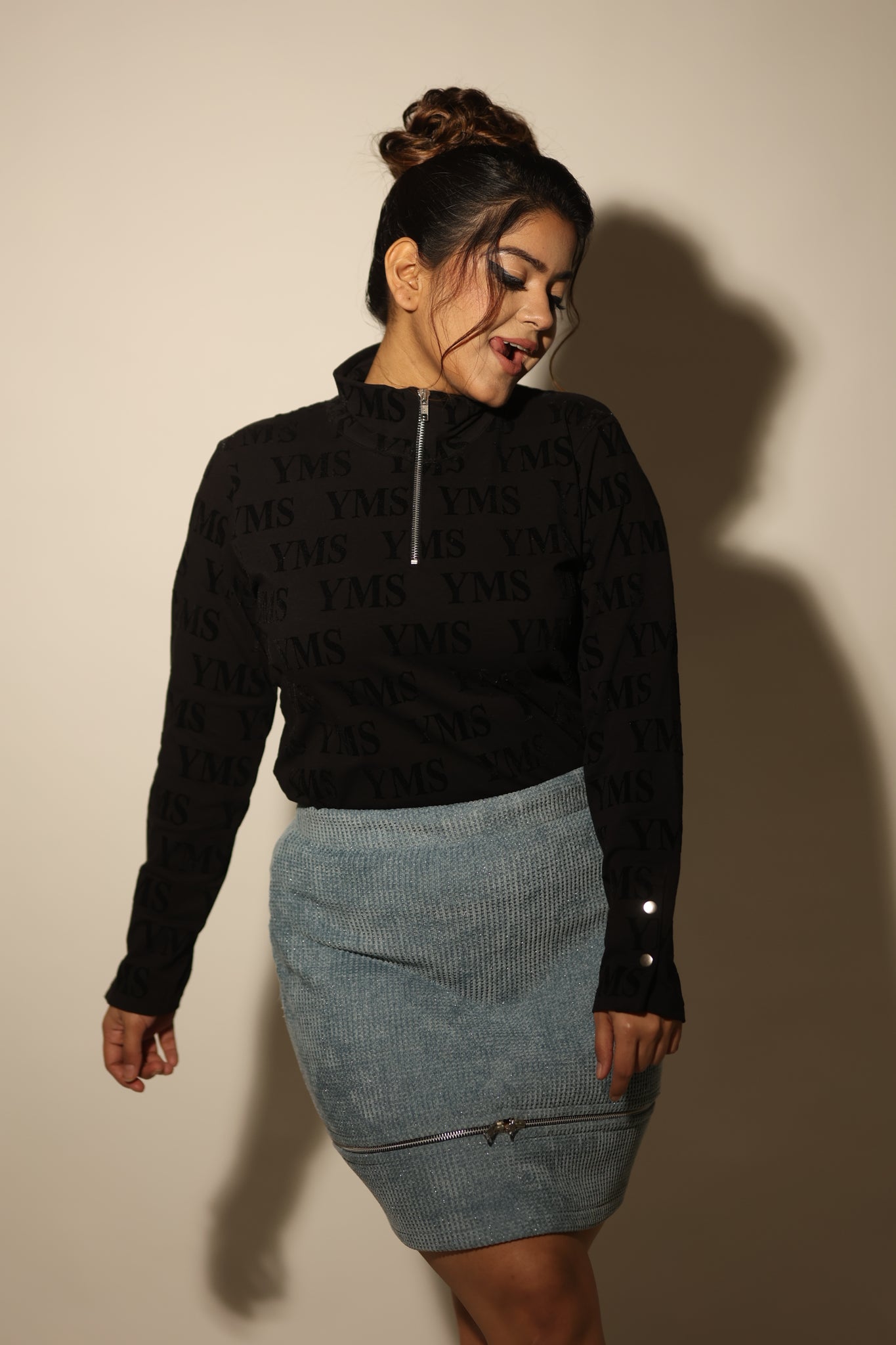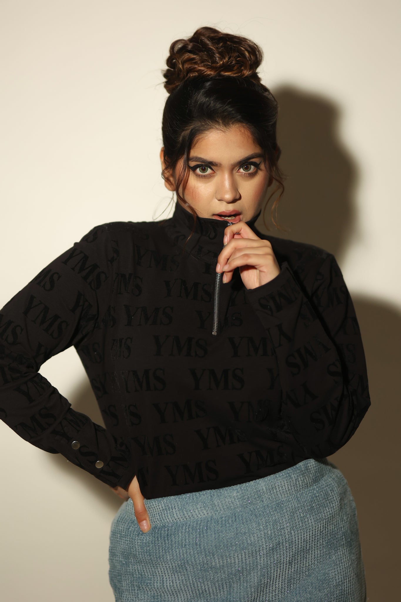 THIS HIGH NECK KNIT TOP FEATURING FRONT ZIPPER DETAILING AND ALL OVER PRINT CAN BE PAIRED WITH ANY SKIRT OR BOTTOM. A CLASSIC ADD ON TO YOUR WARDROBE. DON'T MISS OUT THE DETAILING ON THE SLEEVE OPENING!