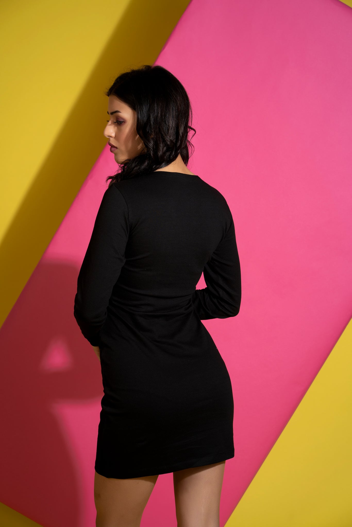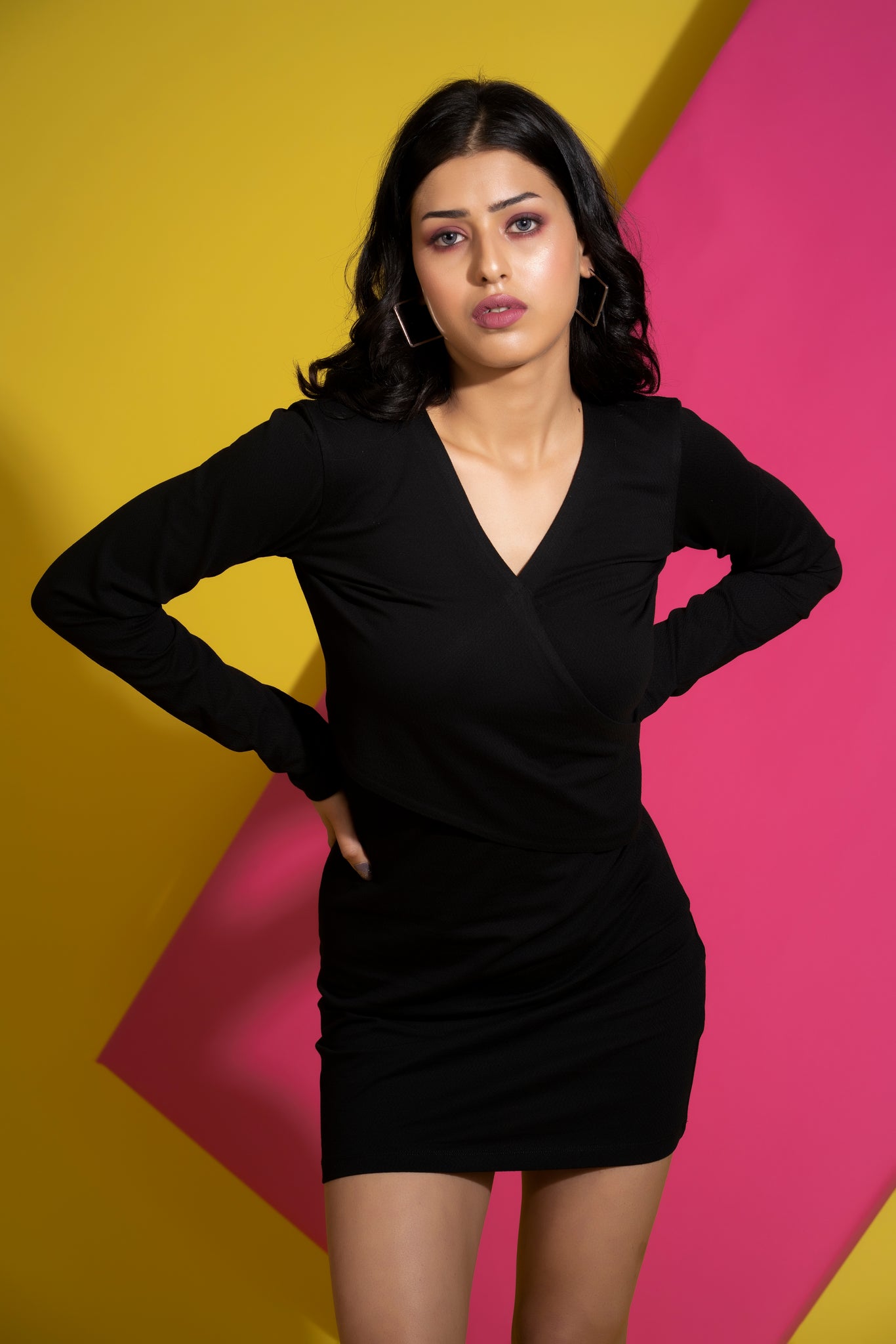 This balck dress is crafted in cotton lycra self knitted fabric, and features stylish V-neckline and full sleeves.