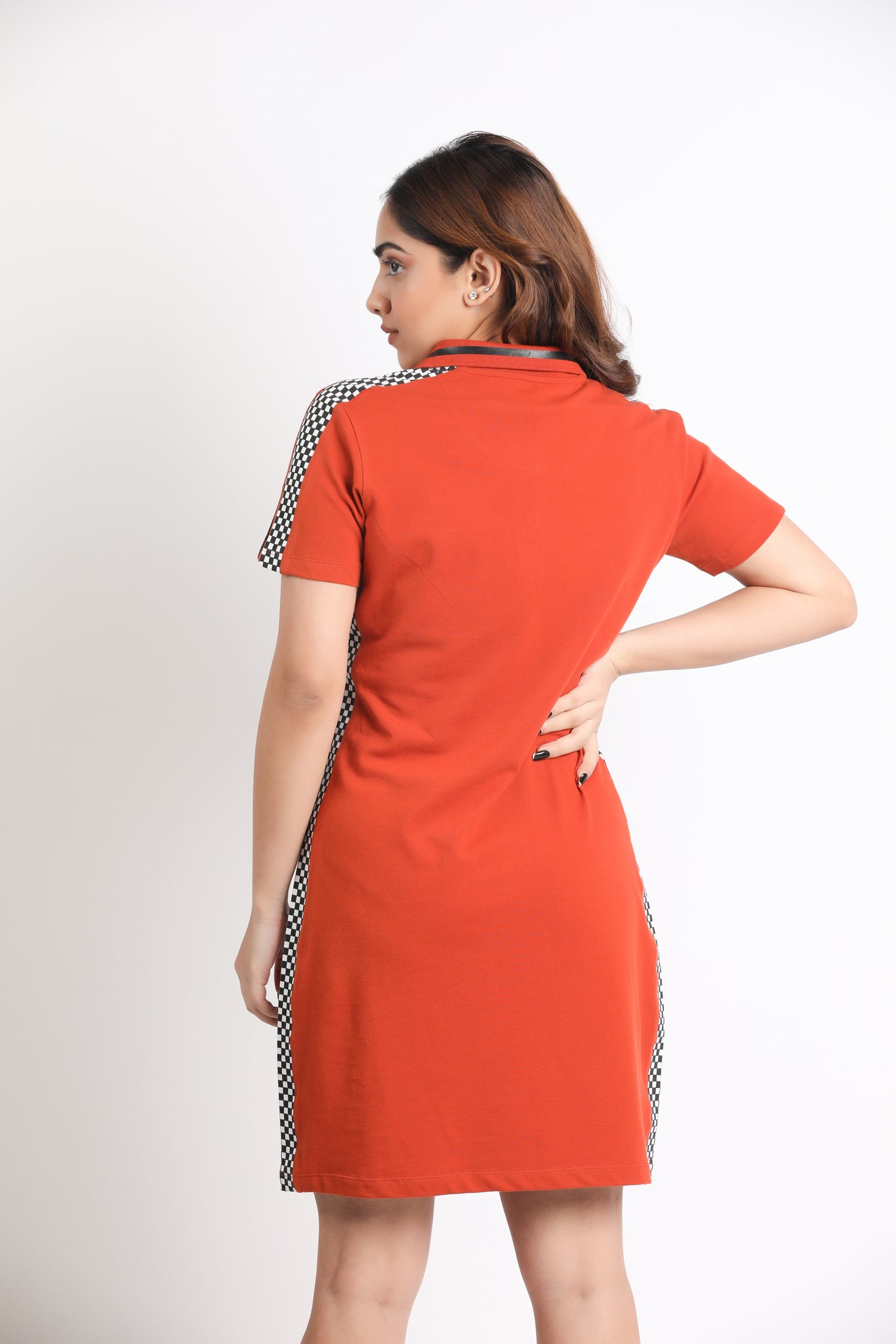 Look fabulous in this Orange Polo T-shirt Dress with Check detailing on the sides. A Fun yet cool outfit for your girls Day out.