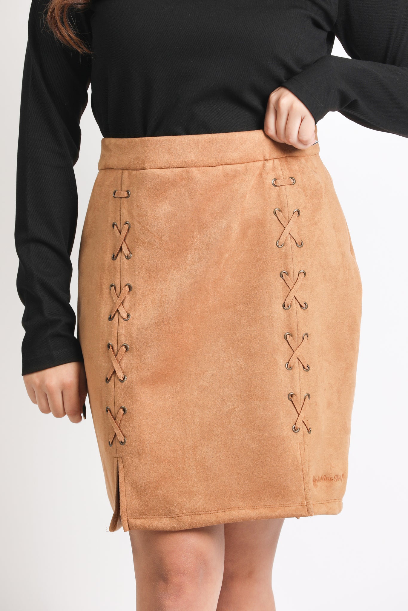 Go back to 70s Trends in this Suede Crisscross detailing Skirt. Pair it with a high neck top rock this look.!