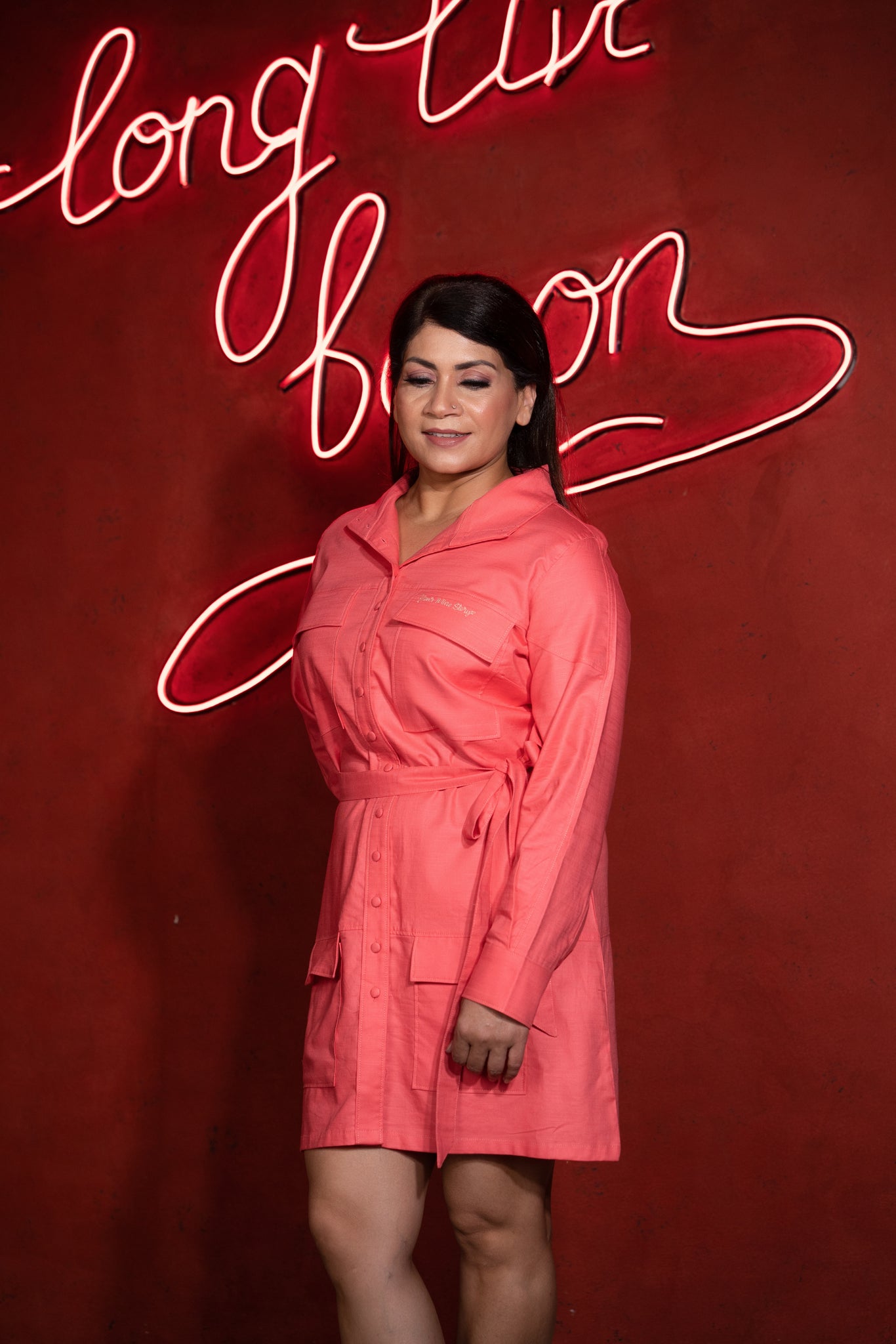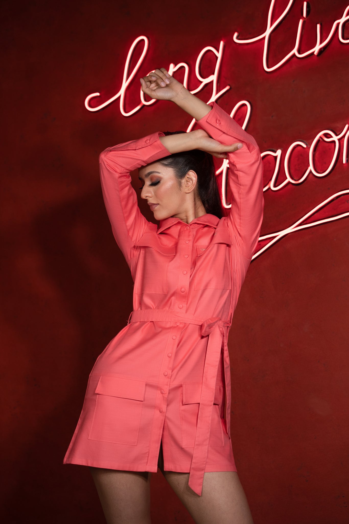 Get a perfect summer look in this pink shirt dress that is easy style and very comfortable to wear featuring spread collar, full length sleeves, button down front and an adjustable belt on the waist.