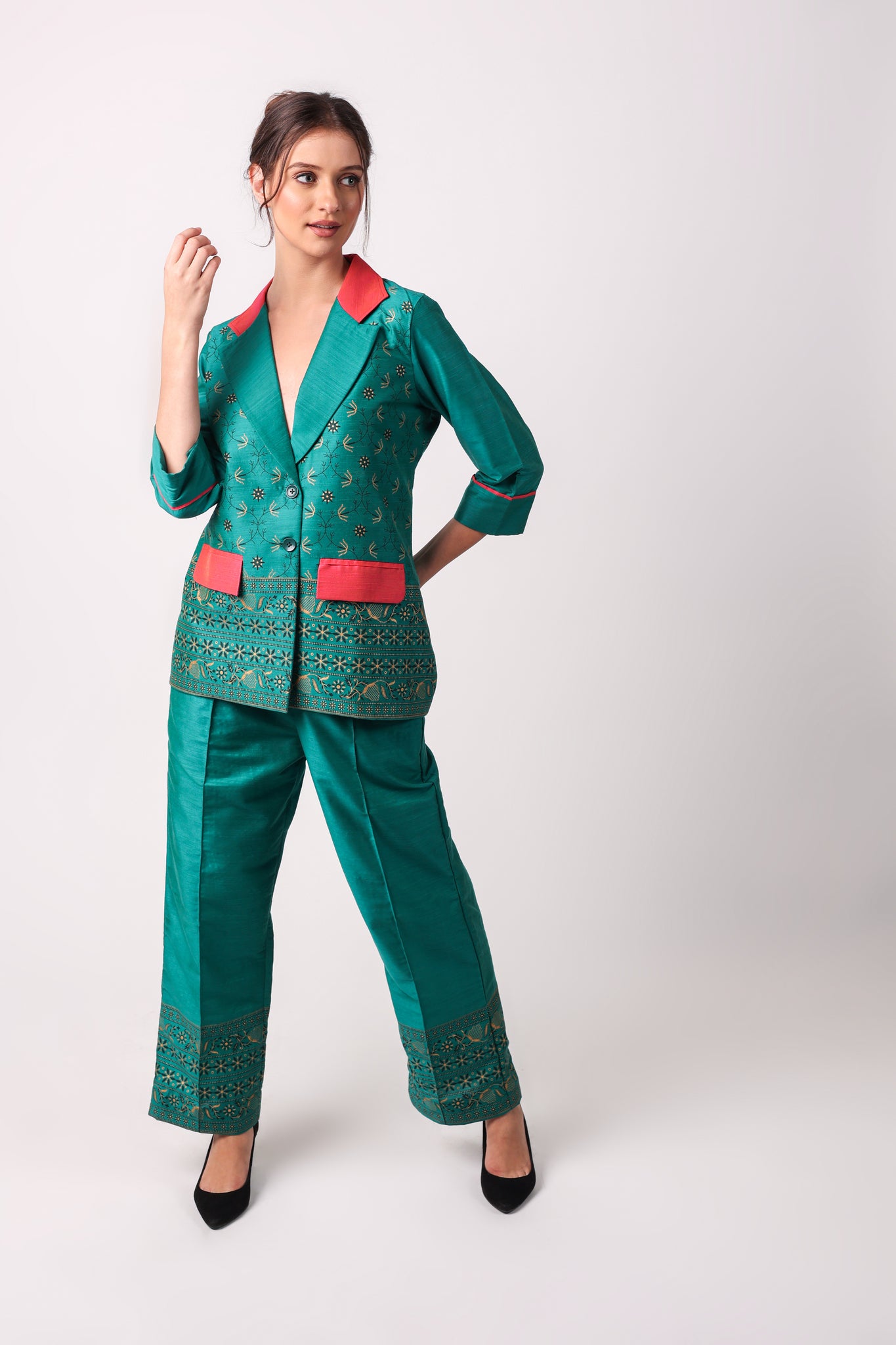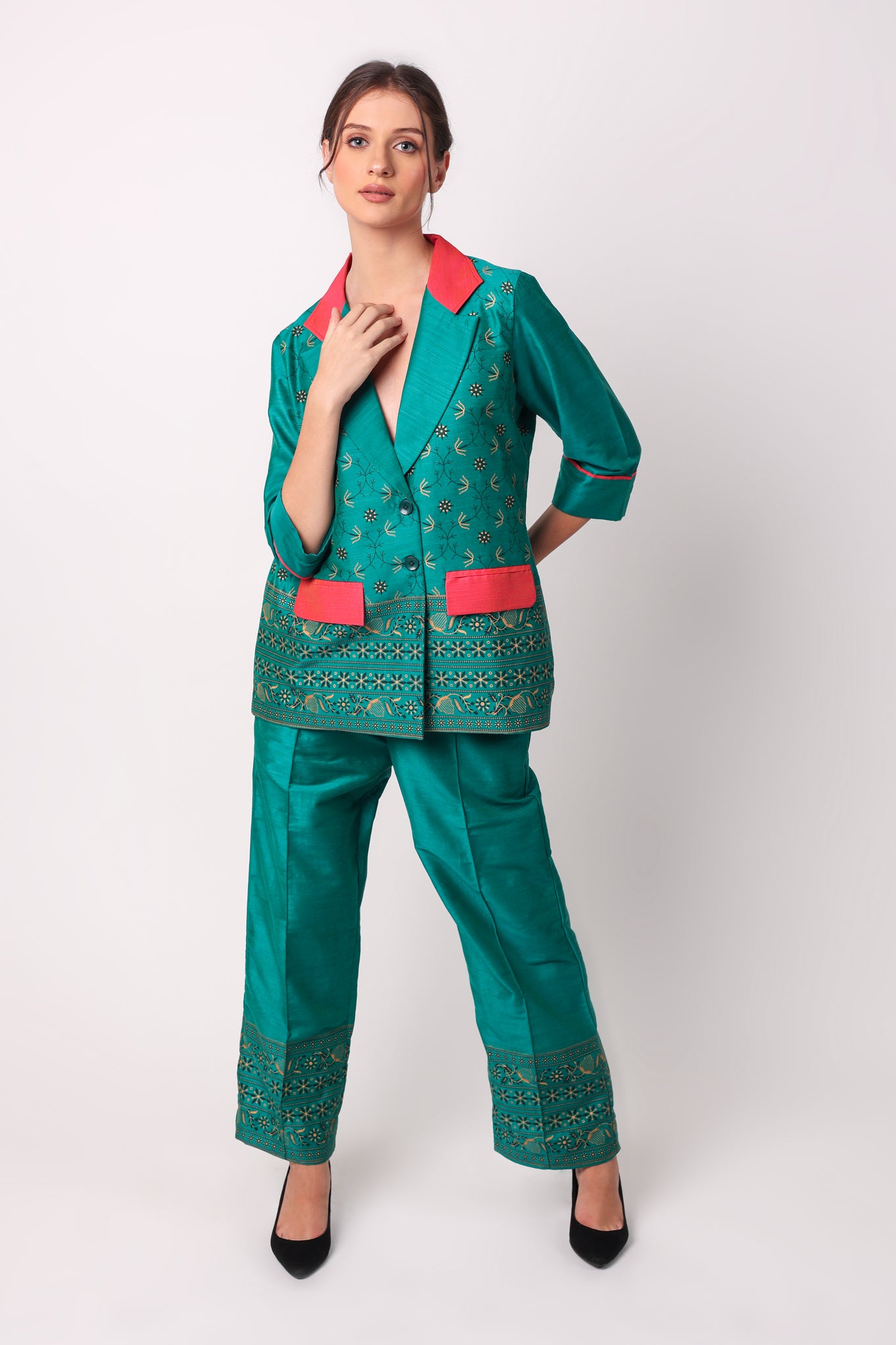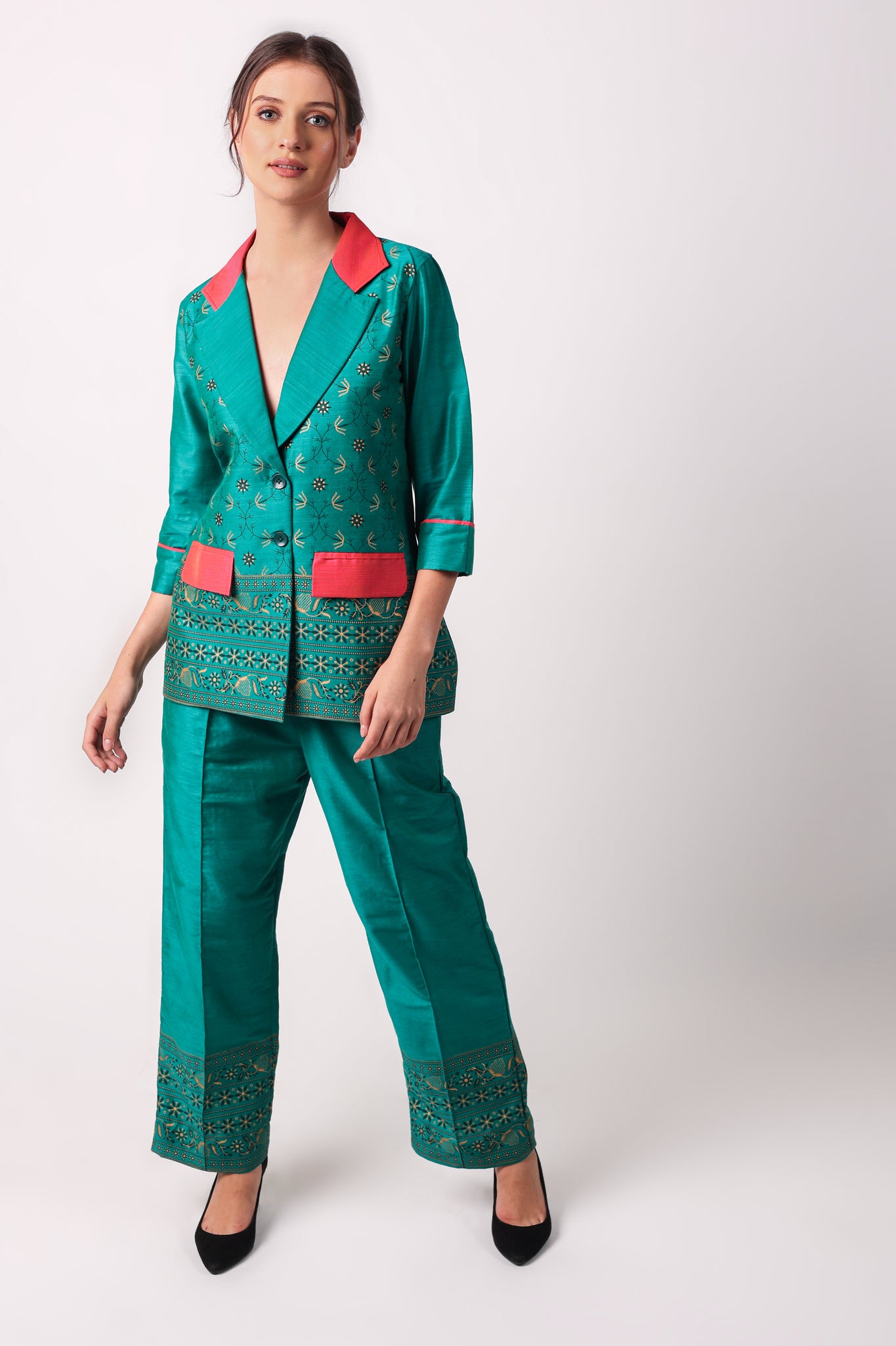 YOU WILL STAND OUT FROM THE CROWD WEARING OUR STATEMENT COORD SETS. MAKE THOSE HEADS TURN BY WEARING THIS EXQUISITELY CRAFTED COTTON BLAZER AND STRAIGHT PANTS. THE COLOUR COMBINATION MAKES IT AN ADD ON TO YOUR STYLE STATEMENT.