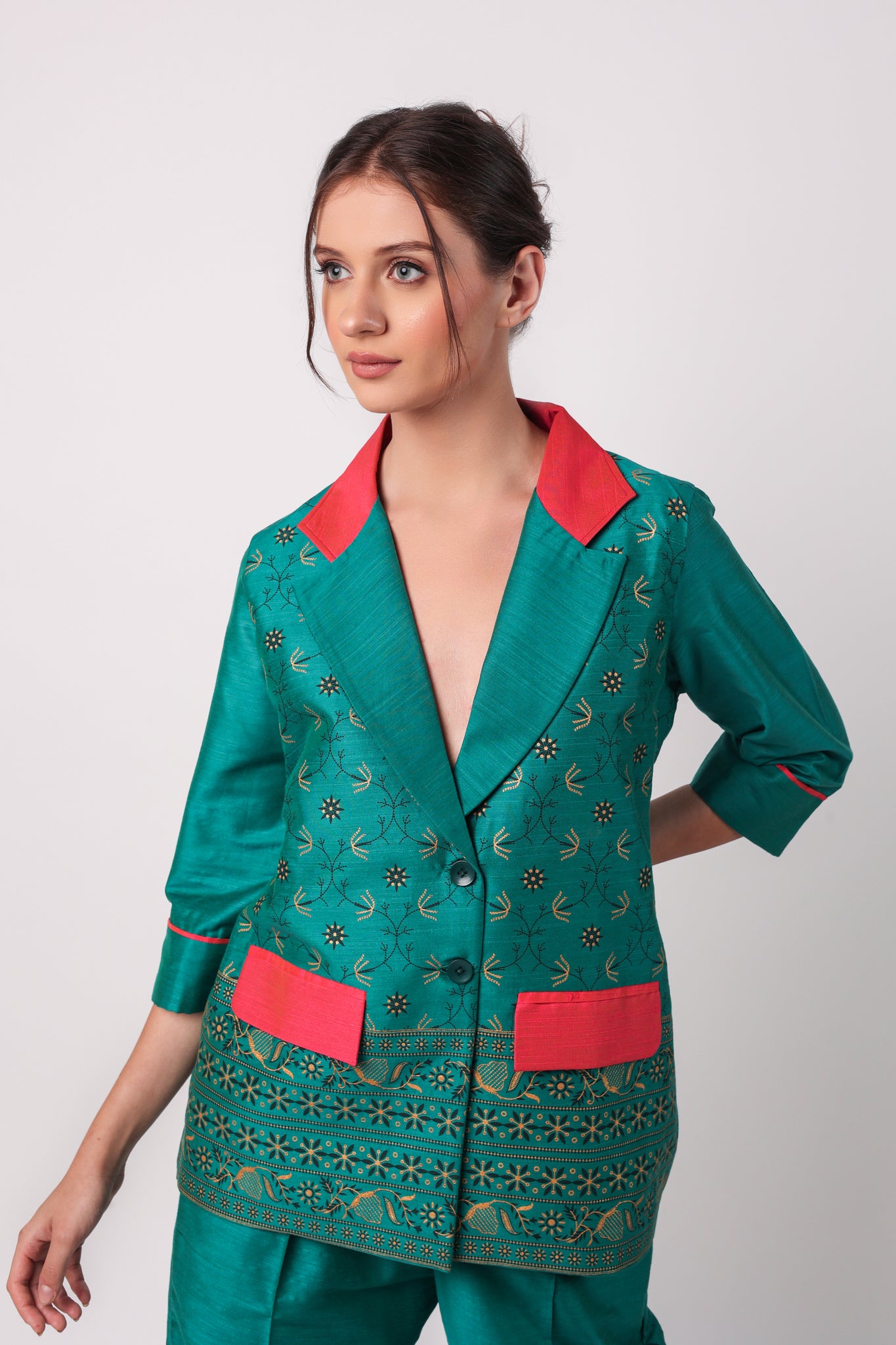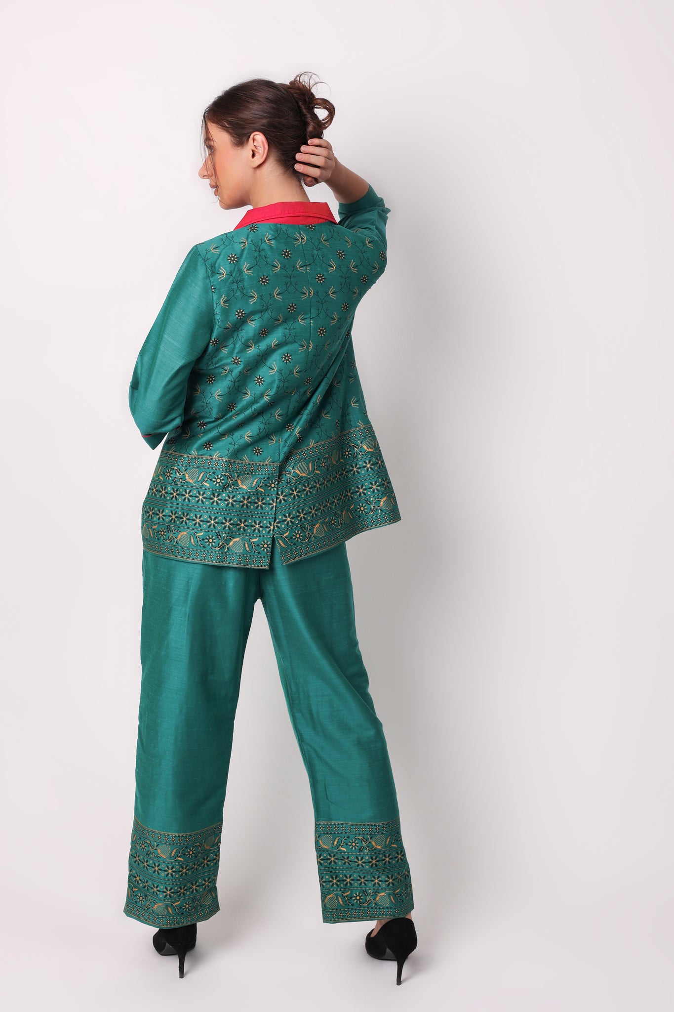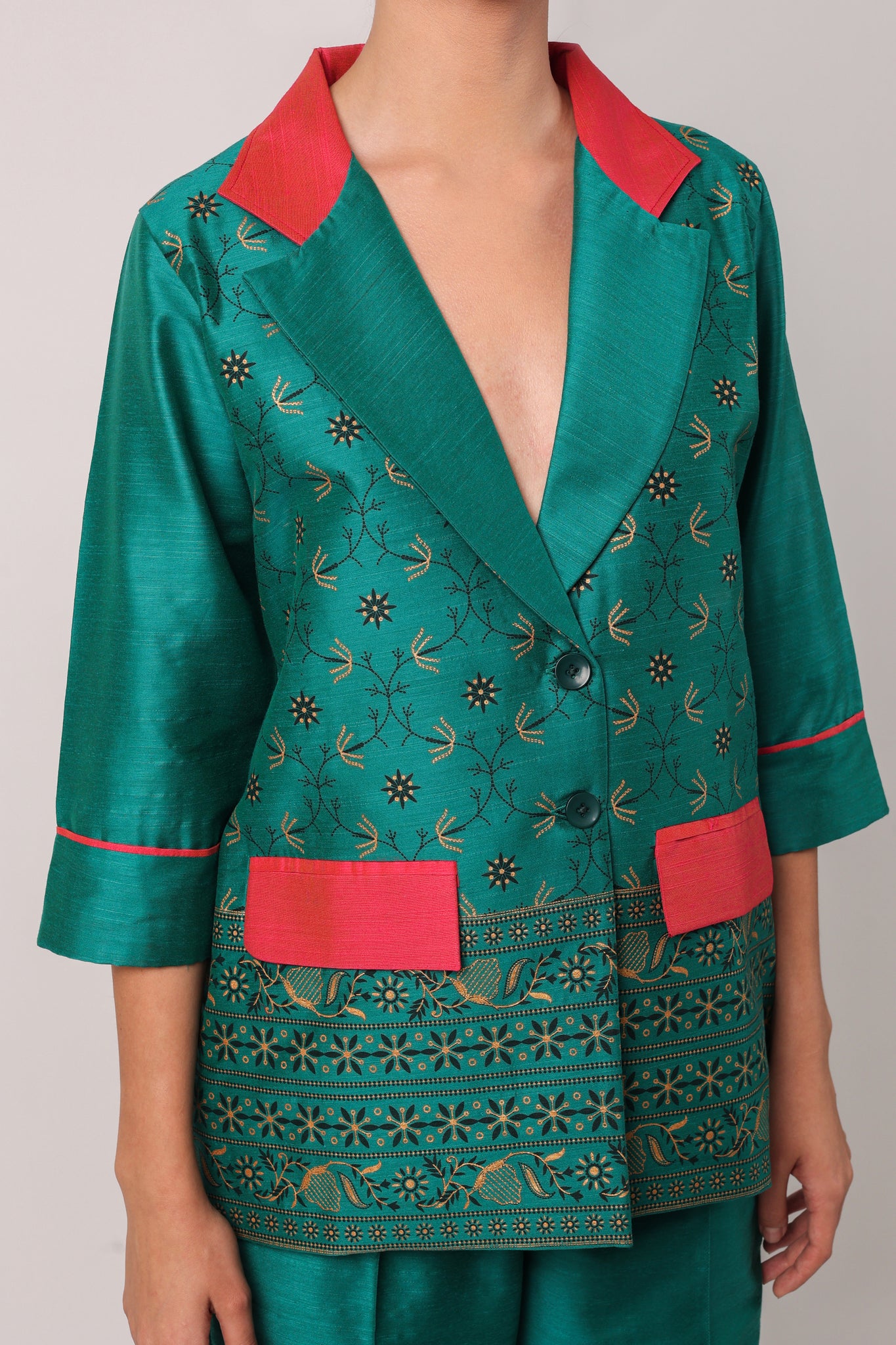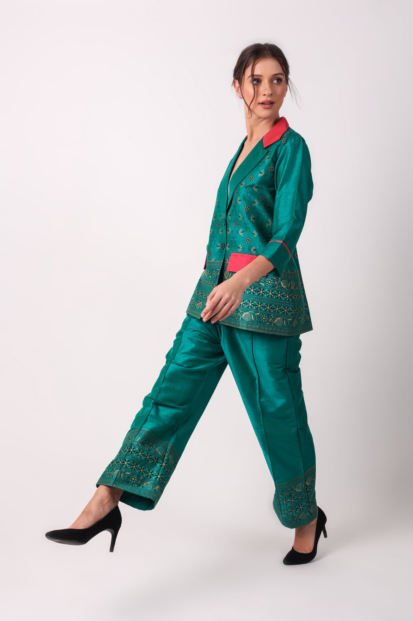 YOU WILL STAND OUT FROM THE CROWD WEARING OUR STATEMENT COORD SETS. MAKE THOSE HEADS TURN BY WEARING THIS EXQUISITELY CRAFTED COTTON BLAZER AND STRAIGHT PANTS. THE COLOUR COMBINATION MAKES IT AN ADD ON TO YOUR STYLE STATEMENT.