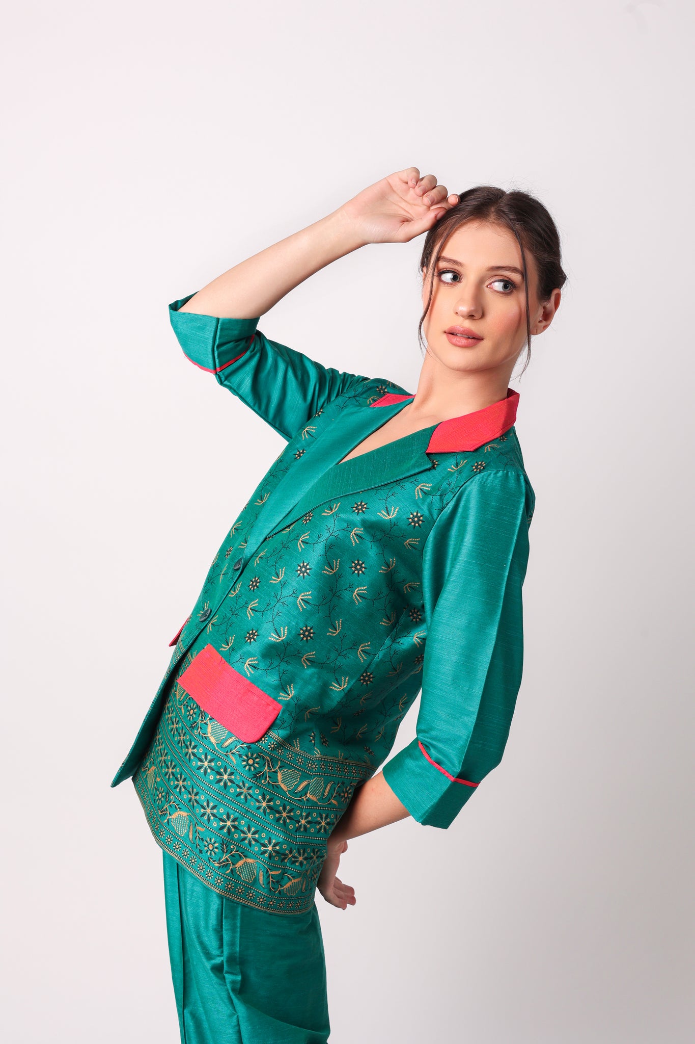 YOU WILL STAND OUT FROM THE CROWD WEARING OUR STATEMENT COORD SETS. MAKE THOSE HEADS TURN BY WEARING THIS EXQUISITELY CRAFTED COTTON BLAZER AND STRAIGHT PANTS. THE COLOUR COMBINATION MAKES IT AN ADD ON TO YOUR STYLE STATEMENT....Read more