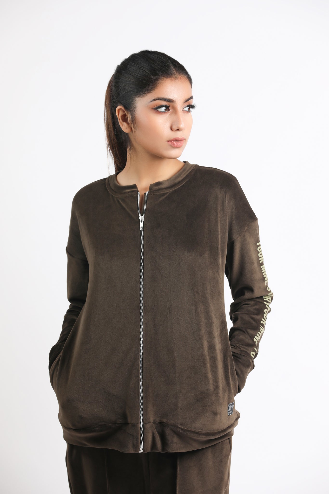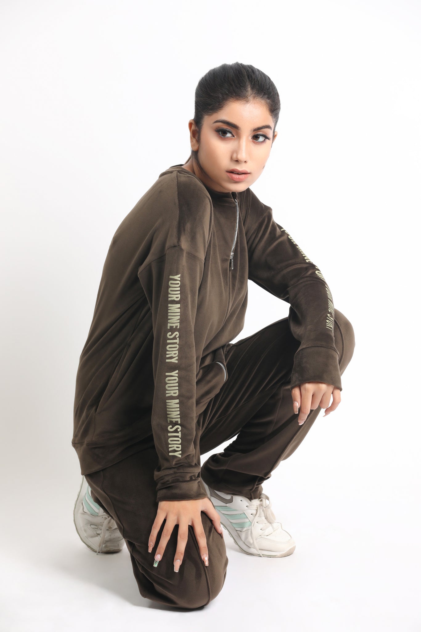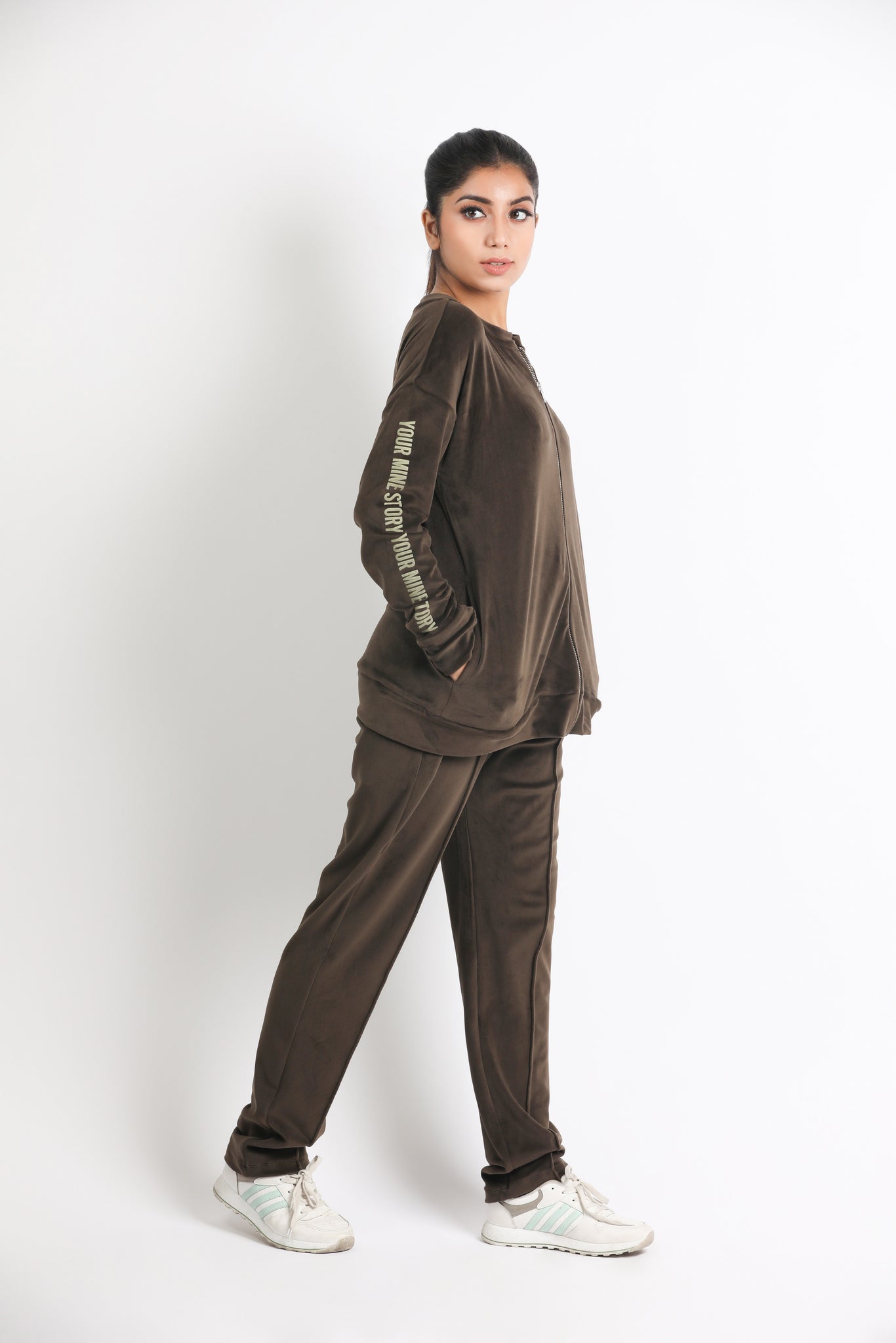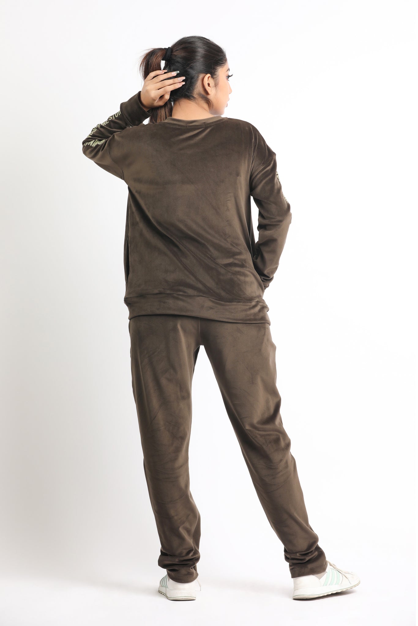 This Dark Olive Travel Set curated in Velvet lycra with a beautiful print detailing on the sleeves is a perfect easy go outfit for cozy winters.