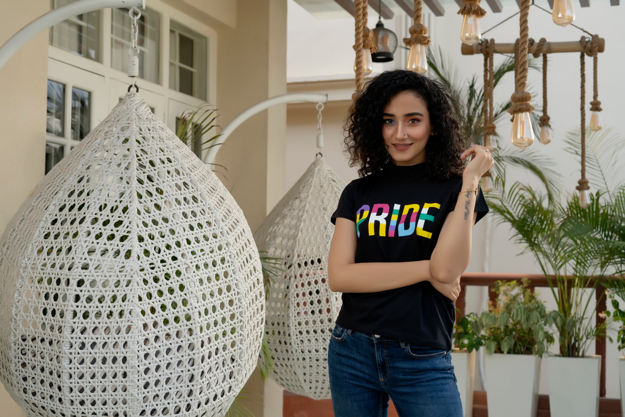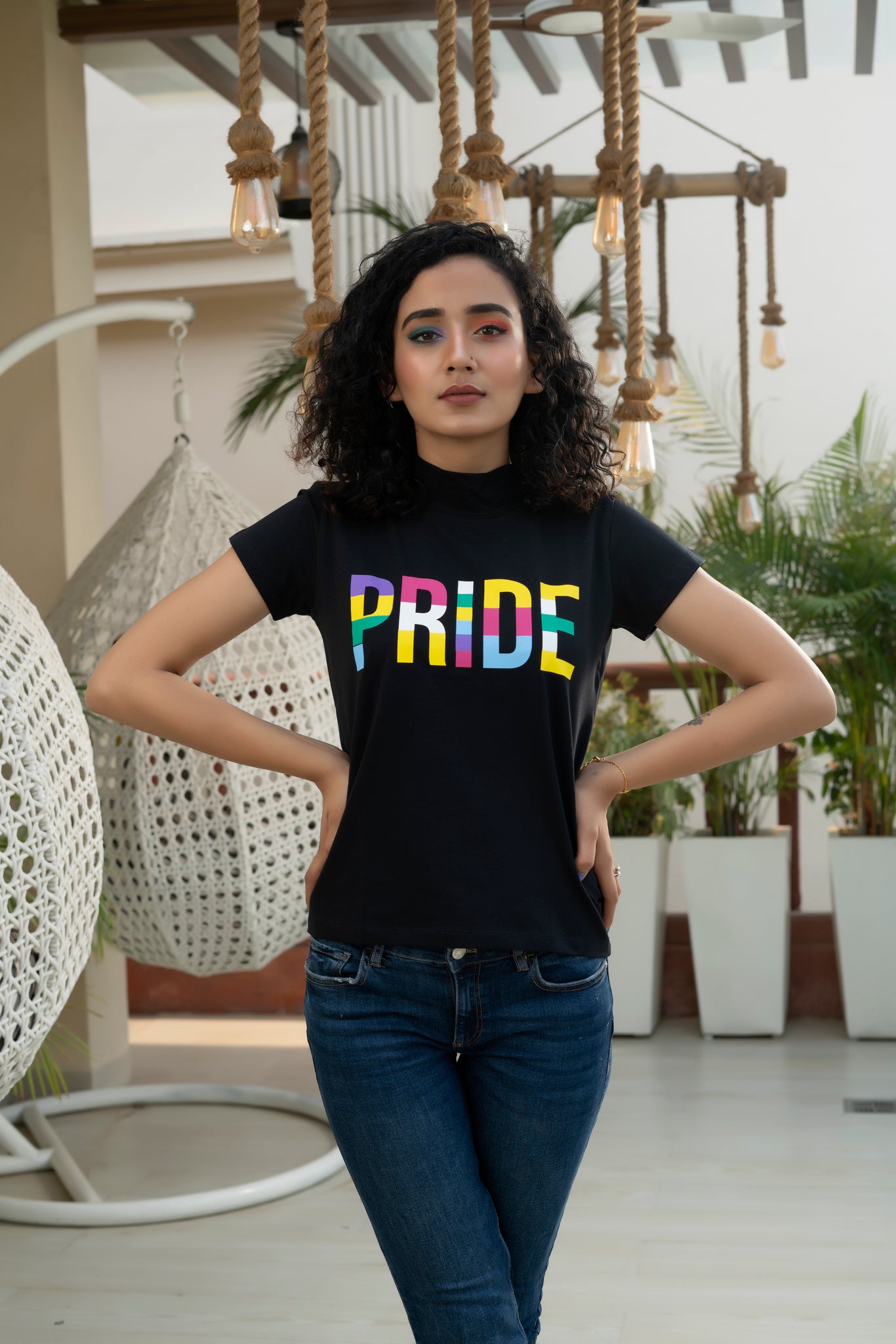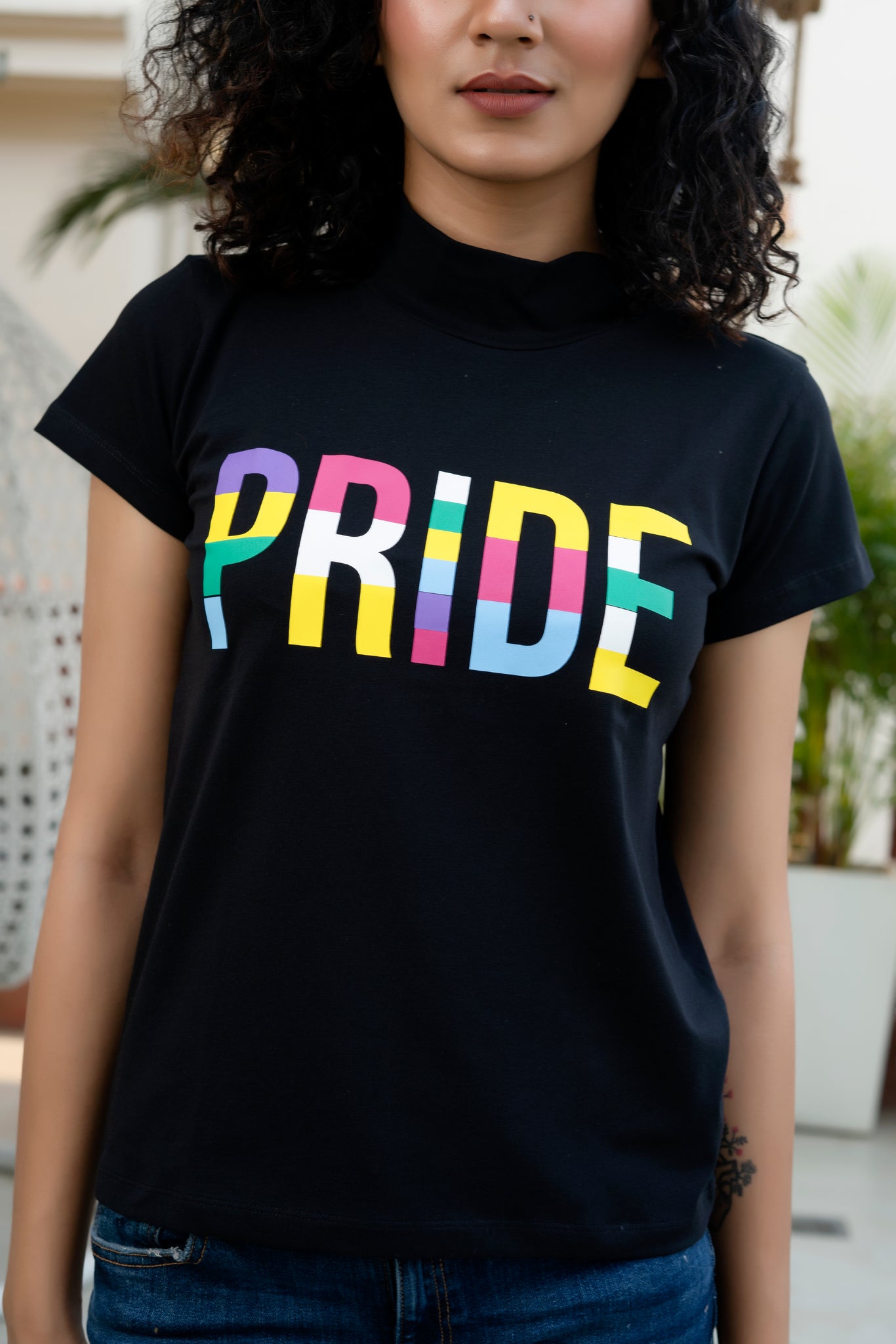 Slay your everyday Casual wear with this PRIDE printed Black tshirt featuring turtle neck. Style it up with a good pair of denims and you are ready to go.