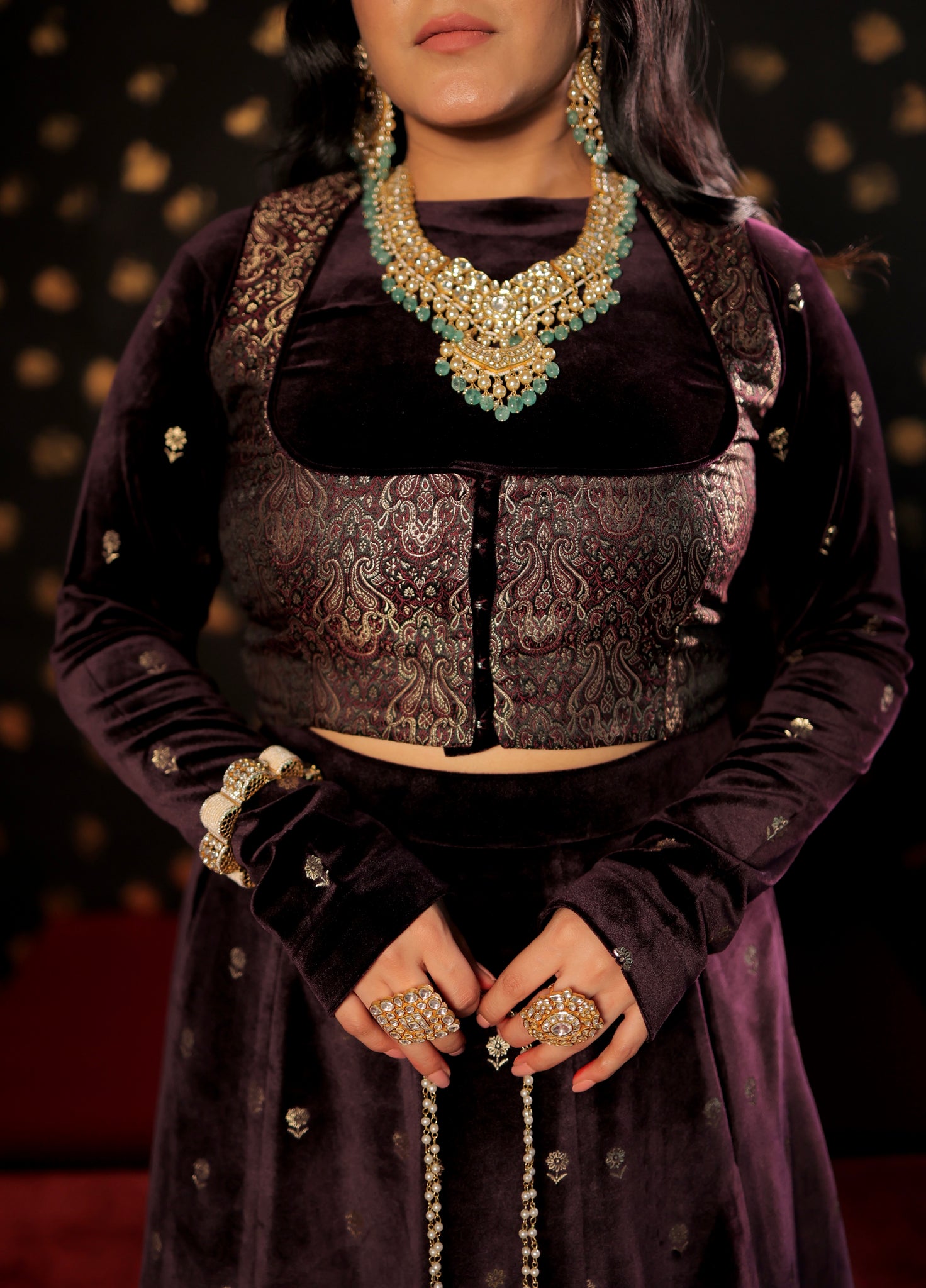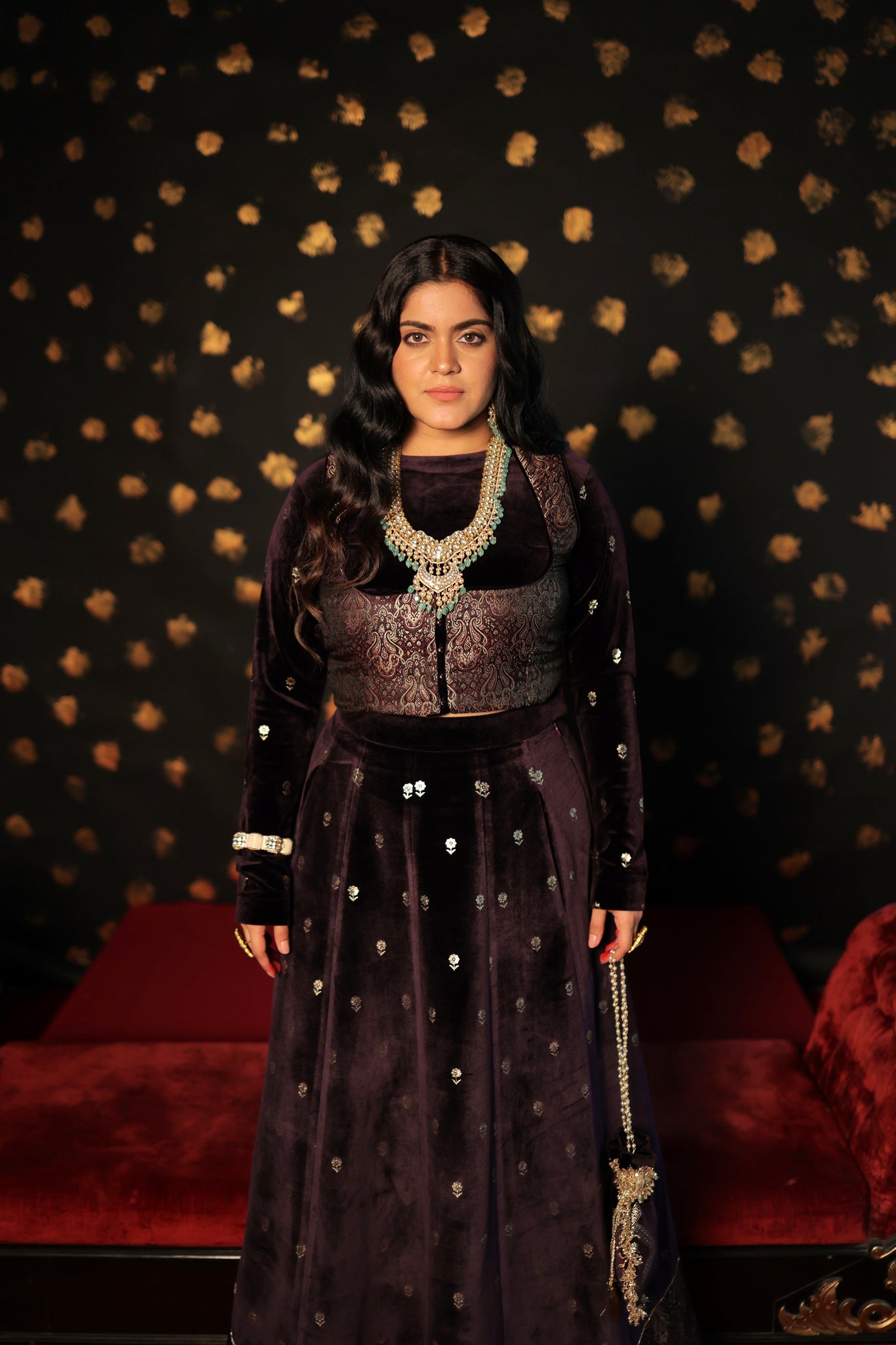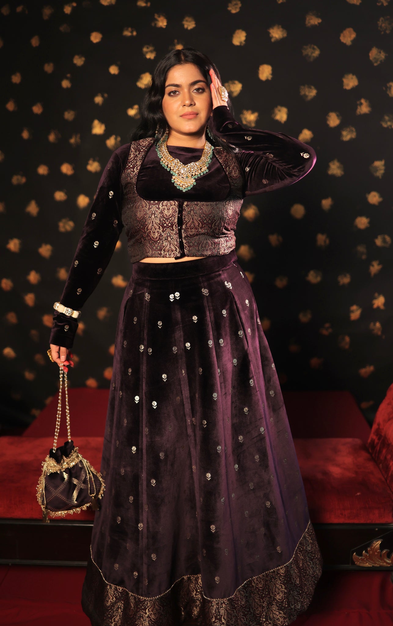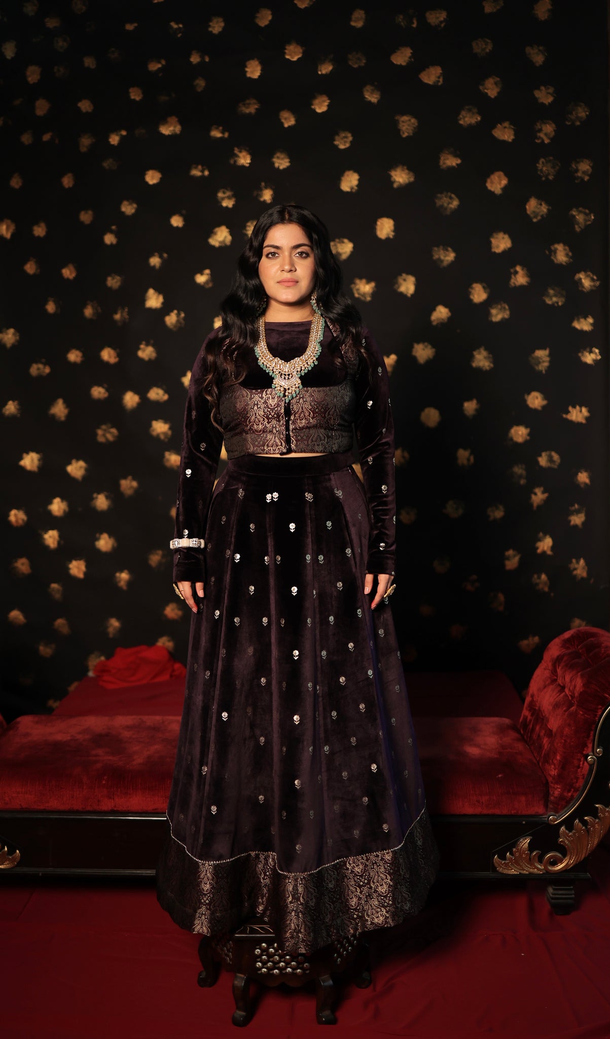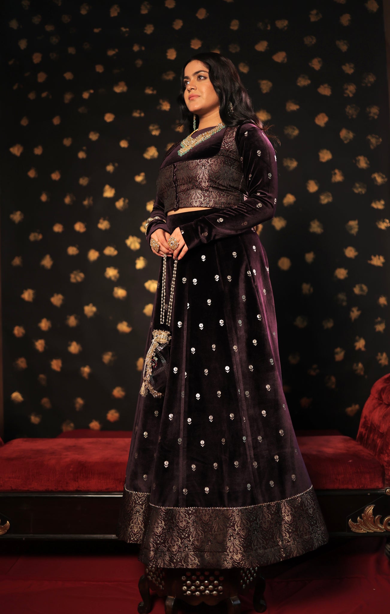 This three-piece wine velvet skirt set showcases intricate print details on both the blouse and skirt, complemented by elegant brocade jacket detailing. It is an ideal choice for wedding functions, as the brocade blouse jacket enhances the overall grace of the silhouette. Make a statement at your next wedding with this exquisite velvet skirt set.