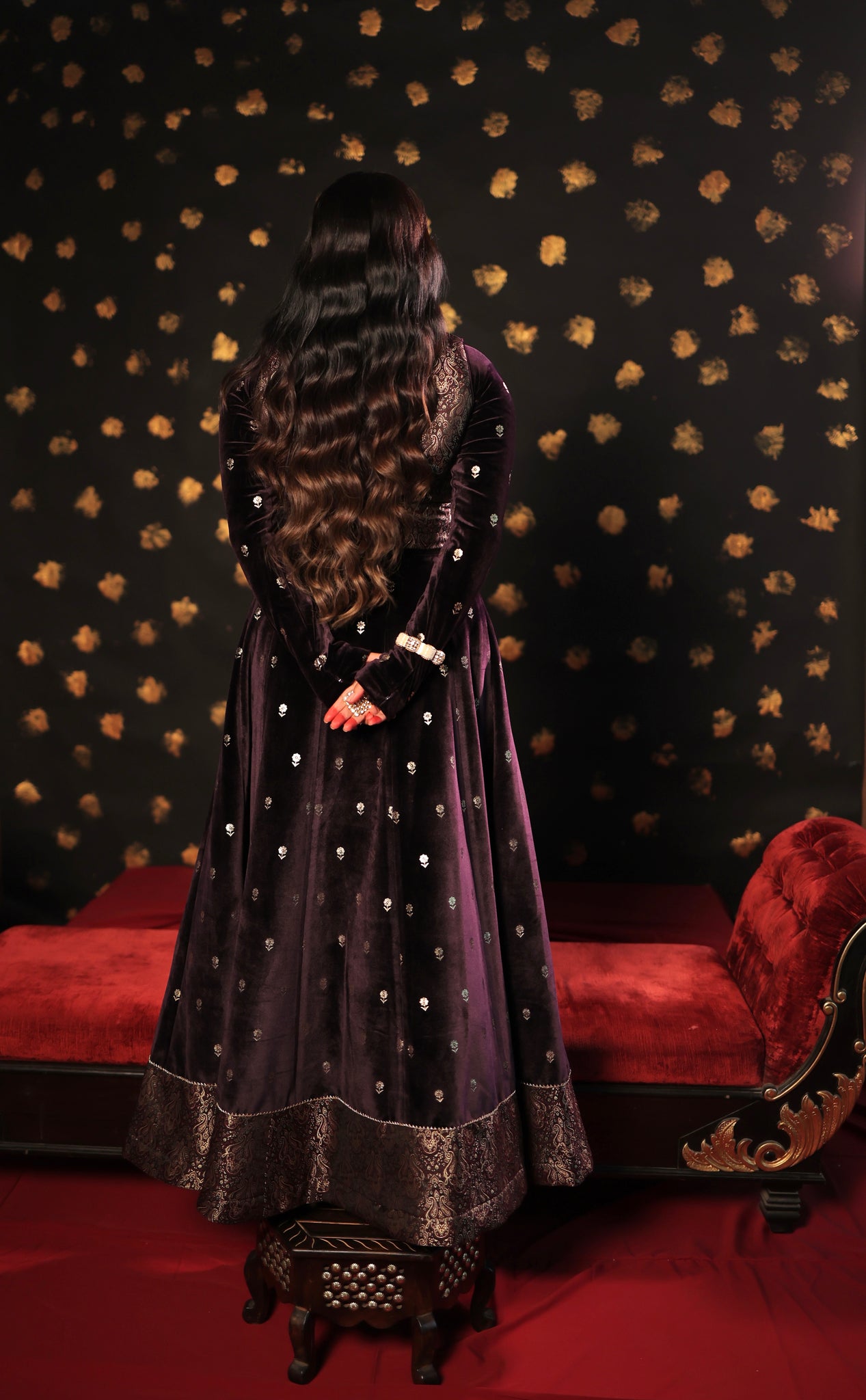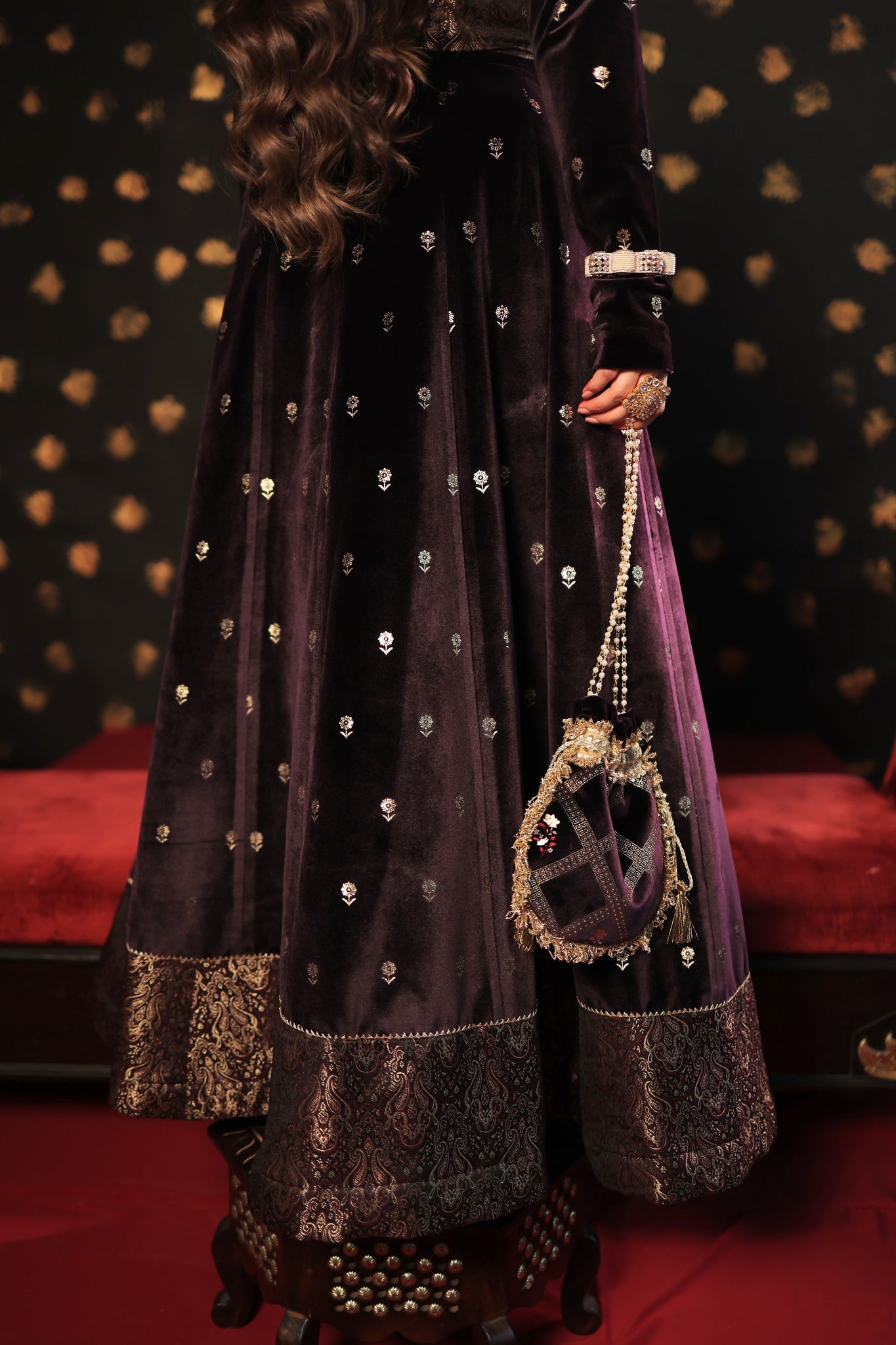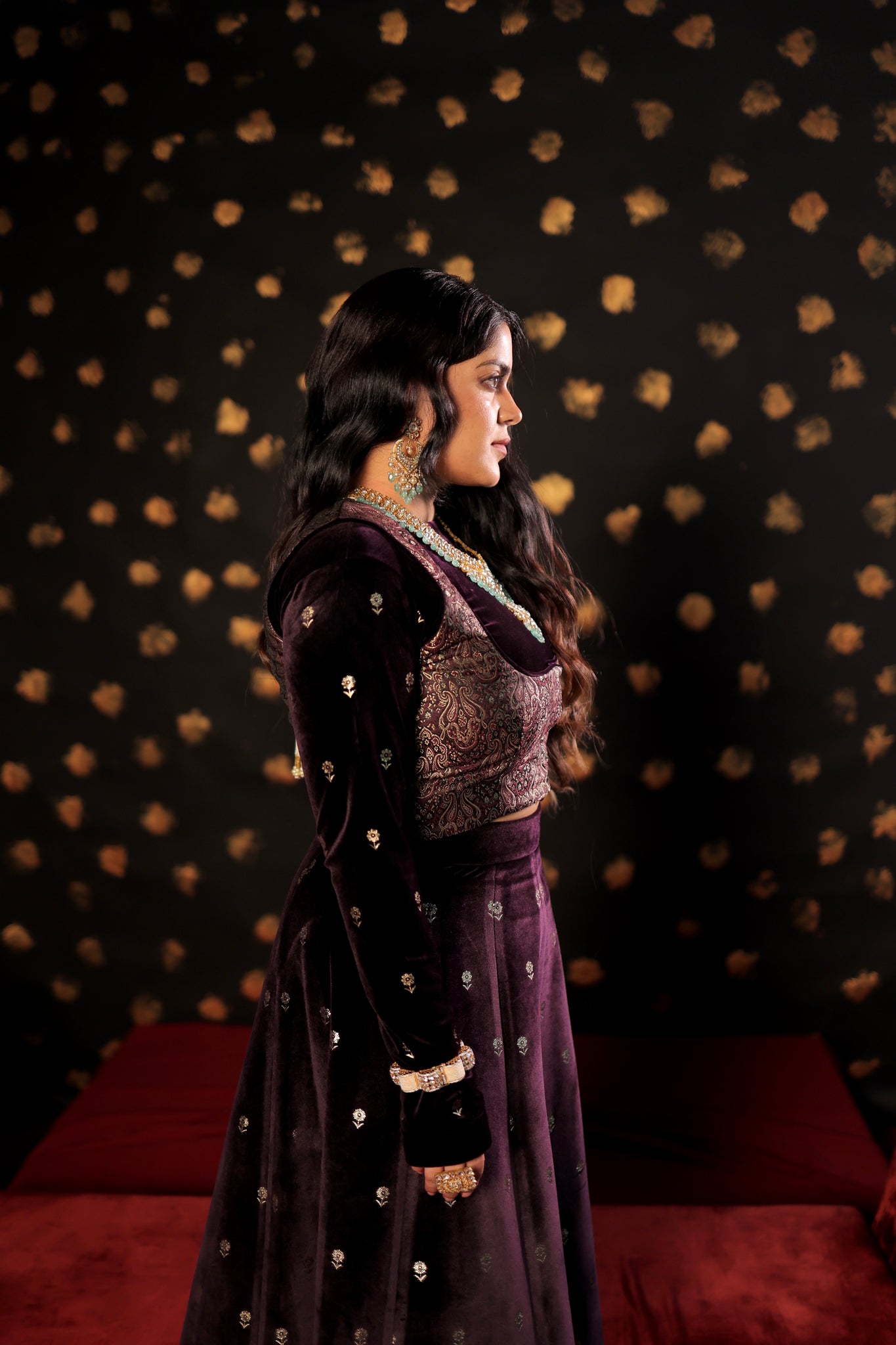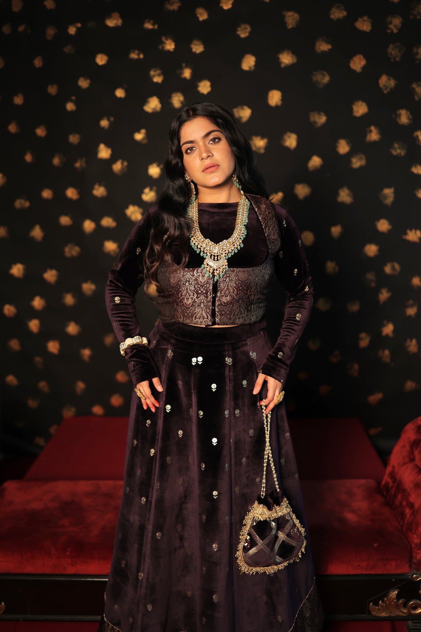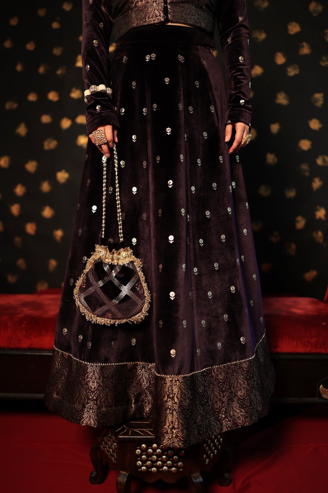 This three-piece wine velvet skirt set showcases intricate print details on both the blouse and skirt, complemented by elegant brocade jacket detailing. It is an ideal choice for wedding functions, as the brocade blouse jacket enhances the overall grace of the silhouette. Make a statement at your next wedding with this exquisite velvet skirt set.