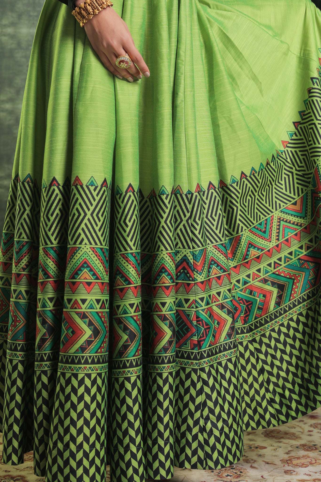 This exquisitely designed ethnic long skirt with pockets and an elastic waist belt exudes a festive feeling. Wear it with traditional jewellery to achieve an Indo-Western look. In terms of fashion, traditional long skirts are making its comeback!...Read more