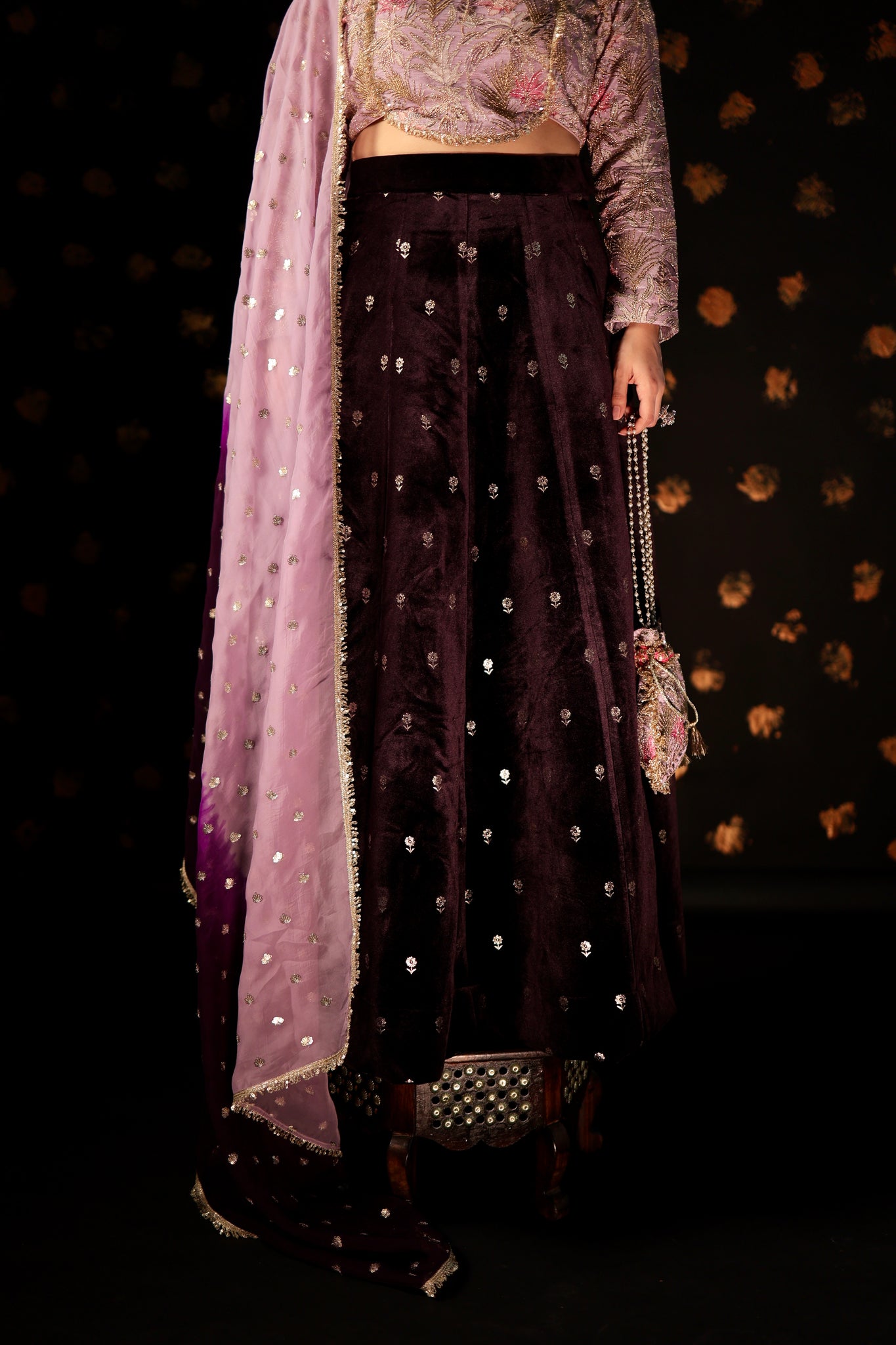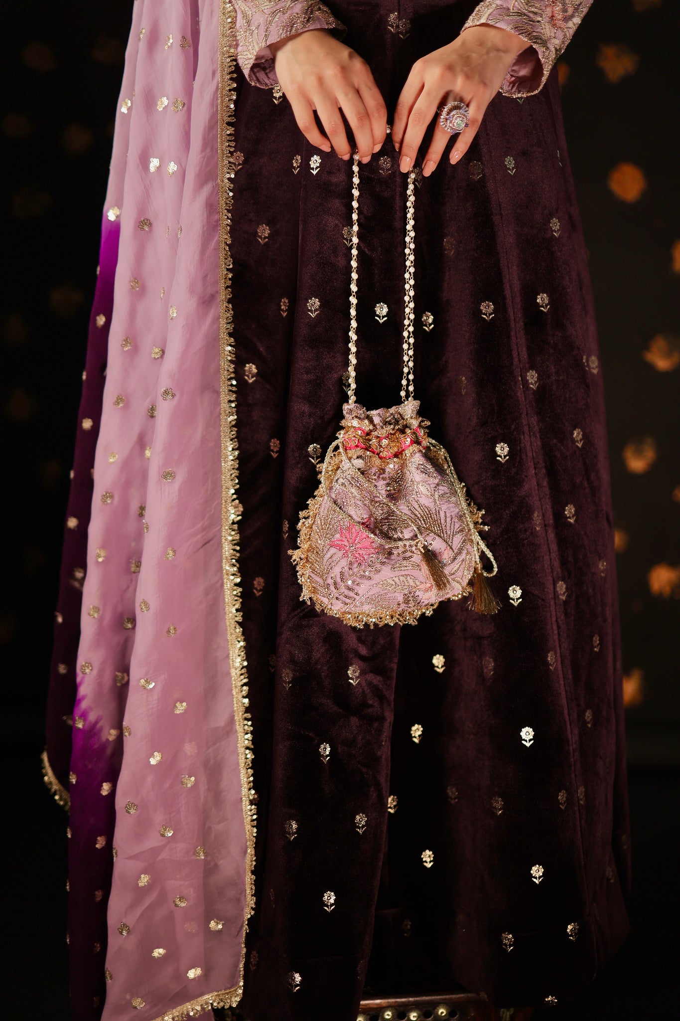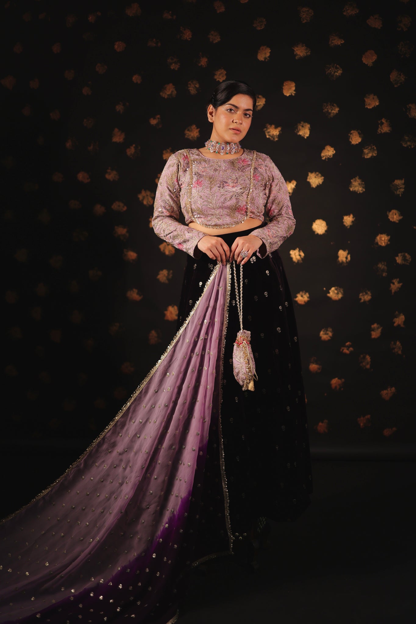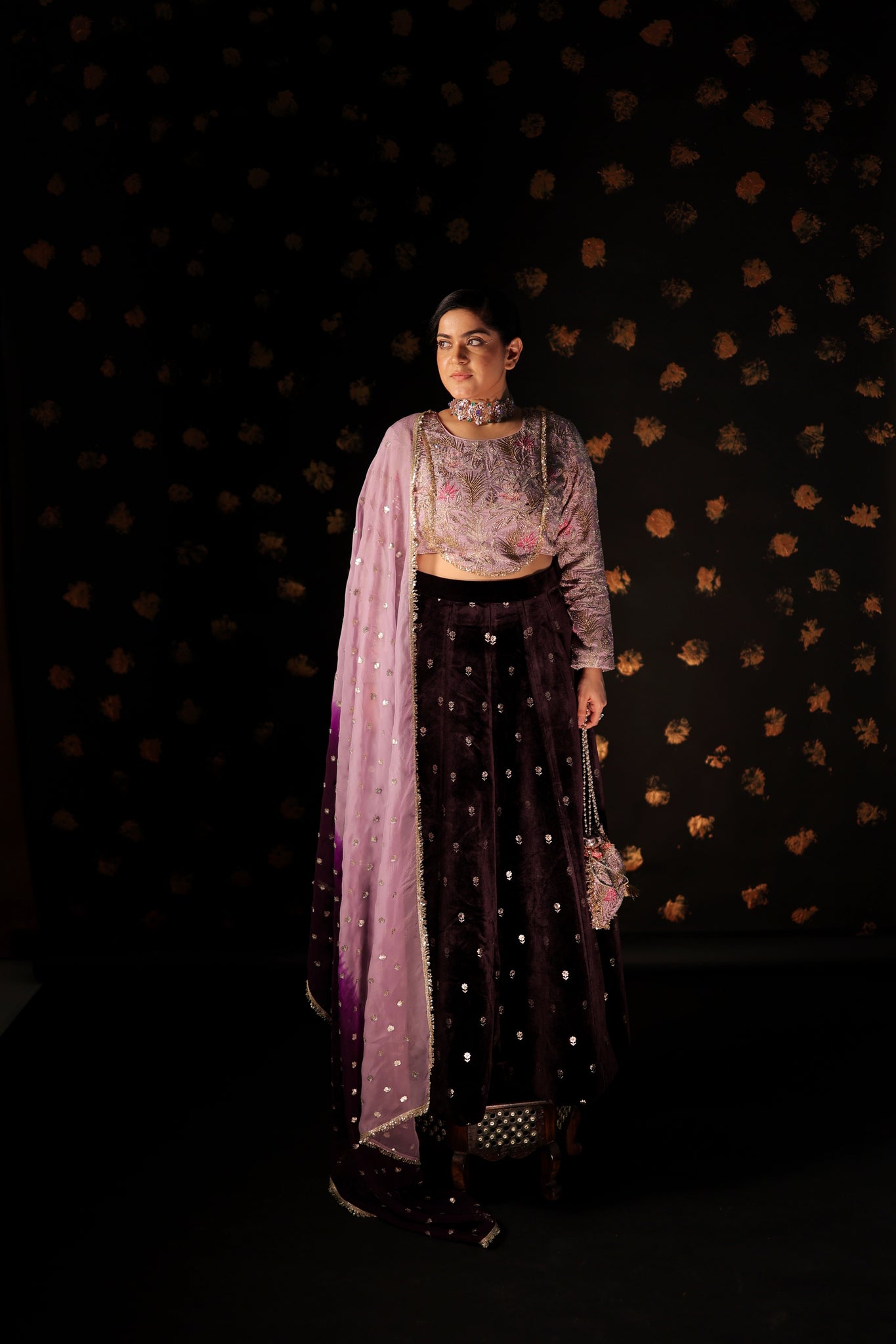 The Lavender tonal embroidered blouse, when combined with a foil printed WINE velvet skirt and ombre dupatta, serves as an ideal enhancement to a festive wardrobe, making it suitable for both trousseau and wedding attire. The Blouse enhances the overall silhouette of the Look. Complete your look with our specially curated Festive POTLI.