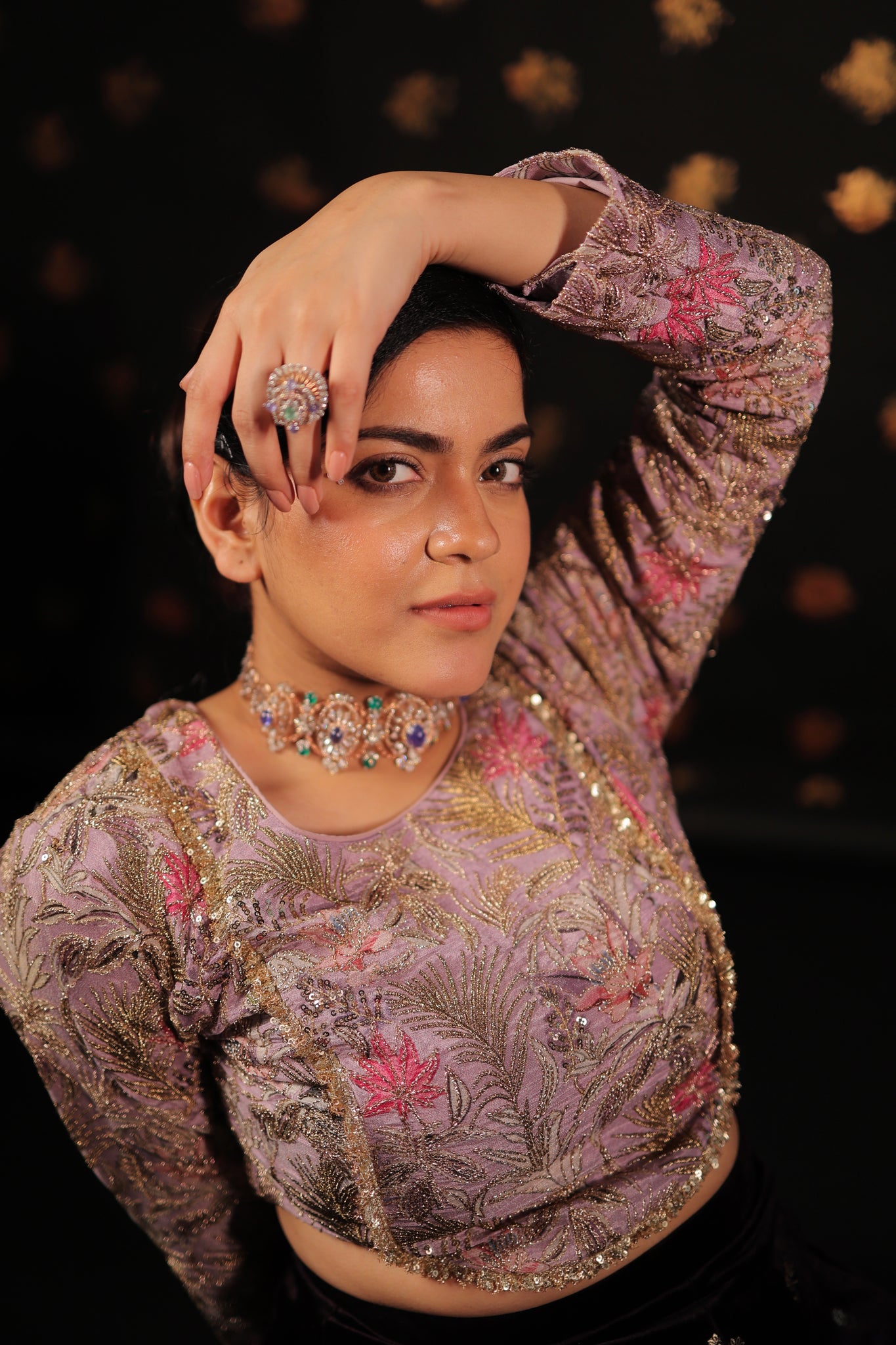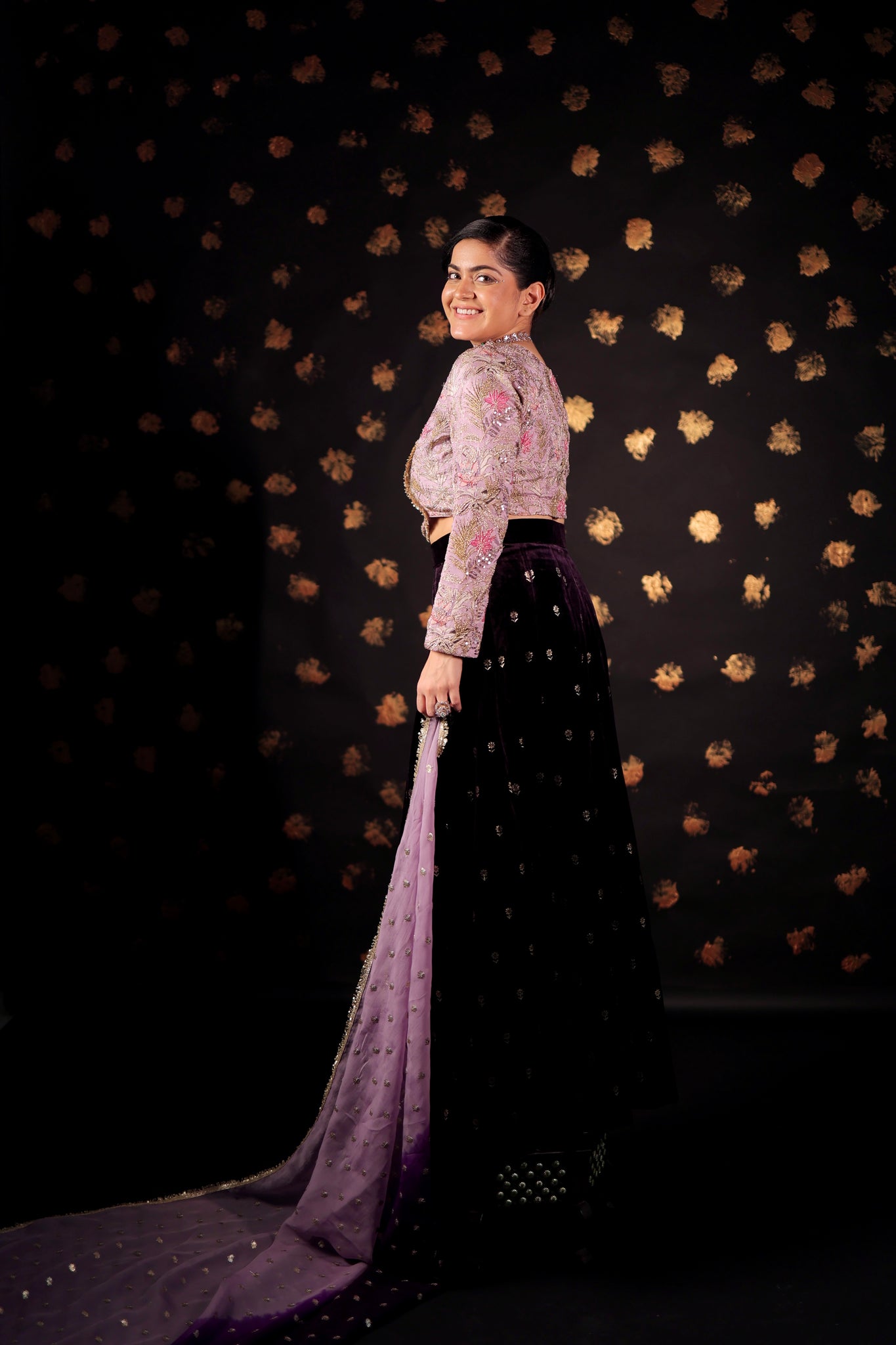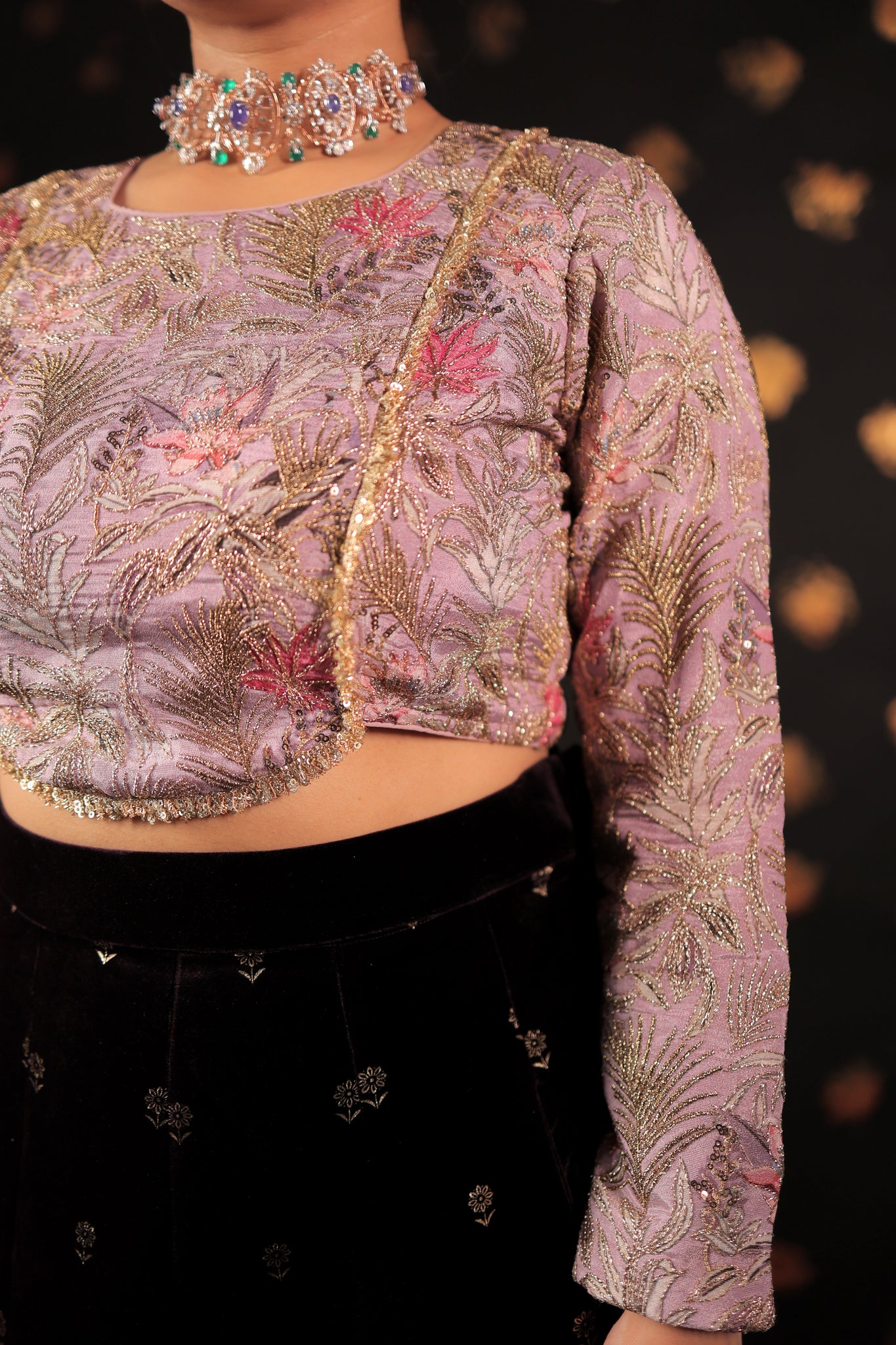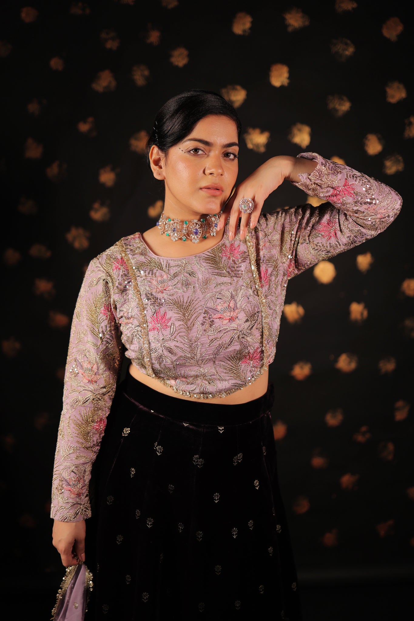 The Lavender tonal embroidered blouse, when combined with a foil printed WINE velvet skirt and ombre dupatta, serves as an ideal enhancement to a festive wardrobe, making it suitable for both trousseau and wedding attire. The Blouse enhances the overall silhouette of the Look. Complete your look with our specially curated Festive POTLI.