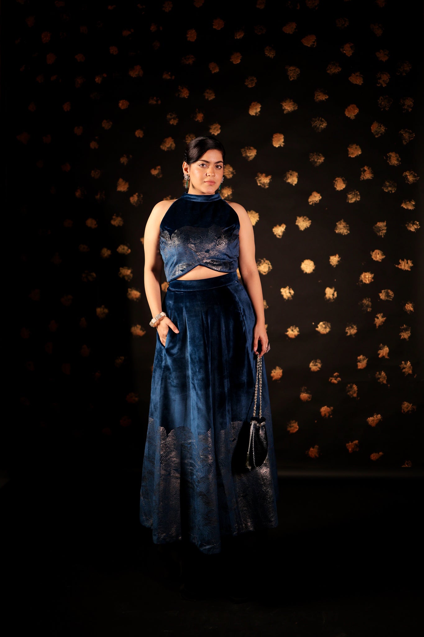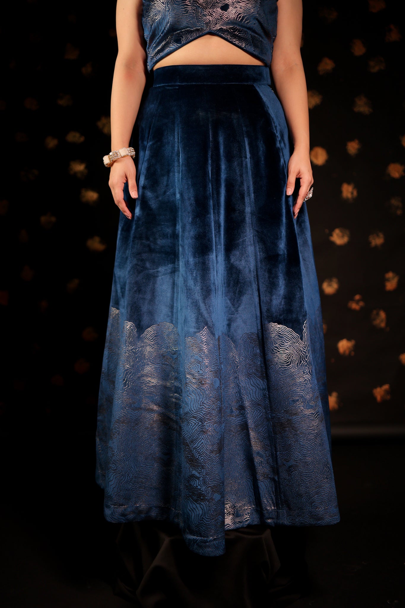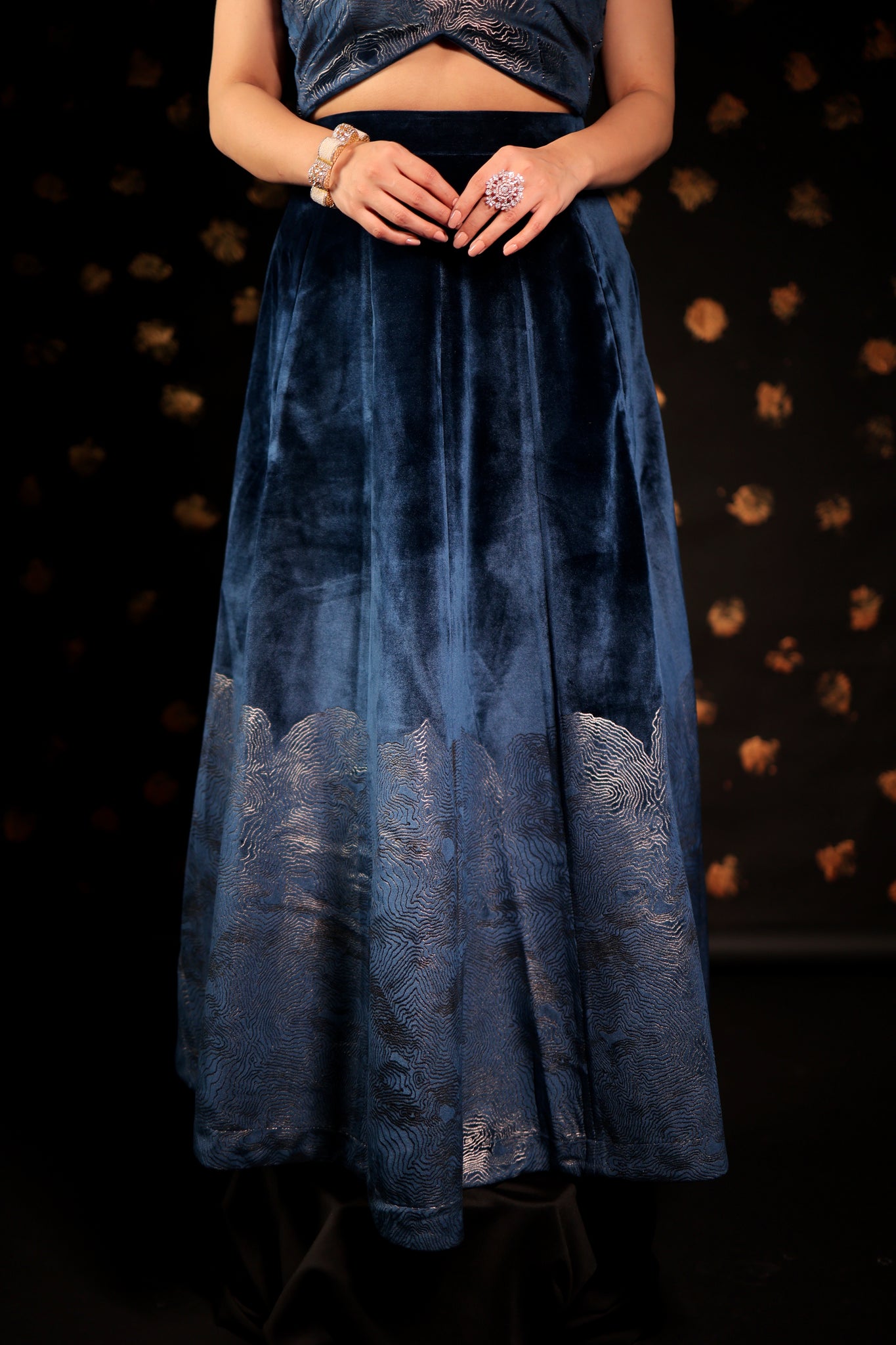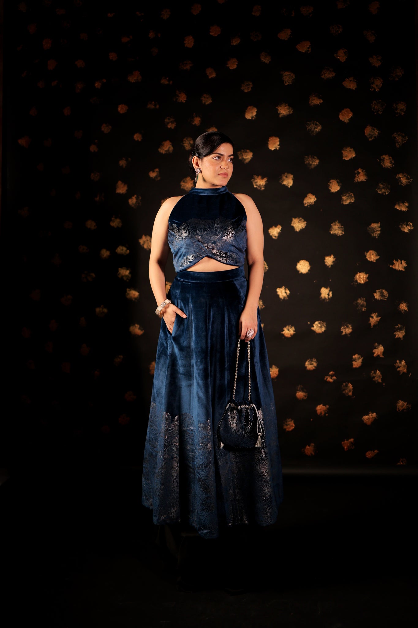 This CLASSIC Long velvet skirt Set features pockets and foil print embellishments. With intricate designs, these skirts are perfect for making a statement at parties and cocktail events. Complete your Look with our specially curated Festive POTLI .