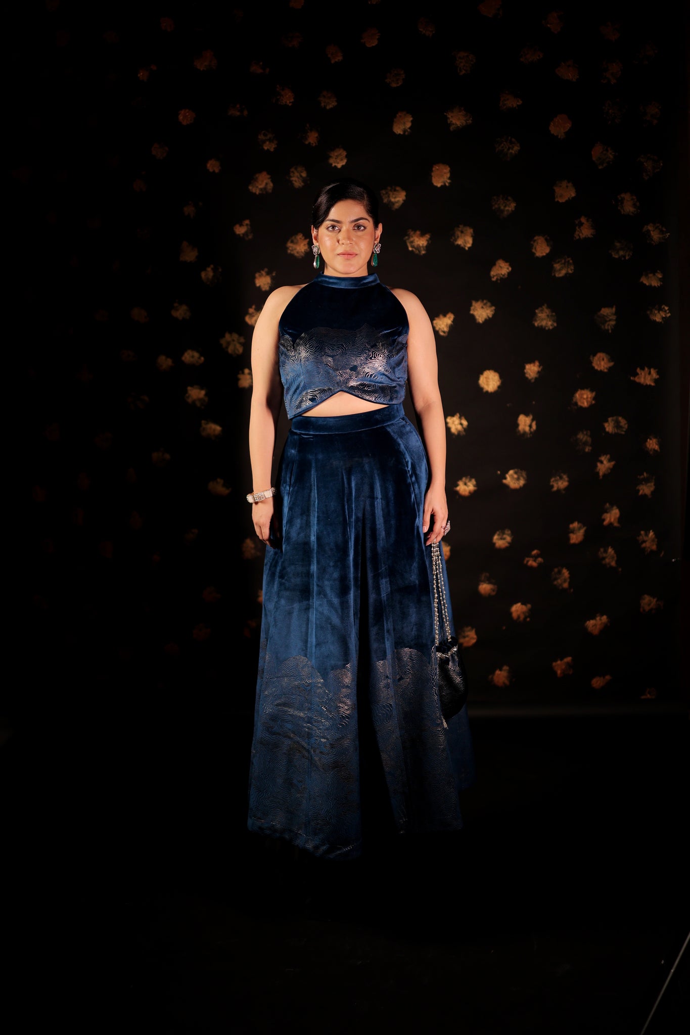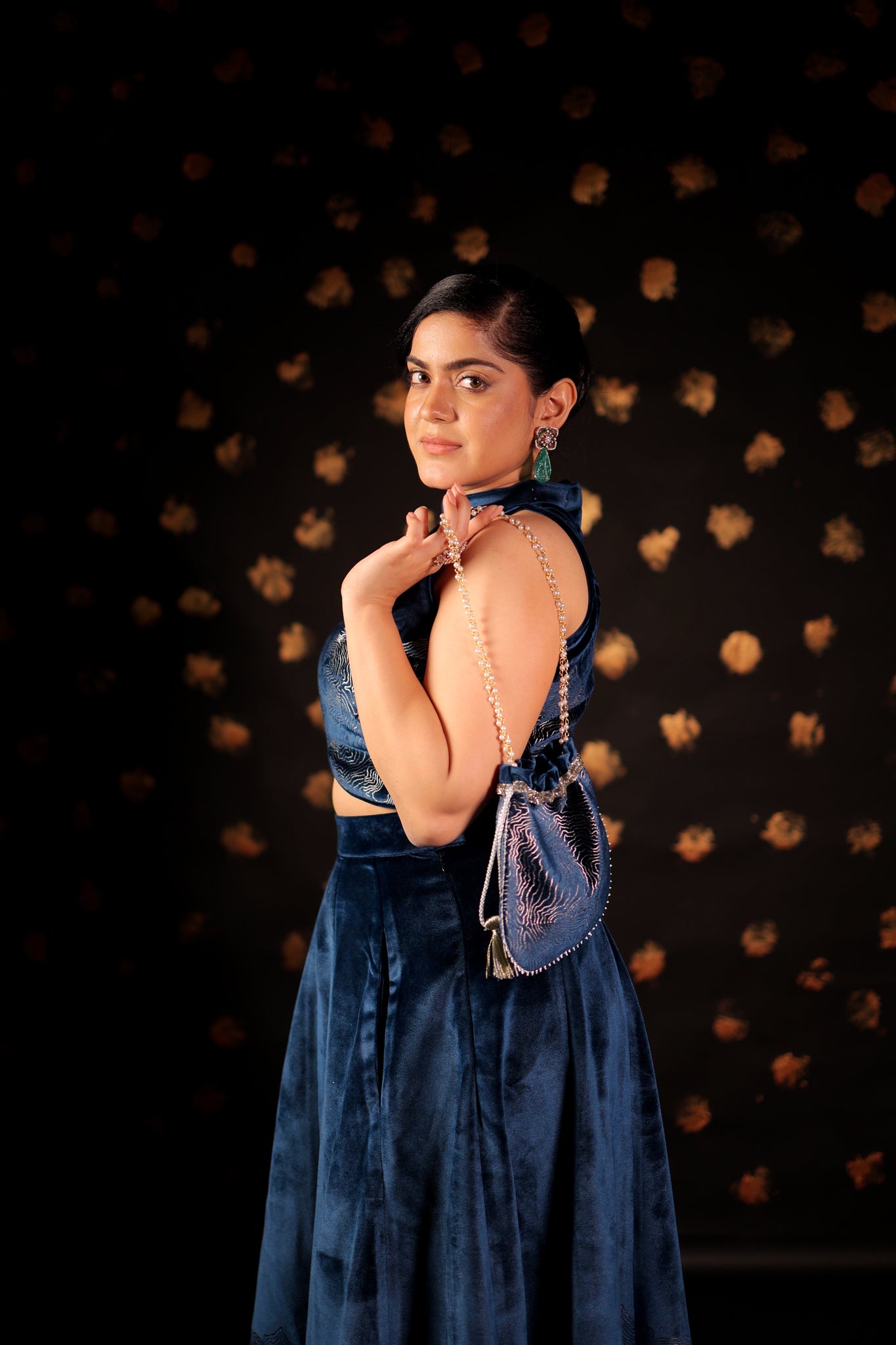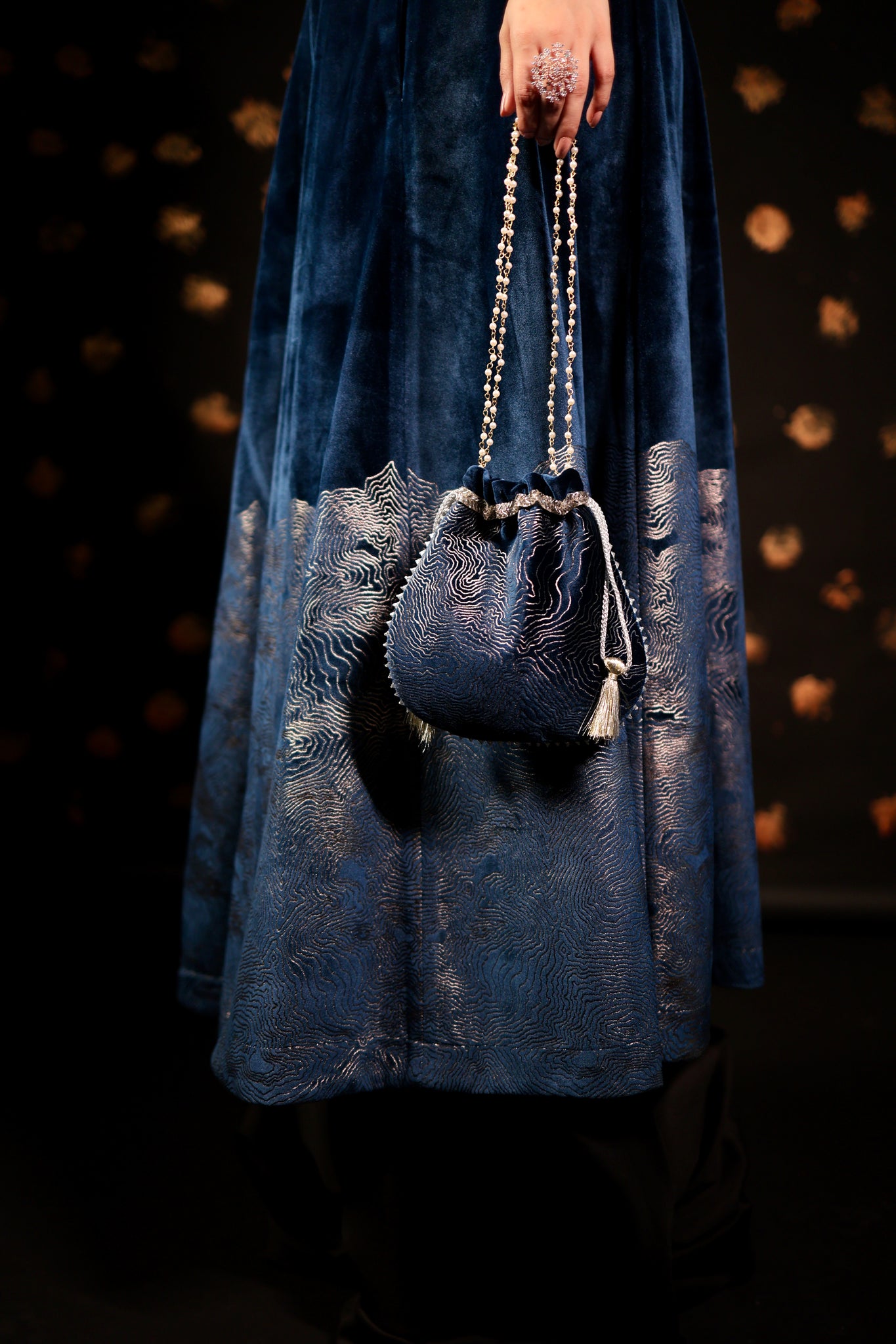 This CLASSIC Long velvet skirt Set features pockets and foil print embellishments. With intricate designs, these skirts are perfect for making a statement at parties and cocktail events. Complete your Look with our specially curated Festive POTLI .
