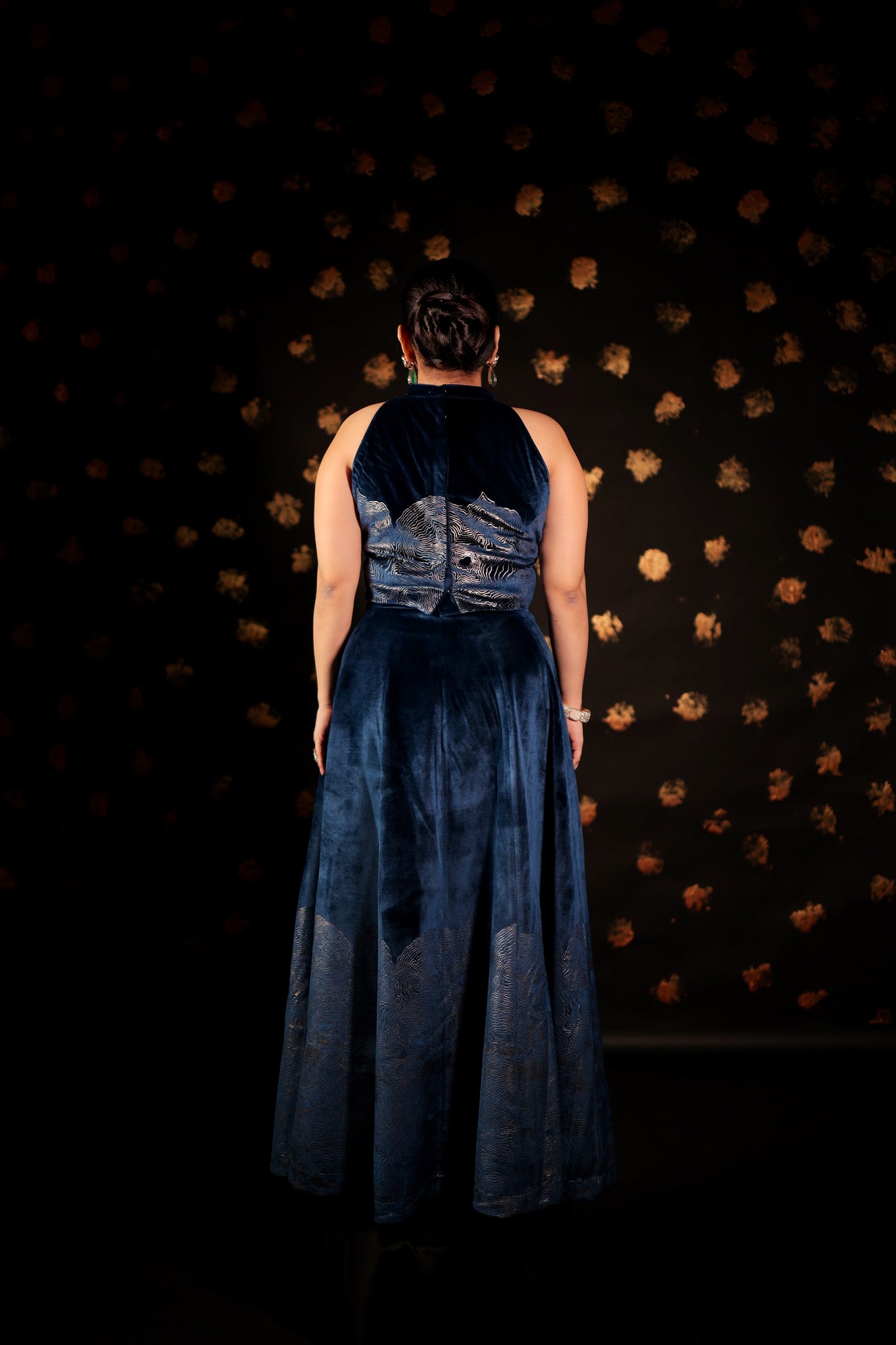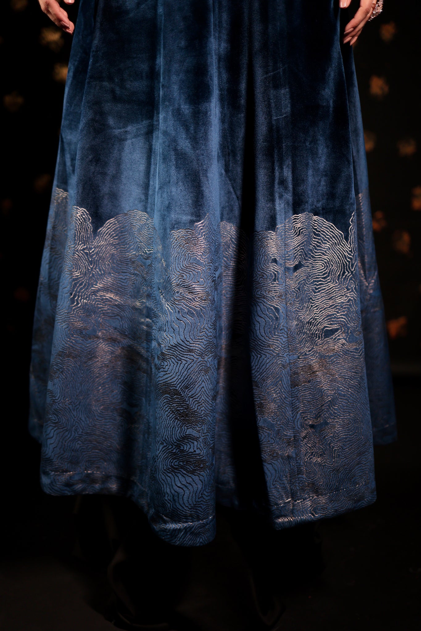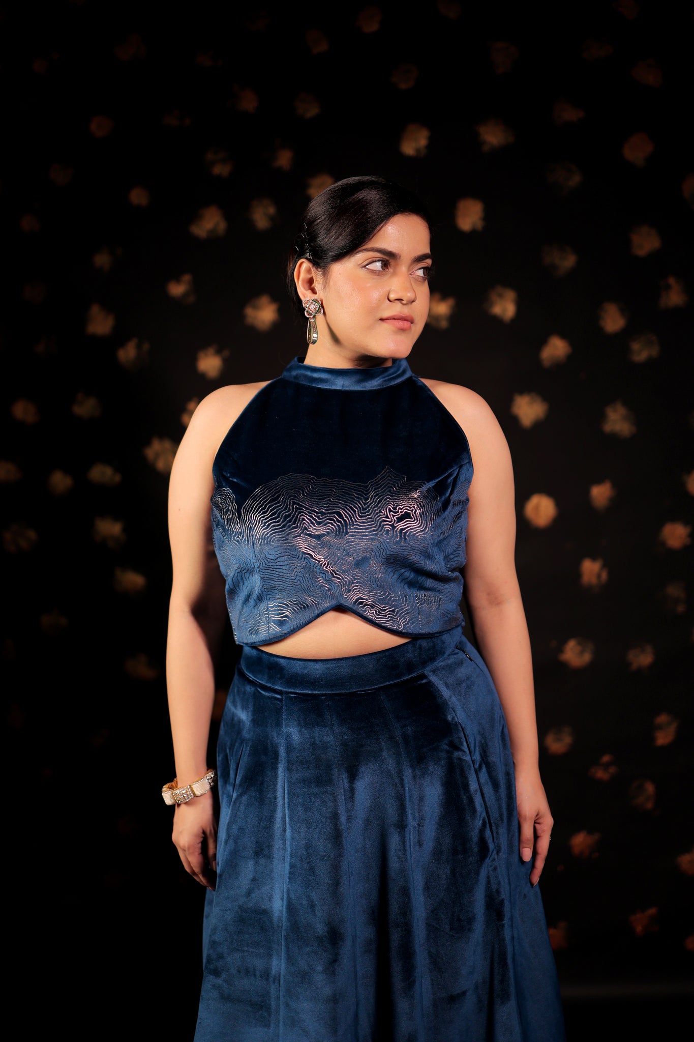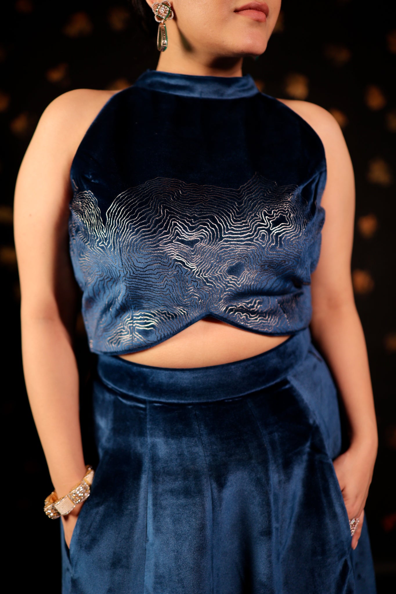 This CLASSIC Long velvet skirt Set features pockets and foil print embellishments. With intricate designs, these skirts are perfect for making a statement at parties and cocktail events. Complete your Look with our specially curated Festive POTLI .