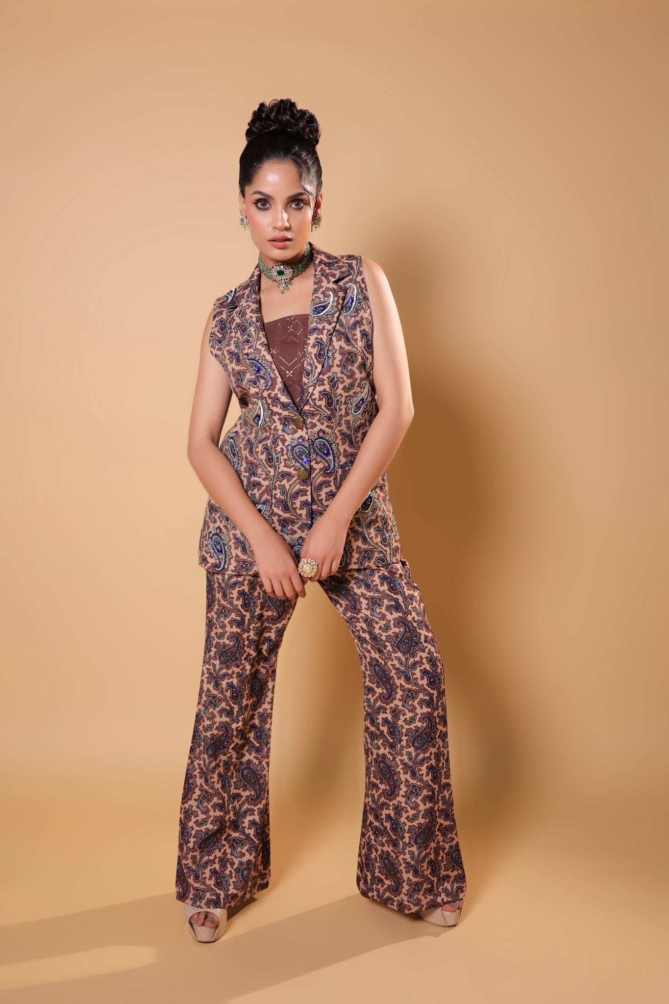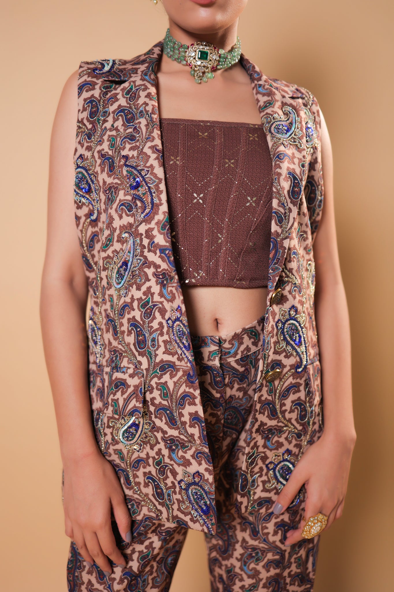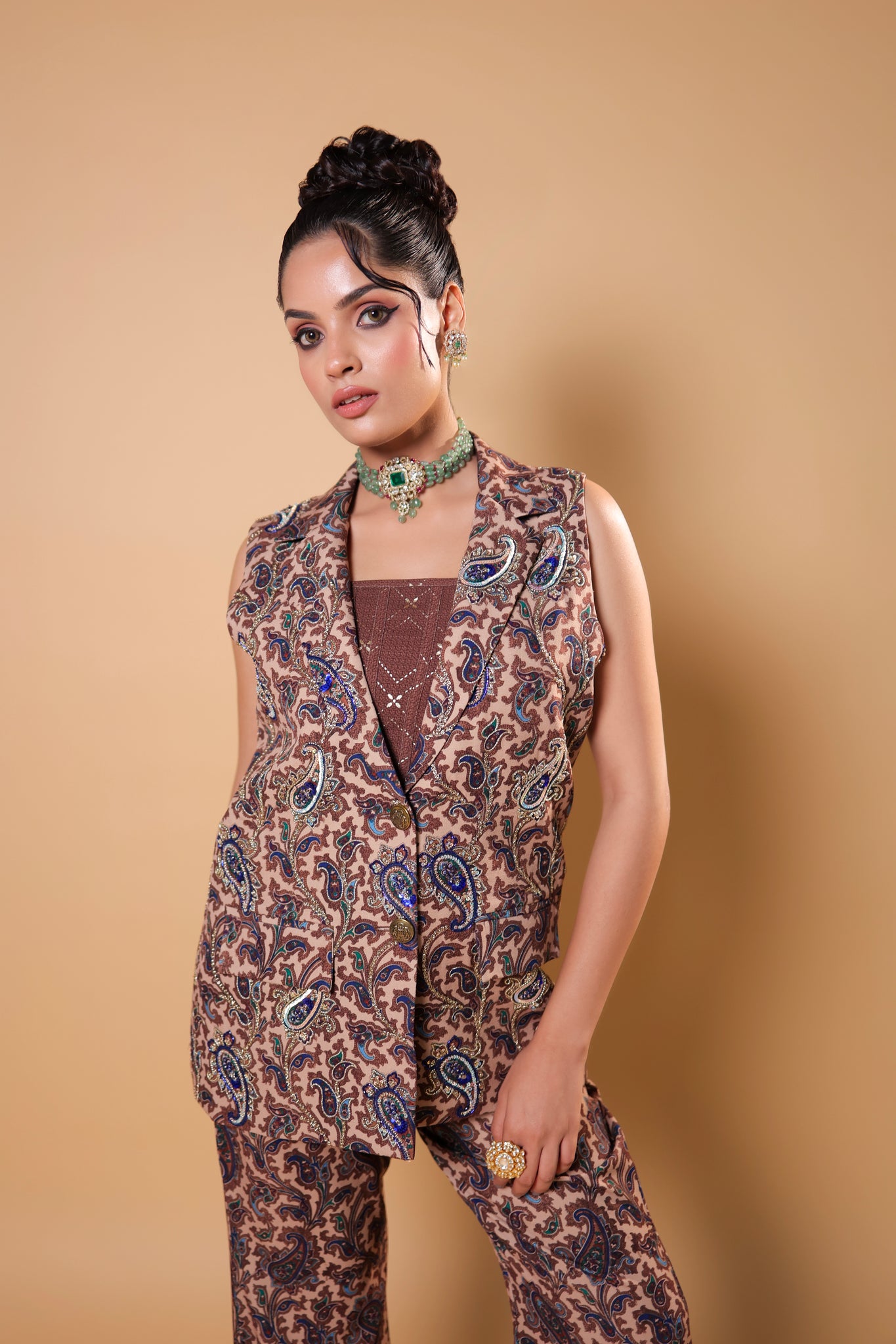 Introducing our stunning Embroidered Blazer Set – the epitome of sophistication and style for your next cocktail event! . This three-piece ensemble features a tailored sleeveless blazer and a chic corset, beautifully crafted with intricate embroidery that adds a touch of elegance to your attire.