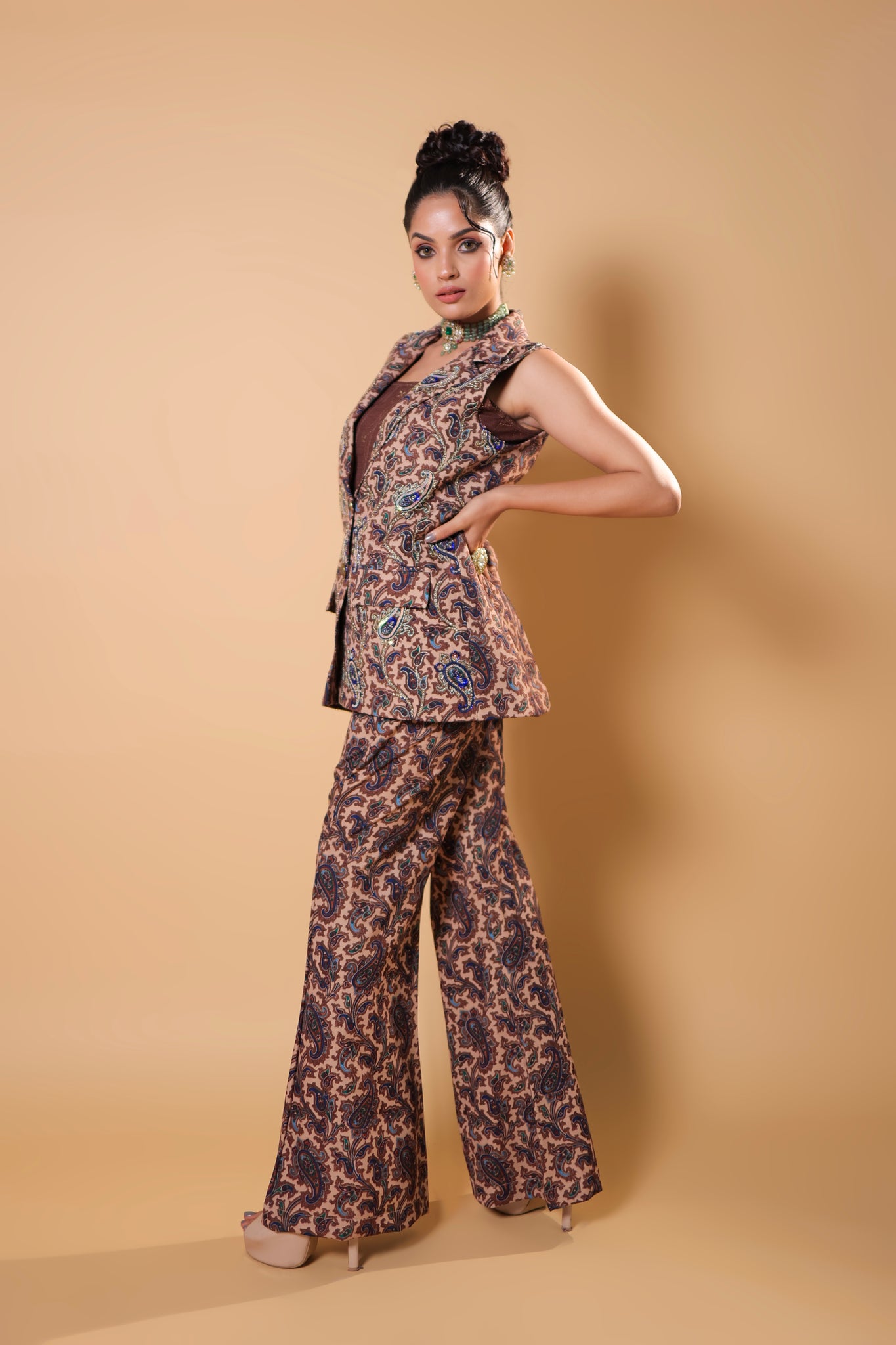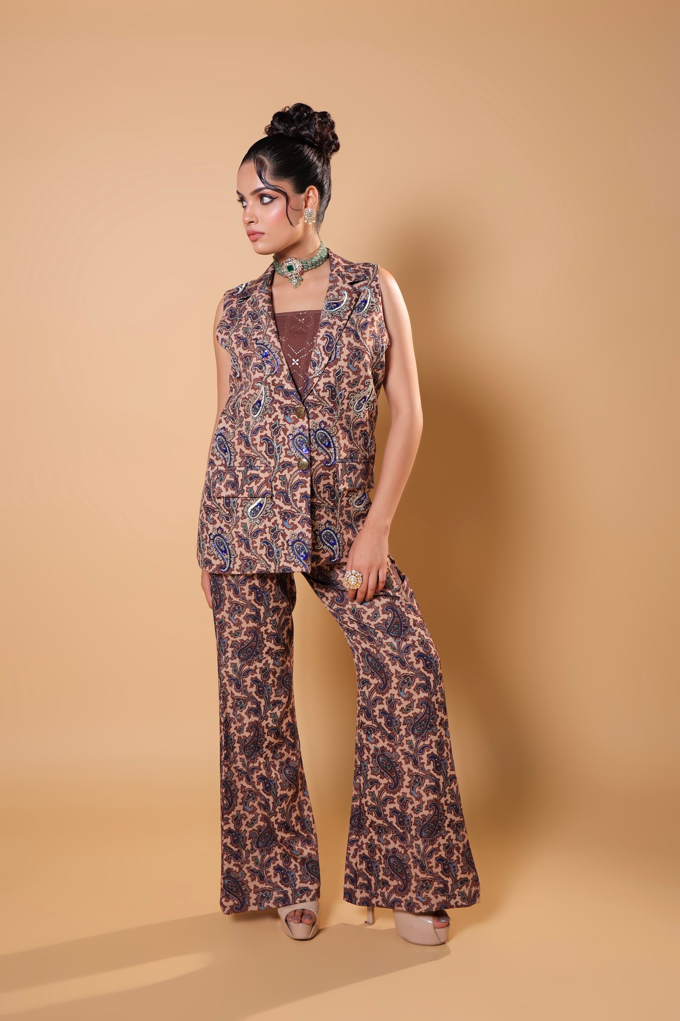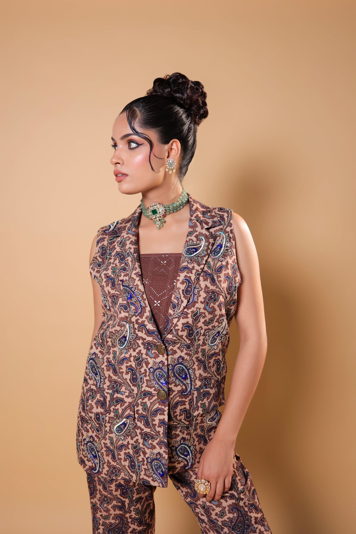 Introducing our stunning Embroidered Blazer Set – the epitome of sophistication and style for your next cocktail event! . This three-piece ensemble features a tailored sleeveless blazer and a chic corset, beautifully crafted with intricate embroidery that adds a touch of elegance to your attire.