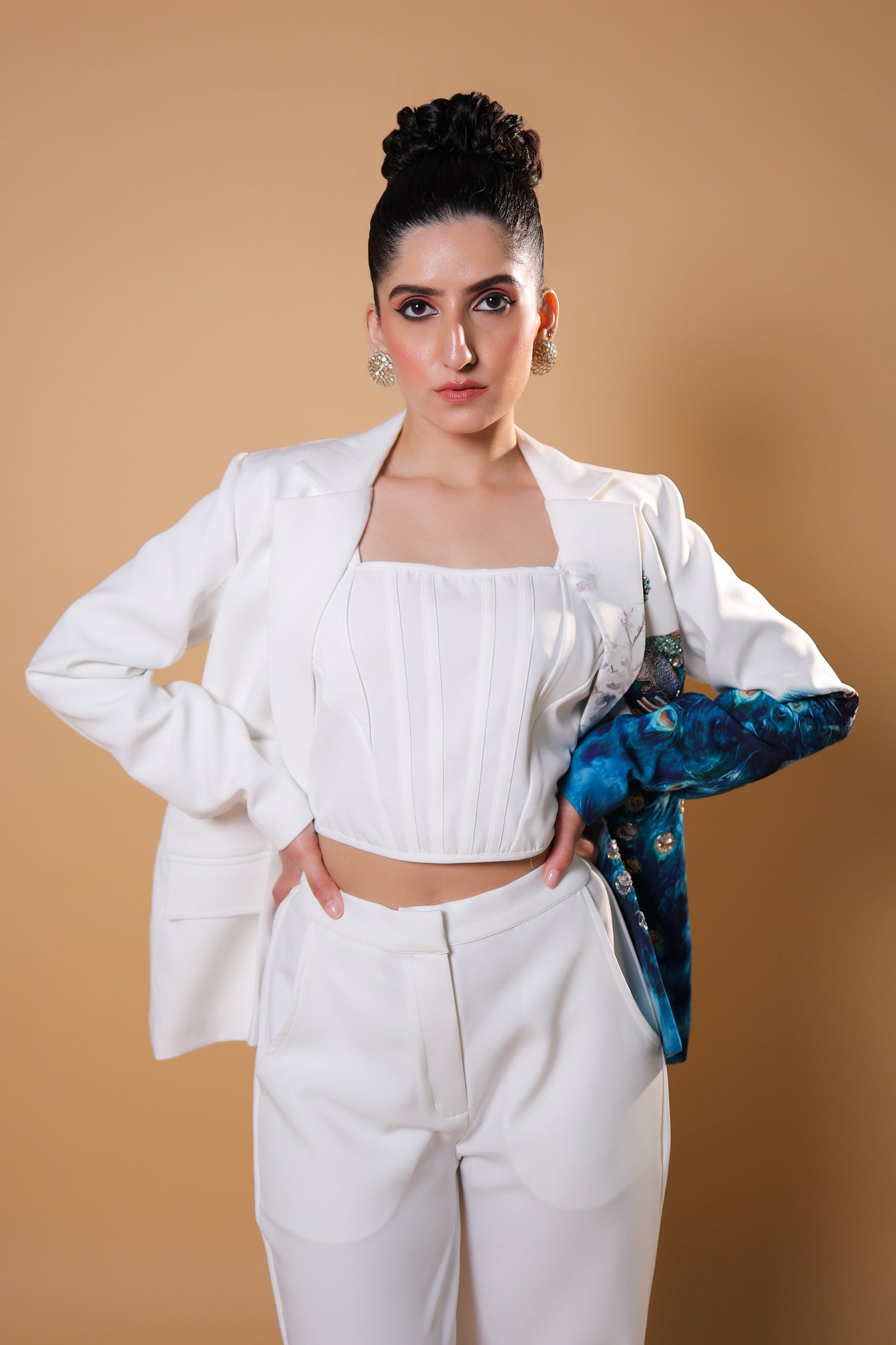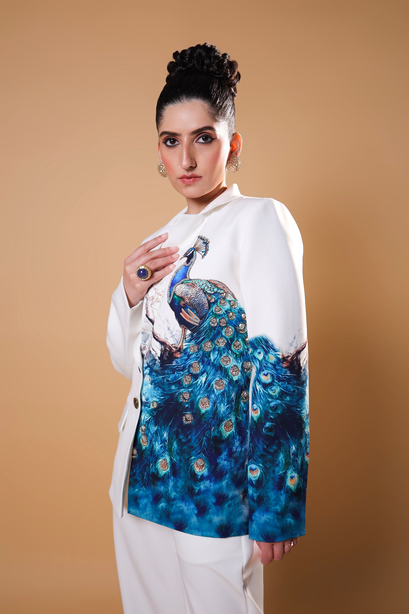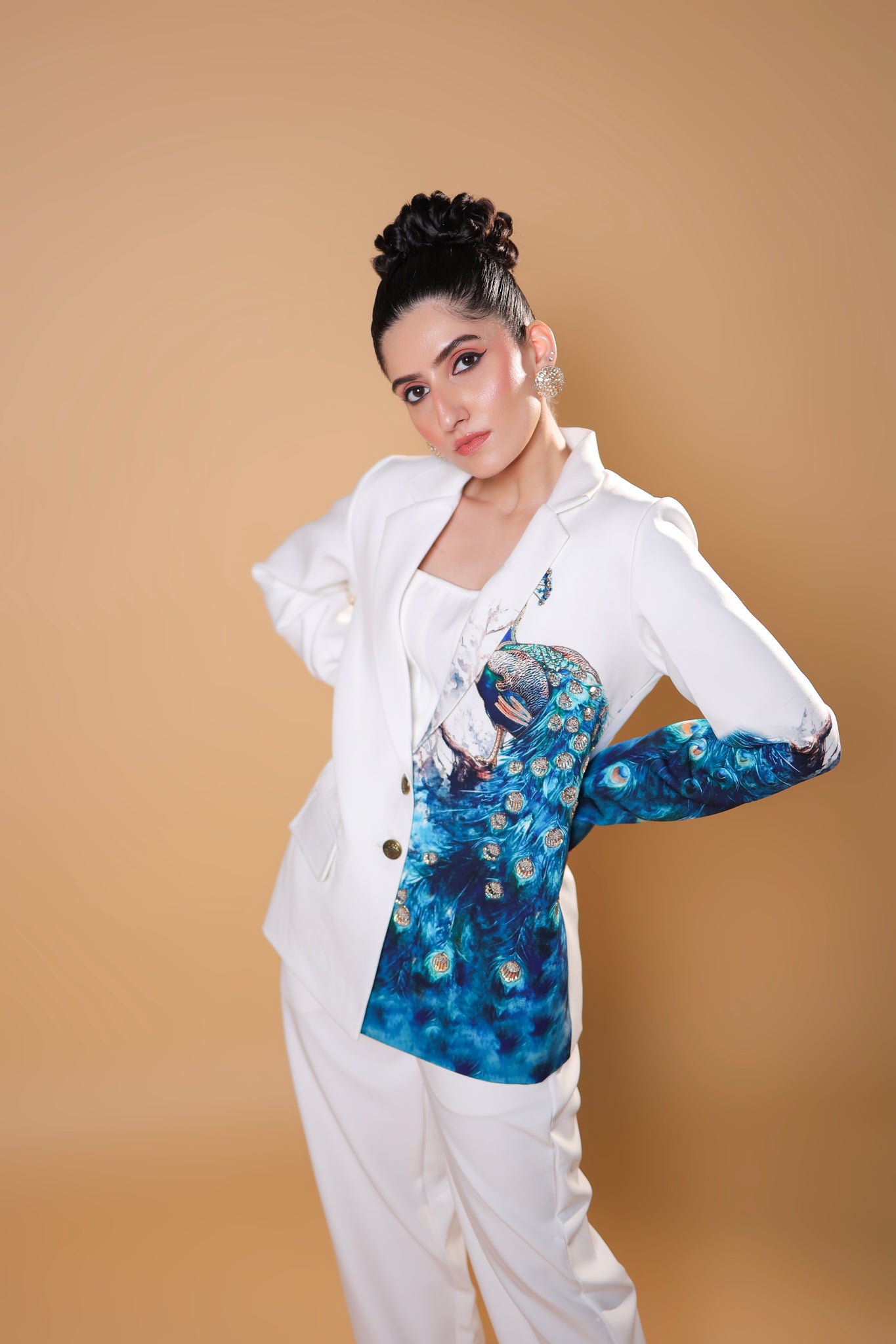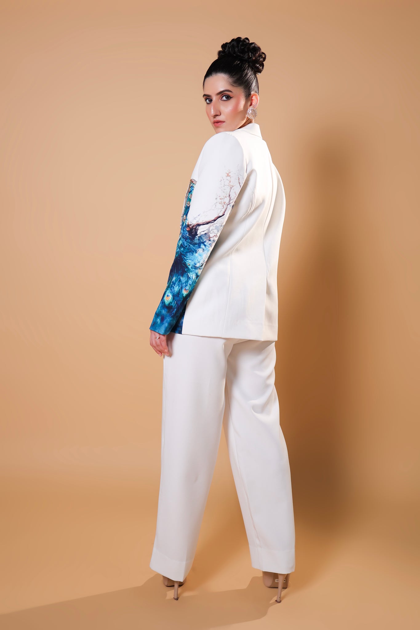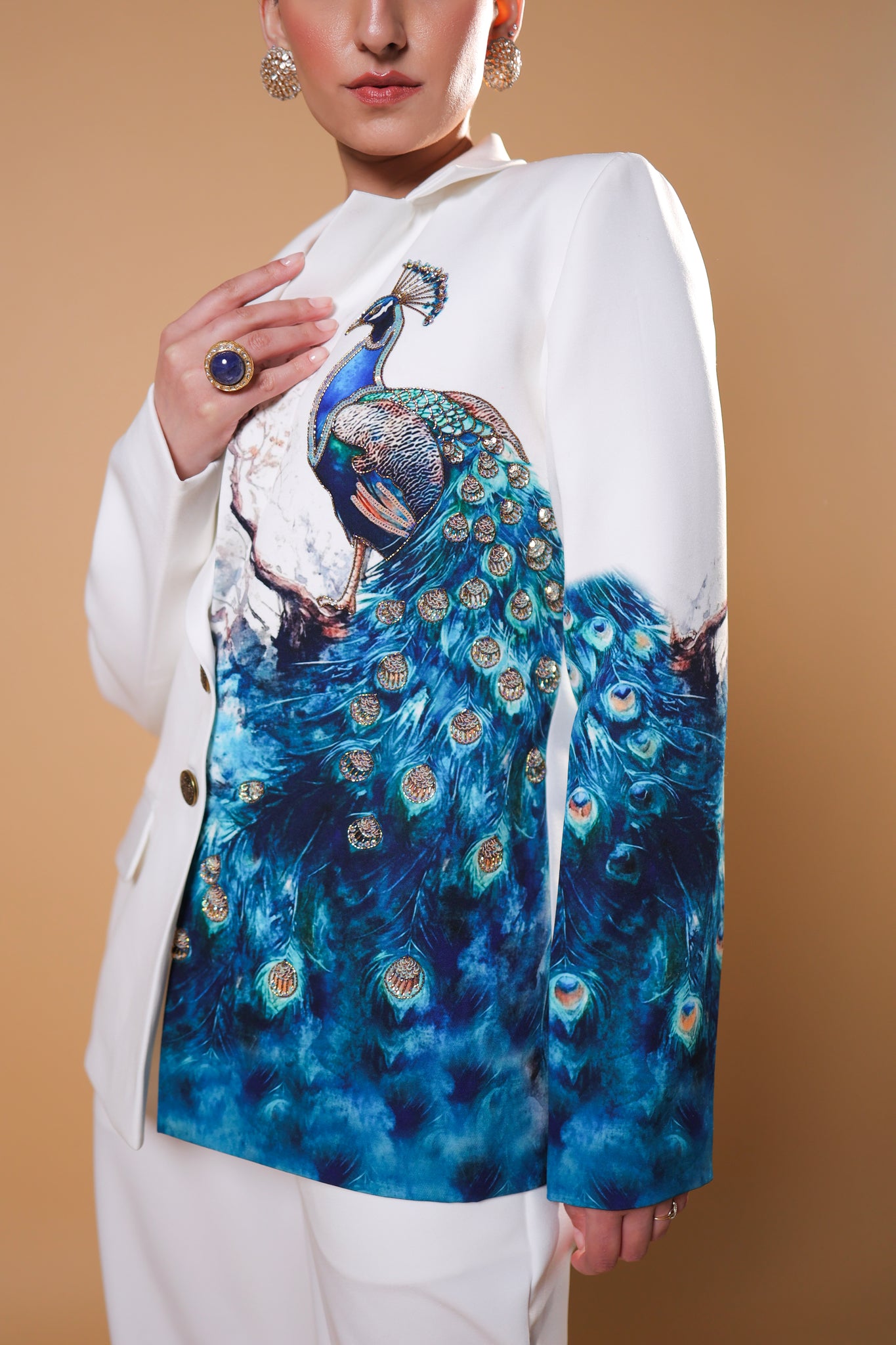 Elevate your wardrobe with our stunning custom-made blazer set, featuring a beautifully intricate peacock print and exquisite embroidery. When elegance meets fashion, magic happens!
