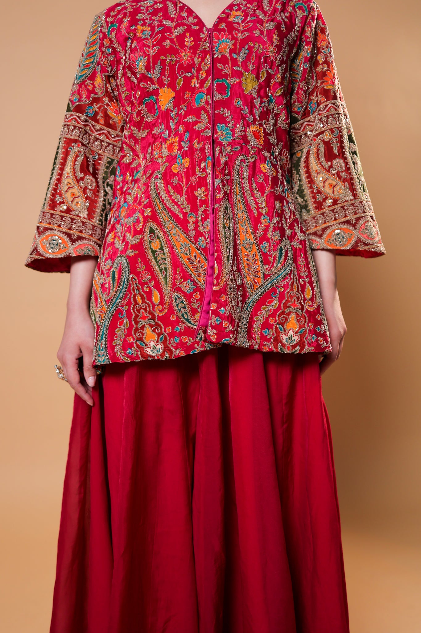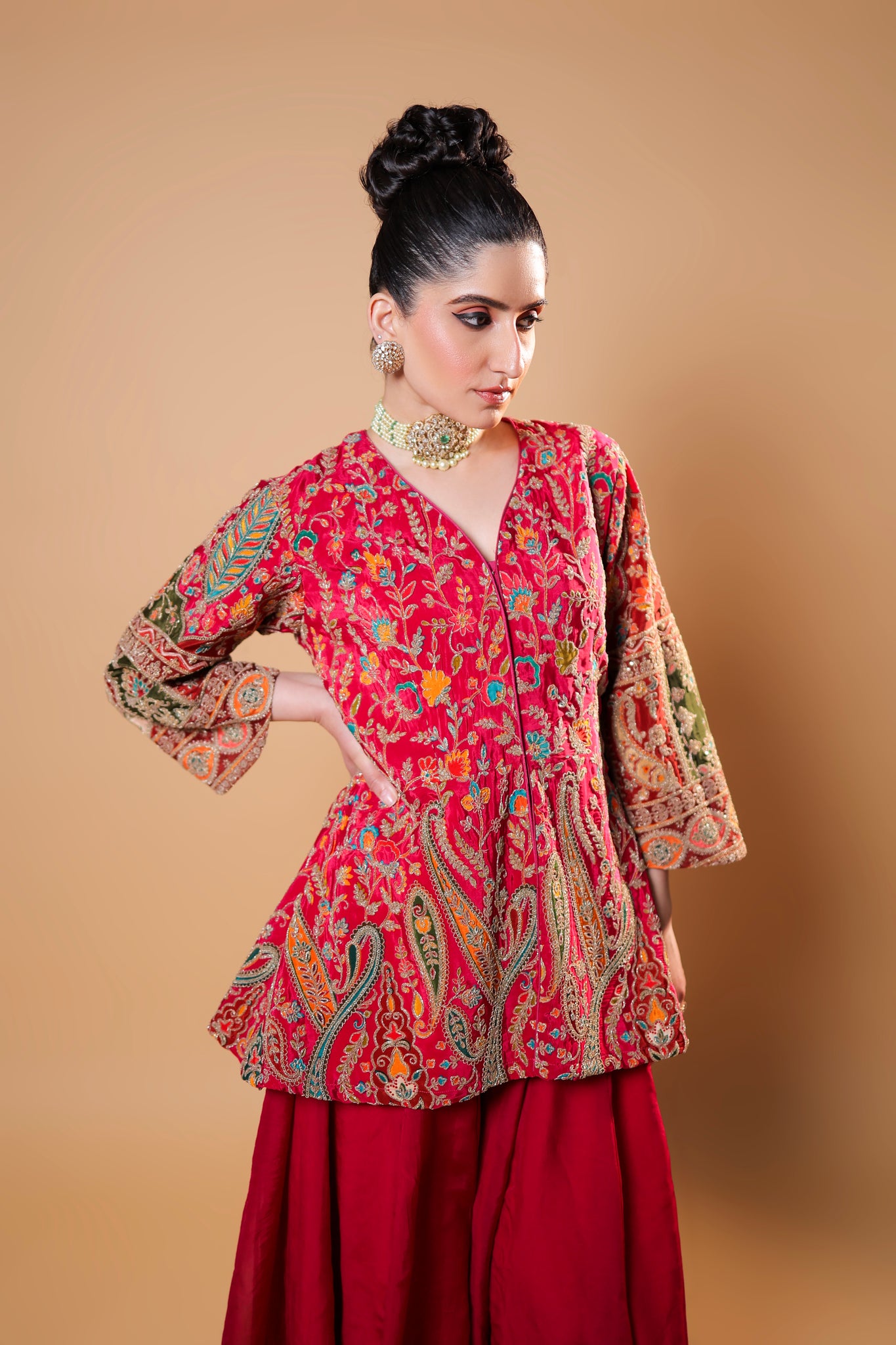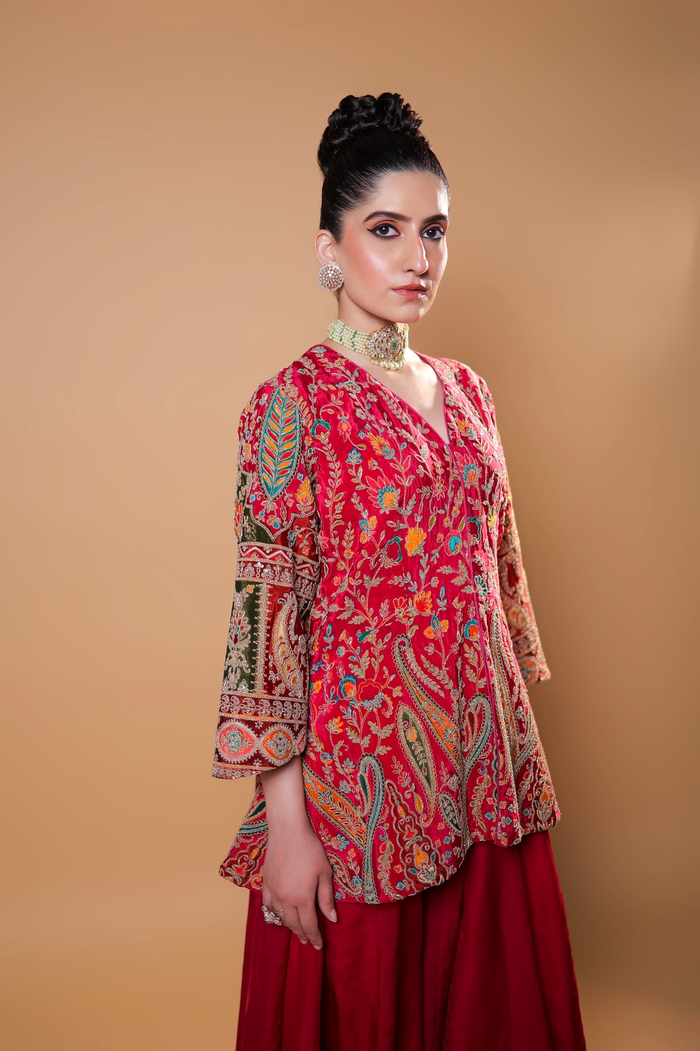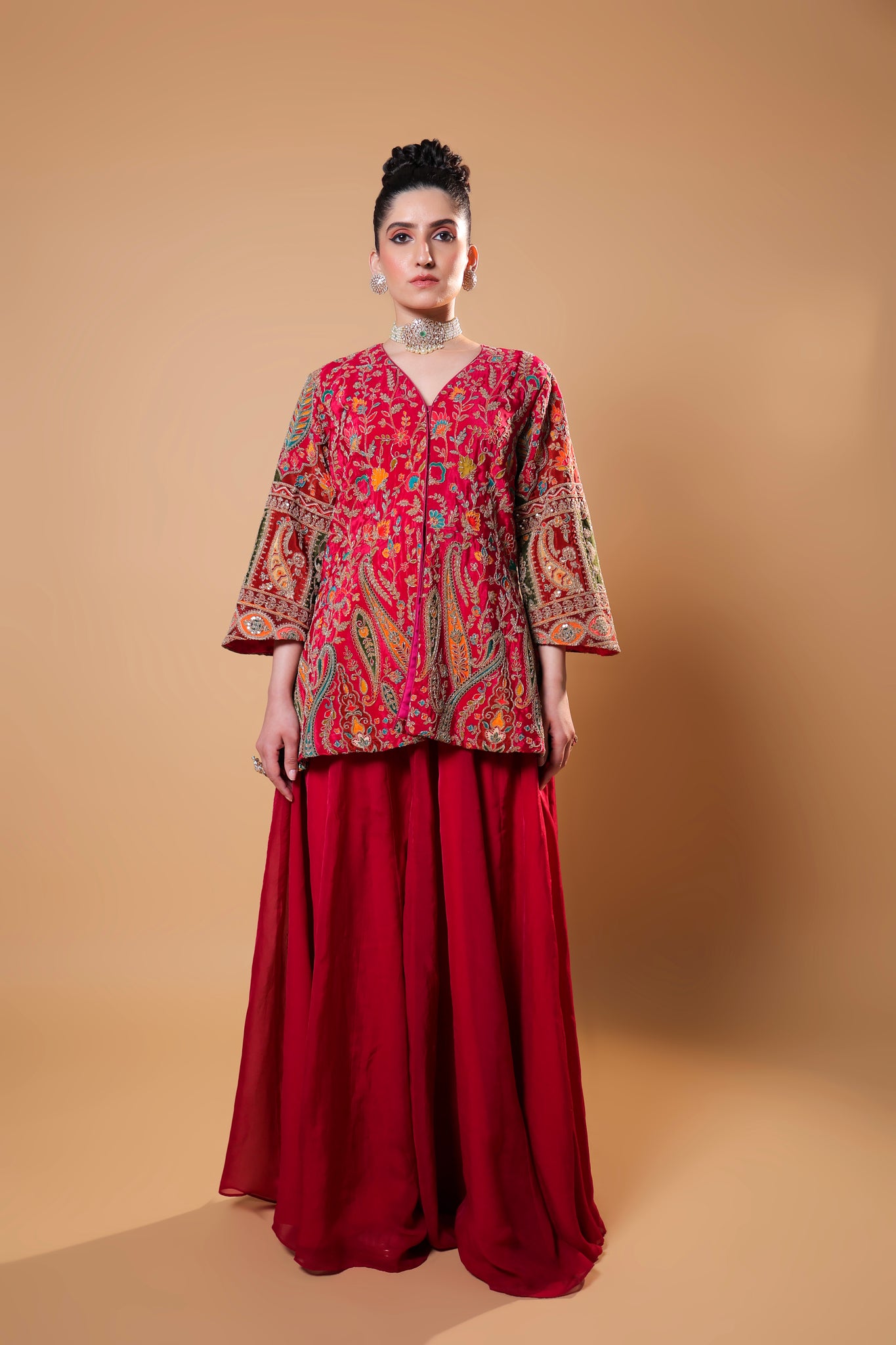 Introducing our exquisite embroidered jacket paired with a luxurious organza sharara – a combination that exudes sophistication and style. The intricate embroidery adds a touch of artistry, while the flowy sharara ensures you move with grace and charm.