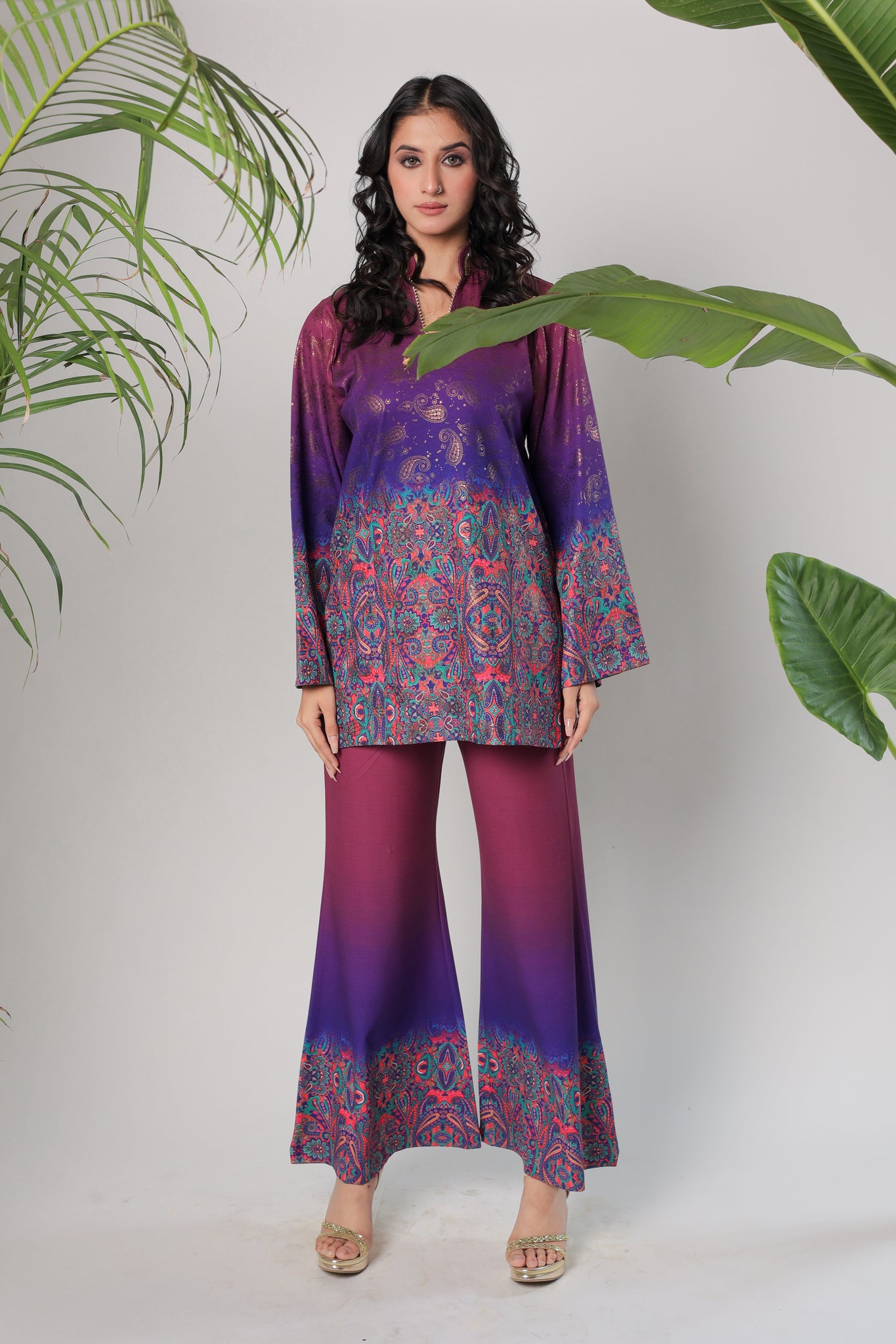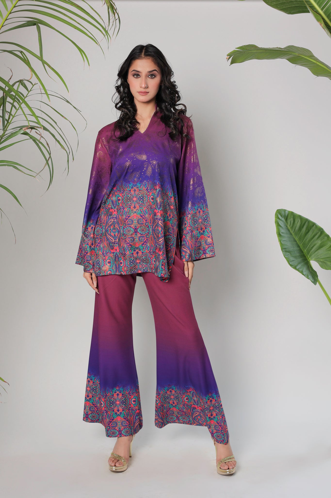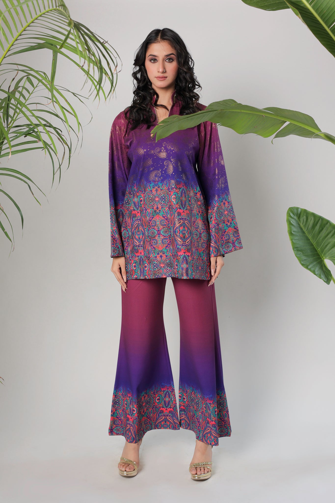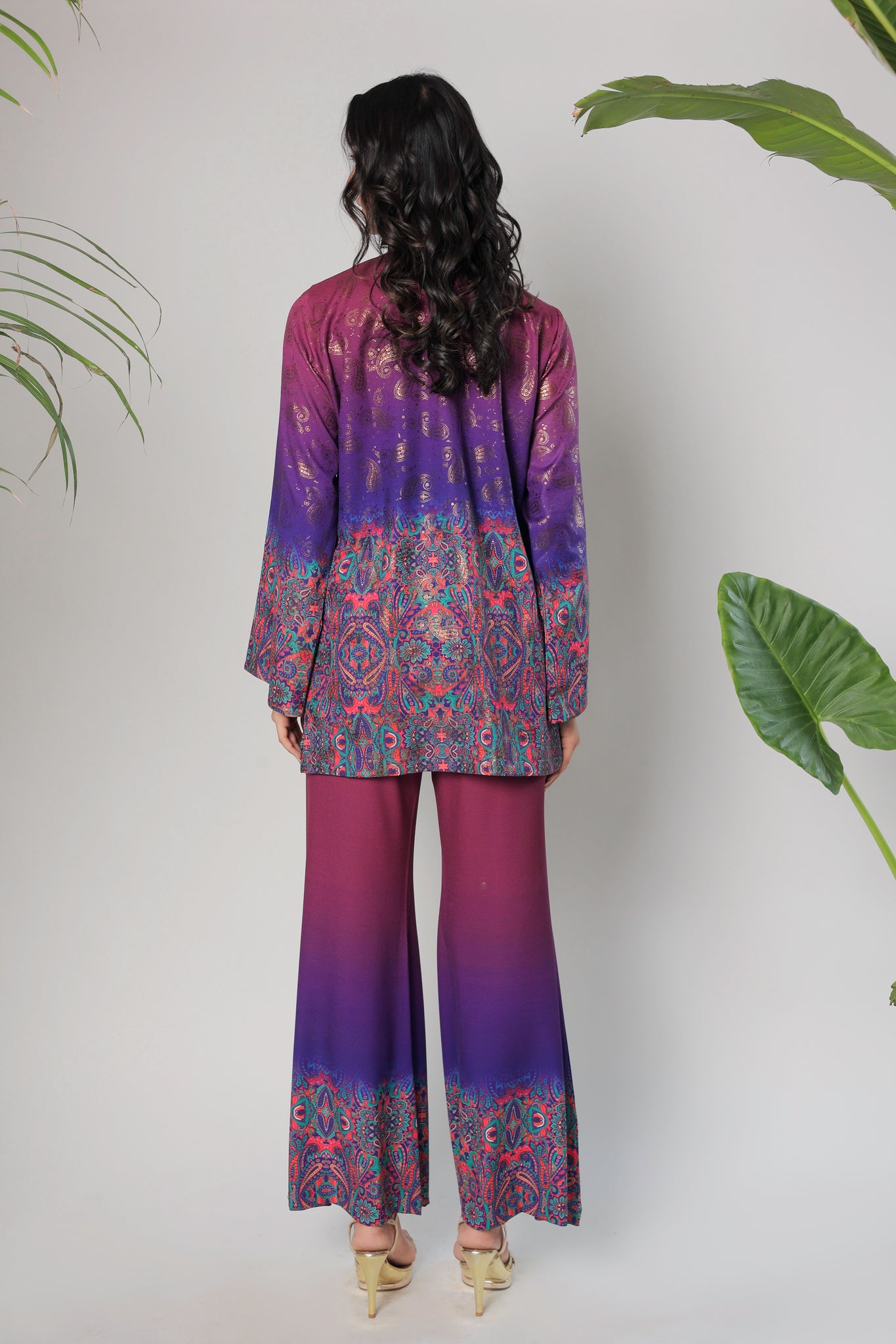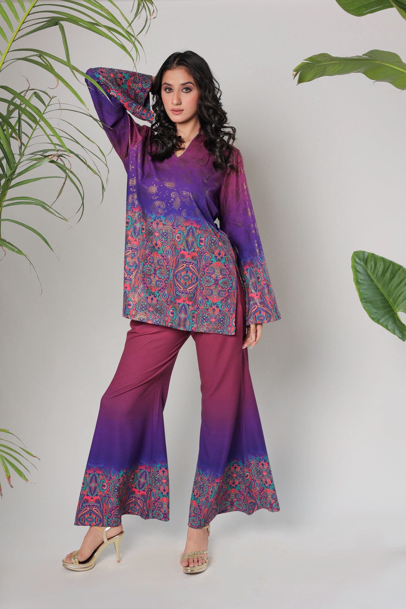 This Stunning Coord set featuring Unique Print and foil detailing will surely turn those heads. Embrace the occasion in this formal coord set from Your Mine Story. The overall aesthetic of this set is extremely beautiful. Featuring Foil Printed Kurta and Bell Bottom Pants , this formal coord set is a must have !