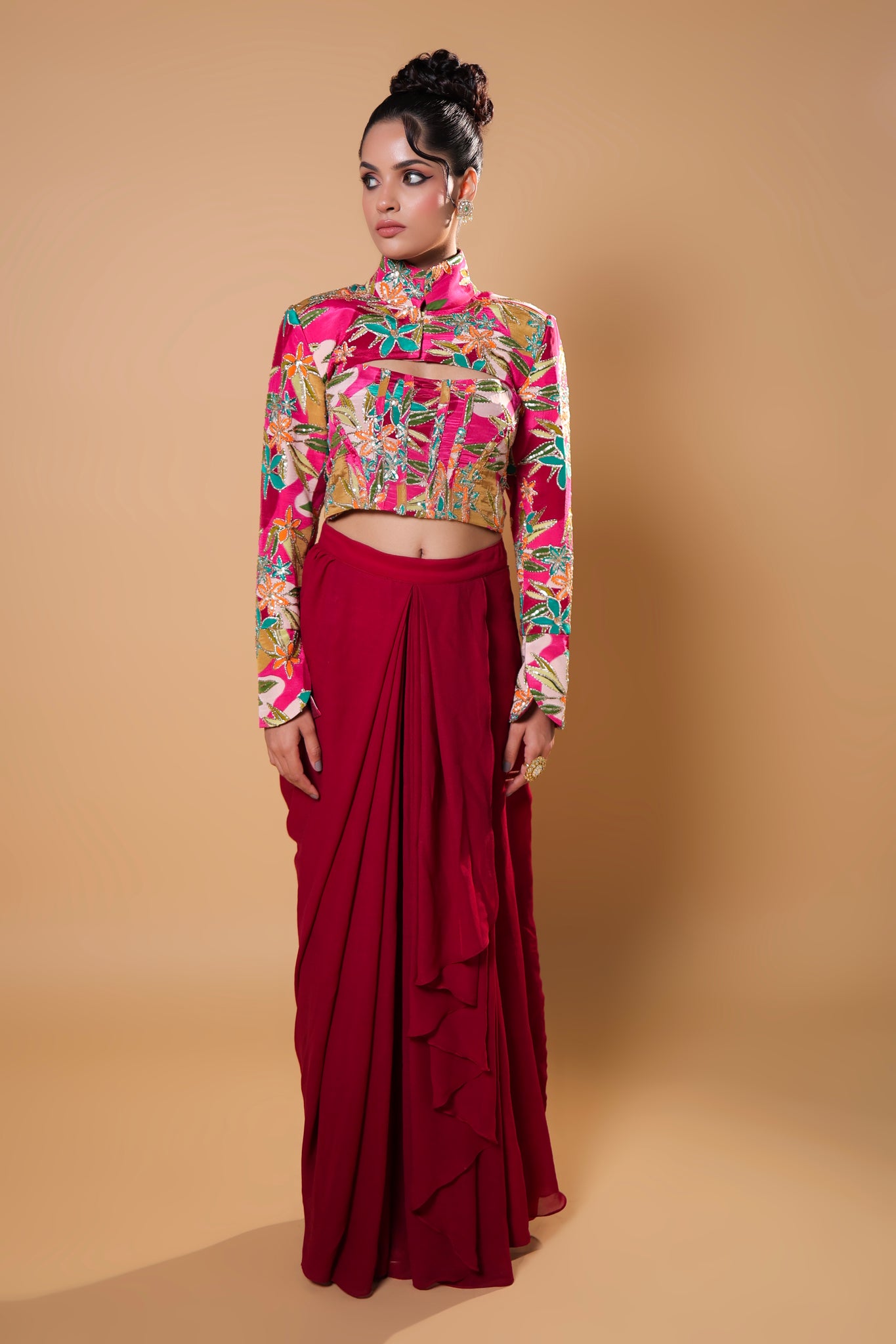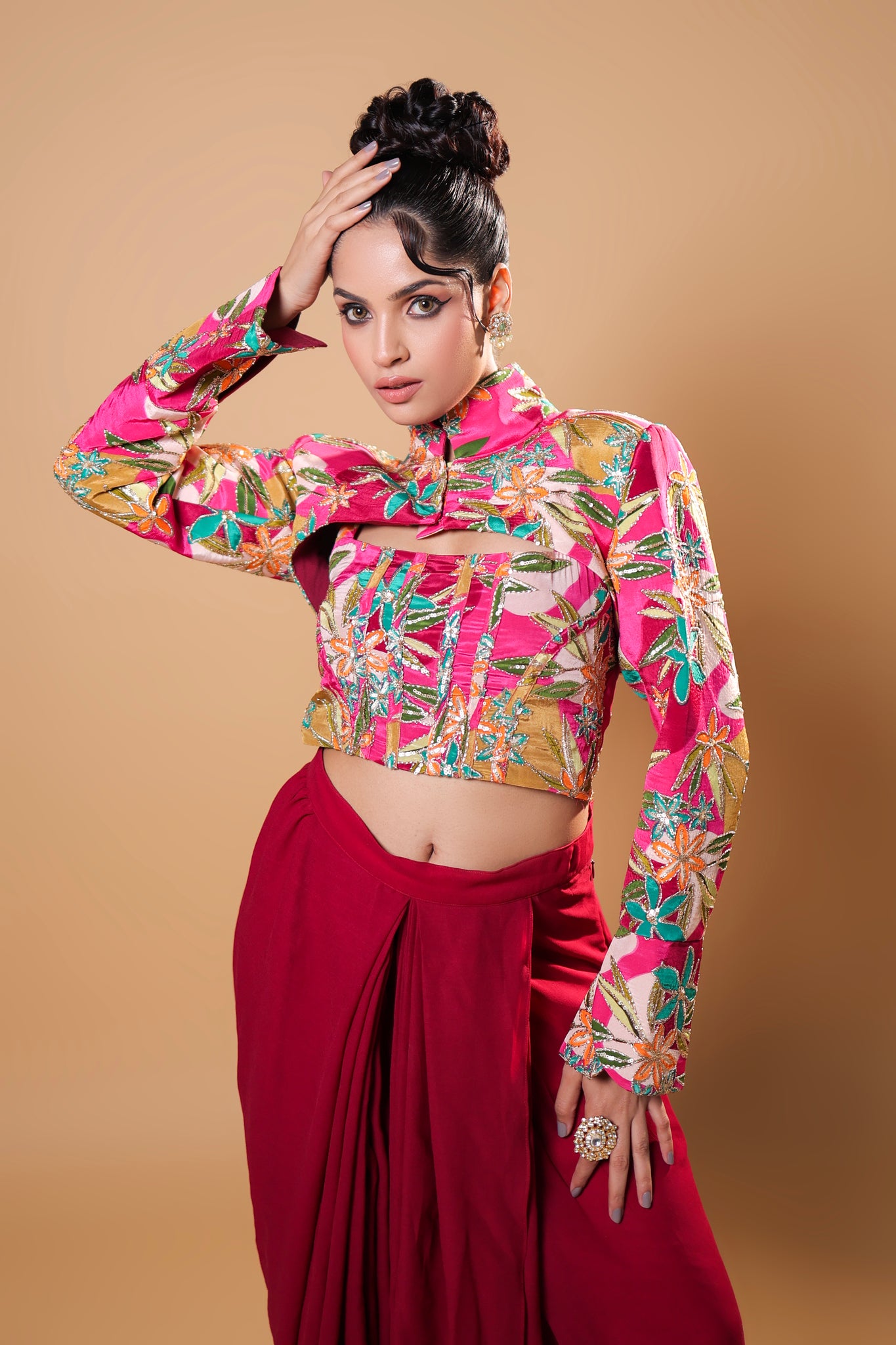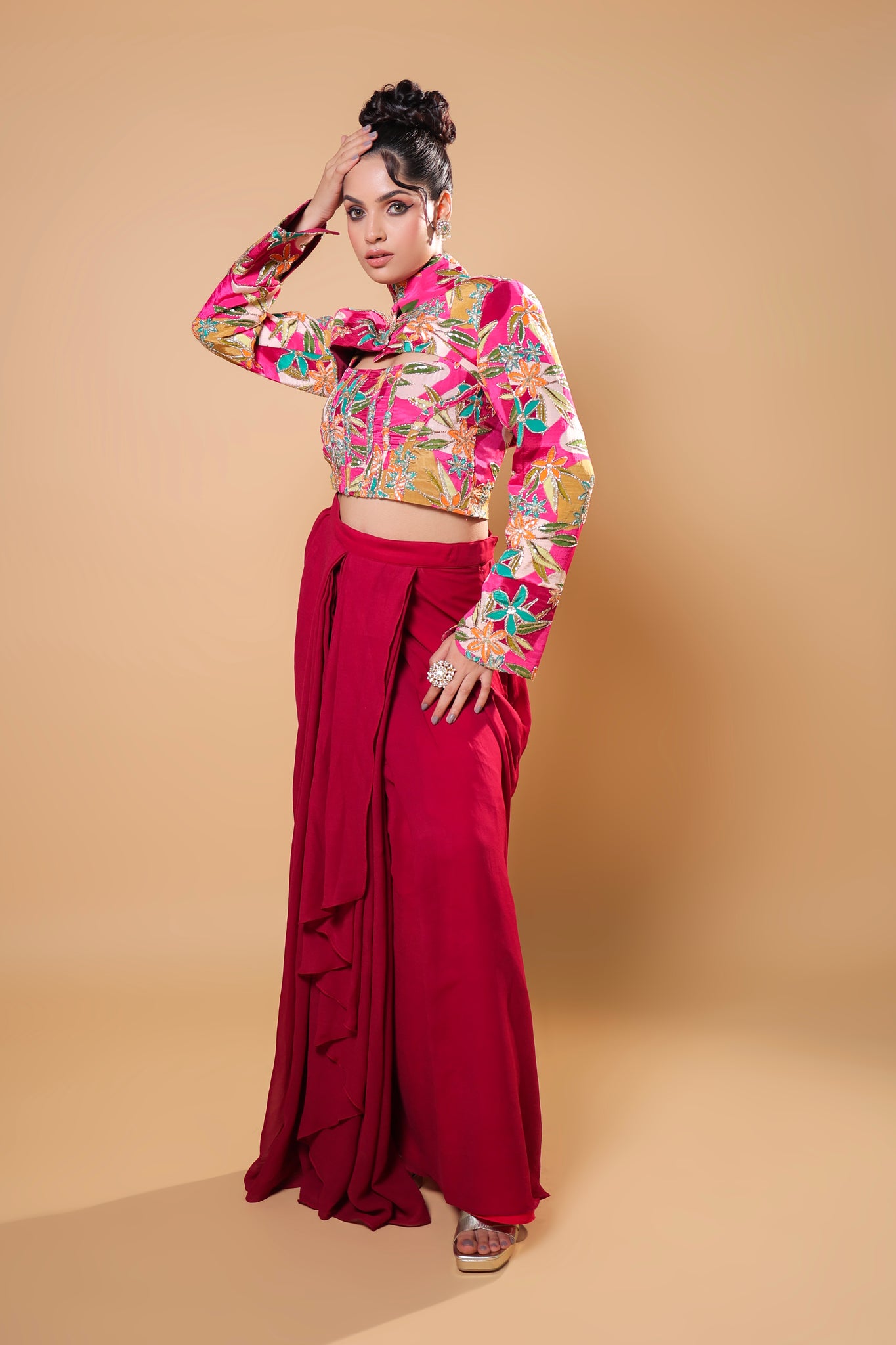 Embrace the perfect blend of tradition and modernity with this exquisite three-piece ensemble featuring an intricately embroidered jacket and a chic top. The flow of the dhoti adds an elegant silhouette, making it ideal for any occasion—be it a festive celebration or a sophisticated soirée.