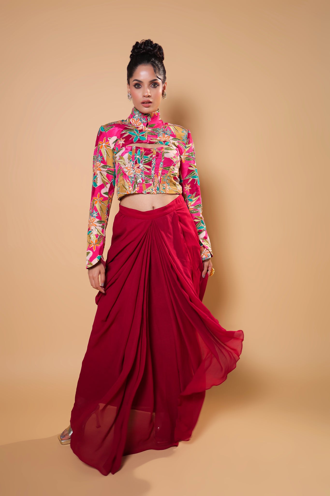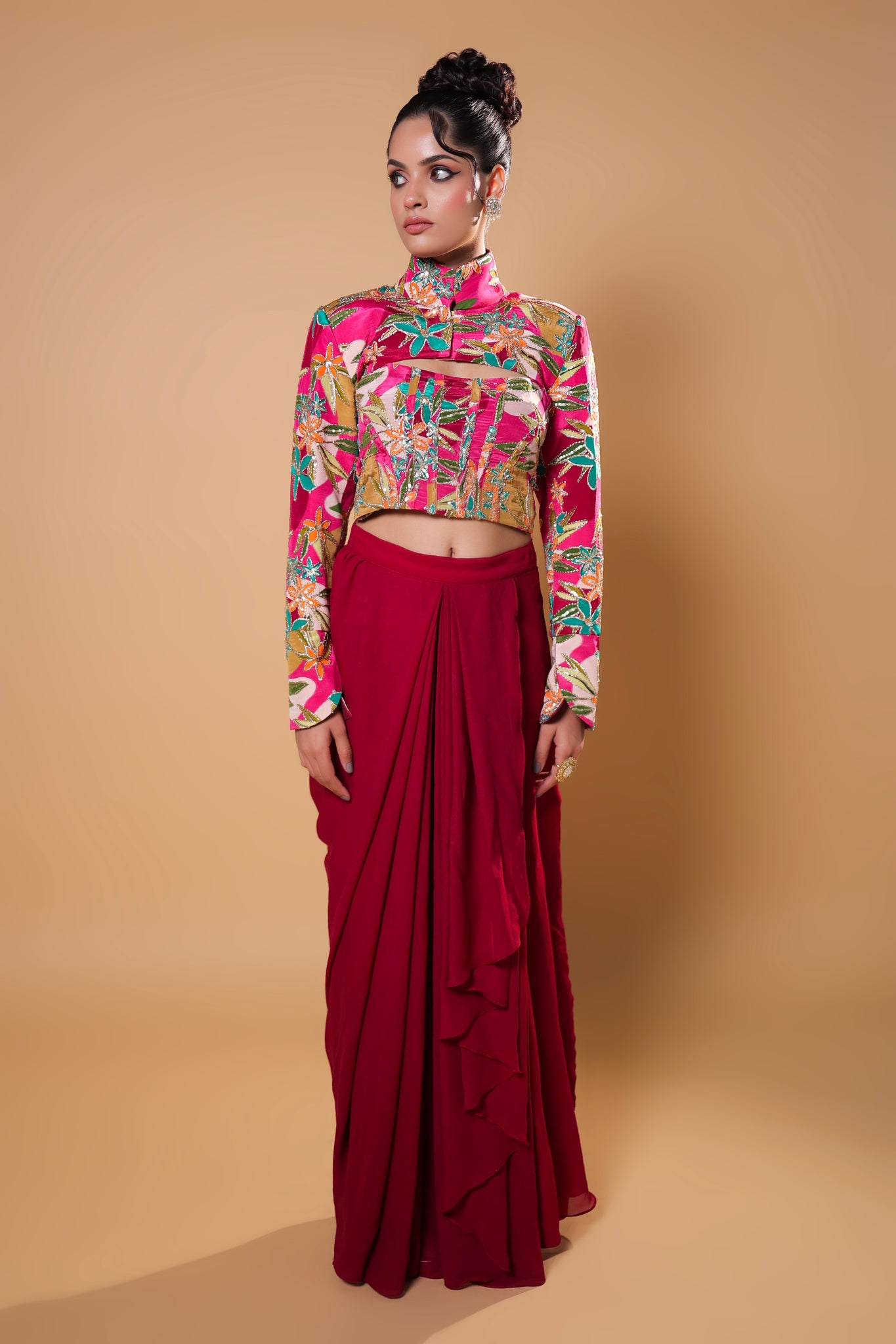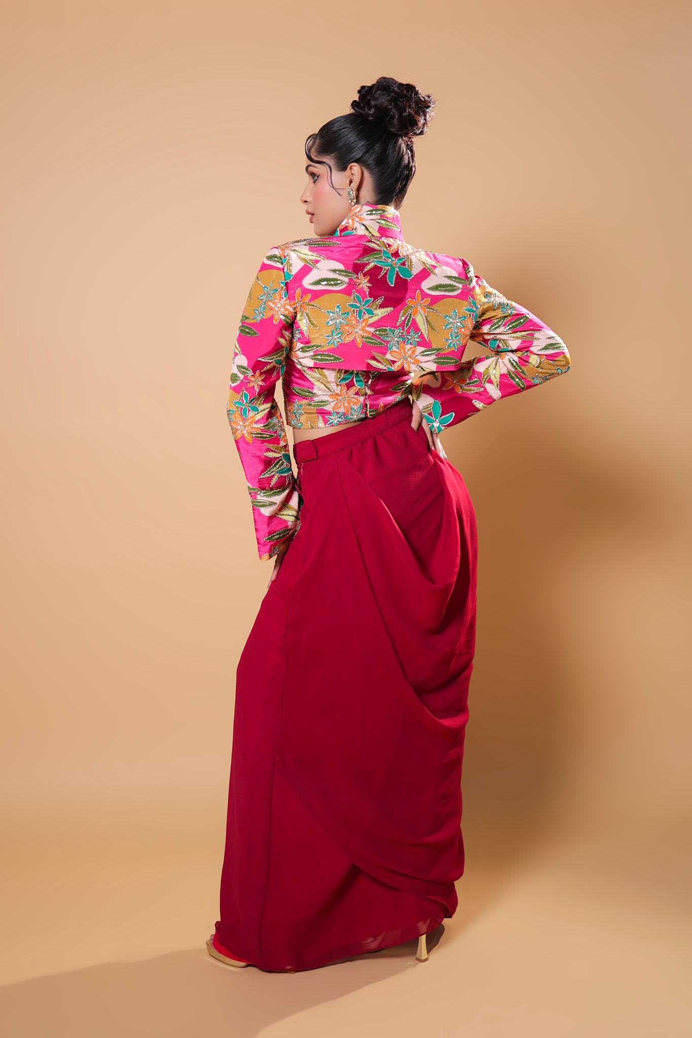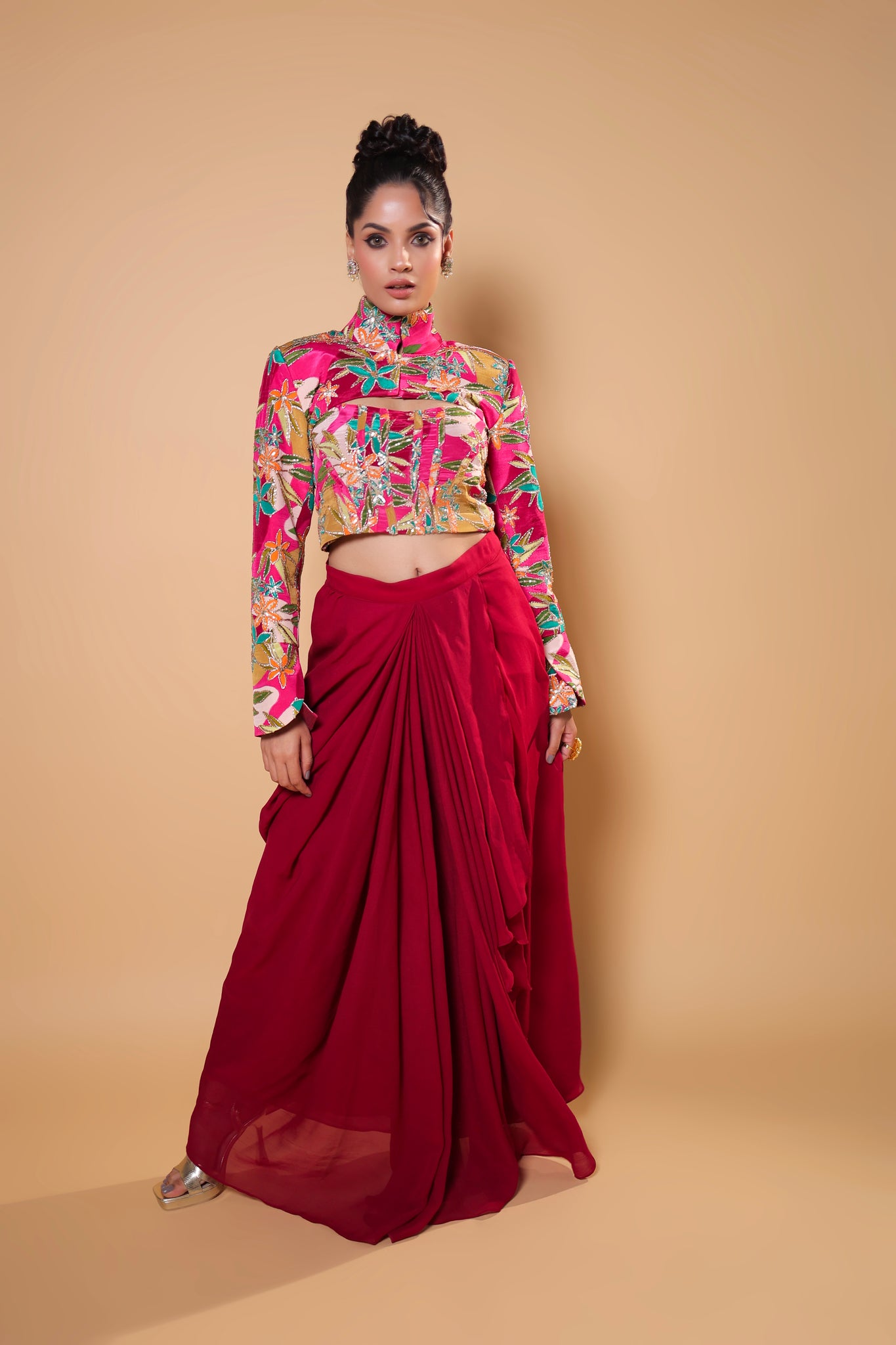 Embrace the perfect blend of tradition and modernity with this exquisite three-piece ensemble featuring an intricately embroidered jacket and a chic top. The flow of the dhoti adds an elegant silhouette, making it ideal for any occasion—be it a festive celebration or a sophisticated soirée.