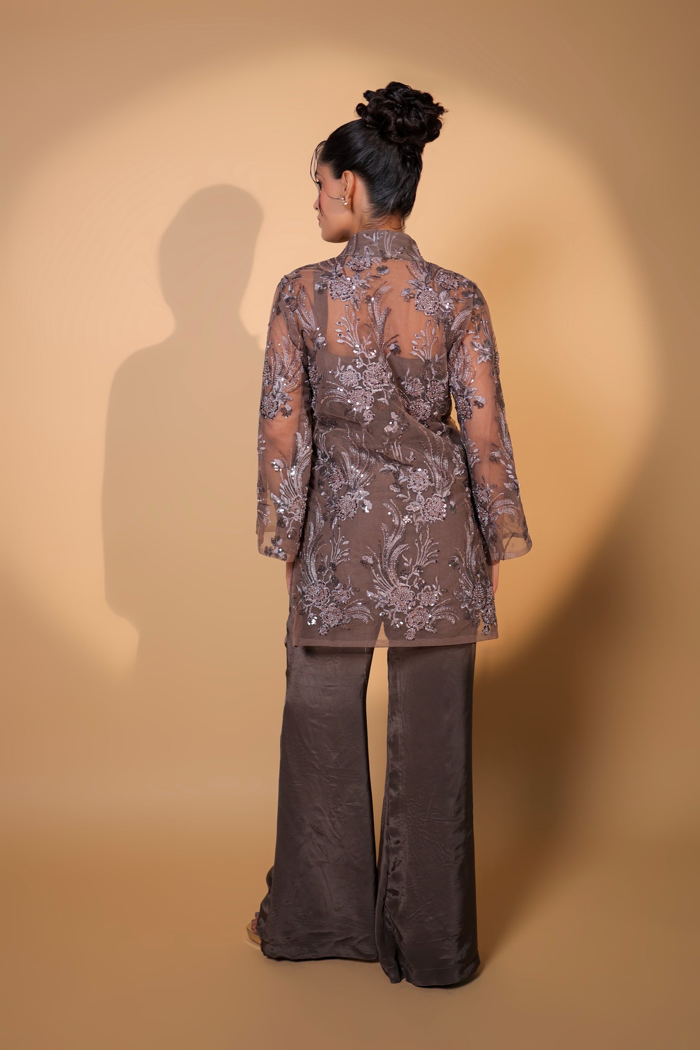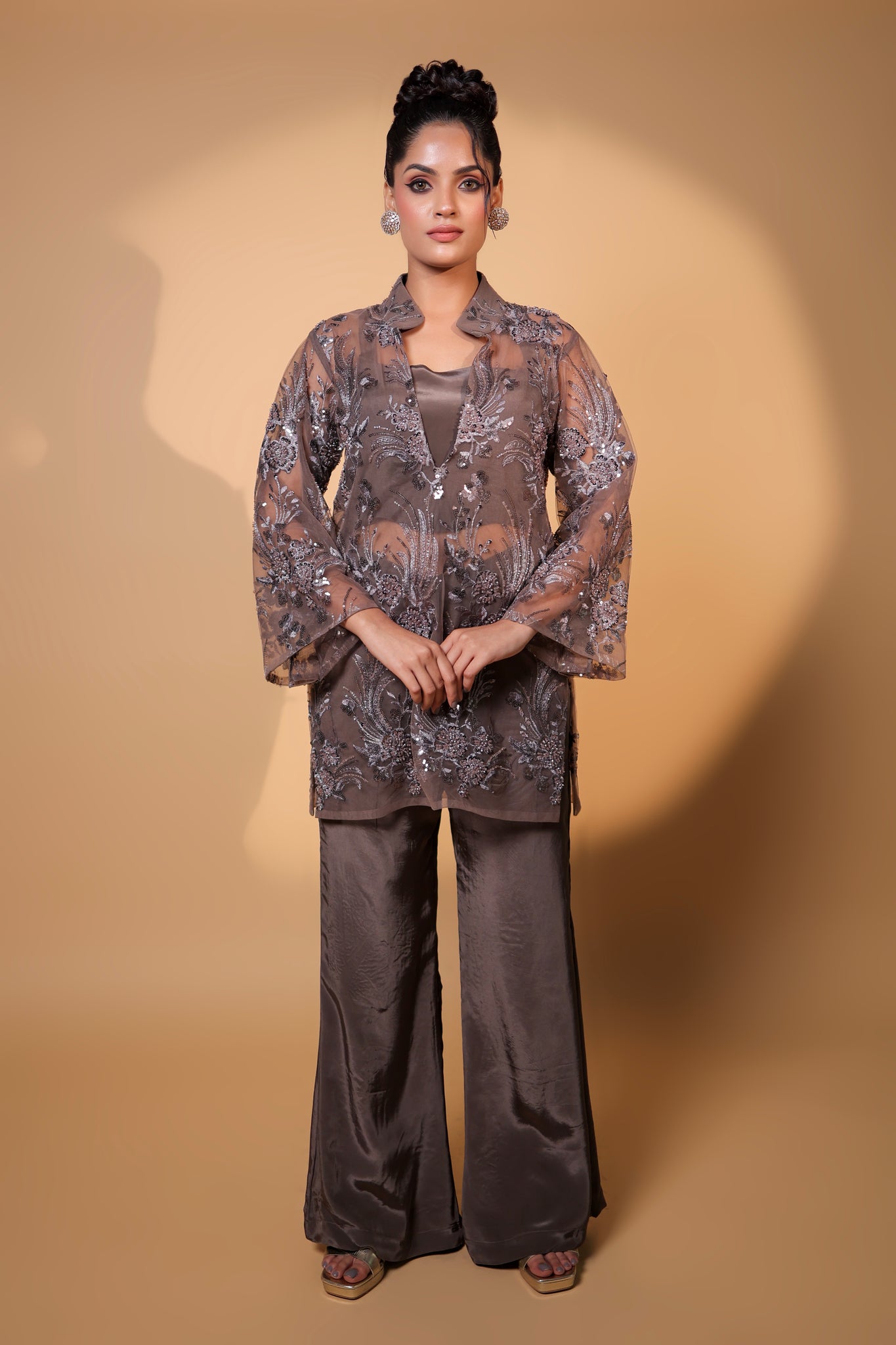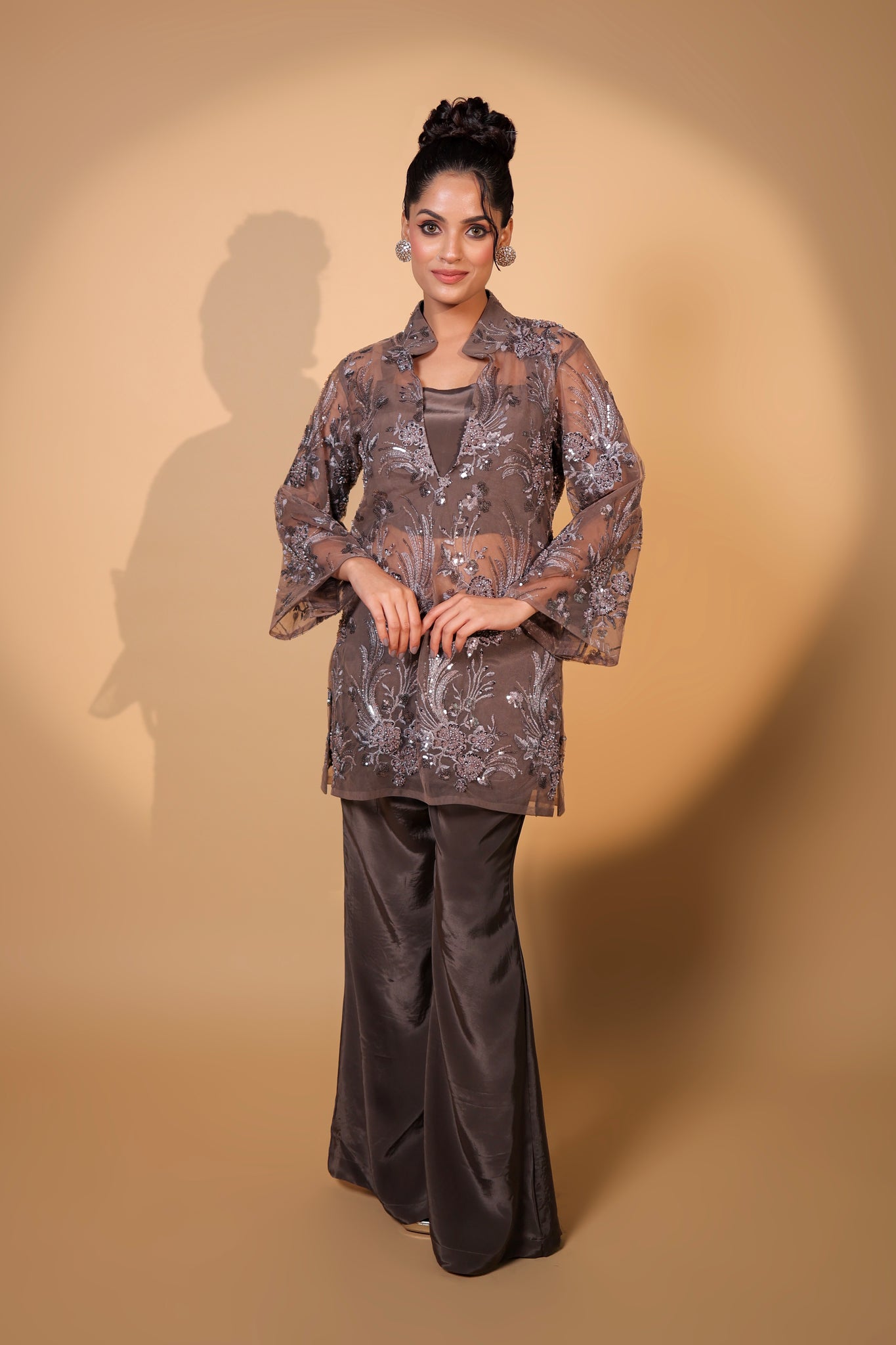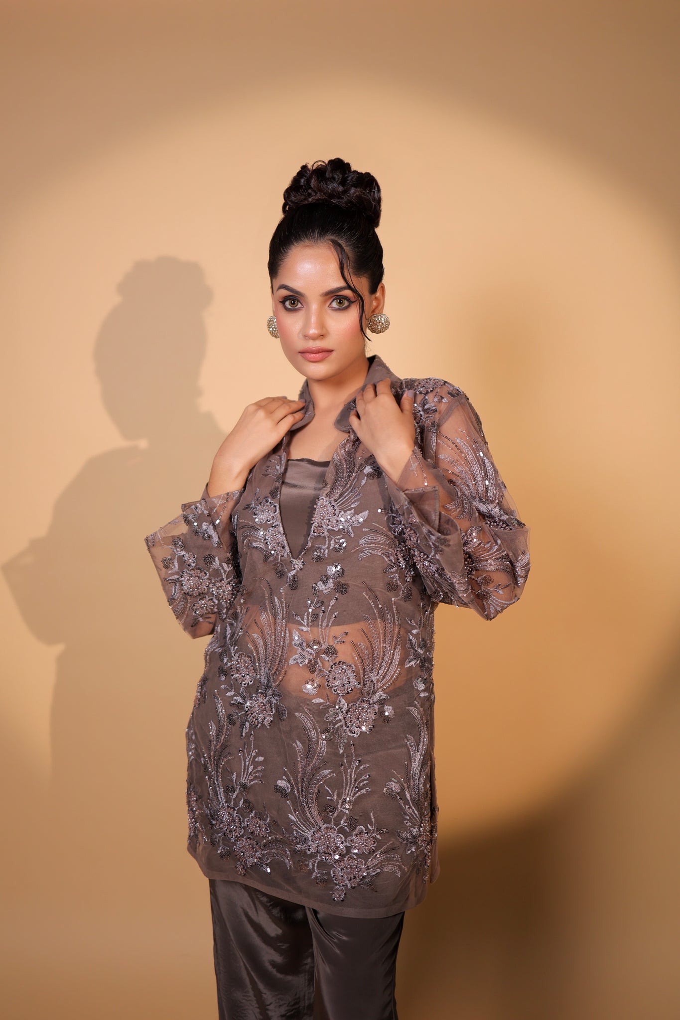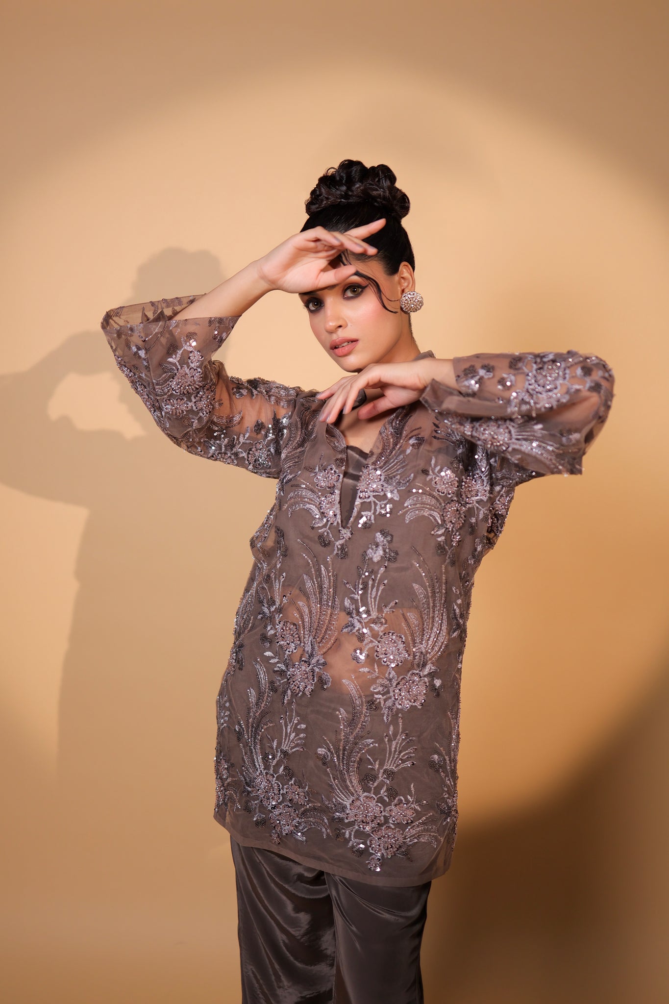 Crafted with meticulous attention to detail, this stunning attire features a hand-embroidered net fabric kurta that beautifully showcases traditional Pakistani artistry. Paired with elegant satin pants, this ensemble effortlessly blends modern aesthetics with timeless elegance.