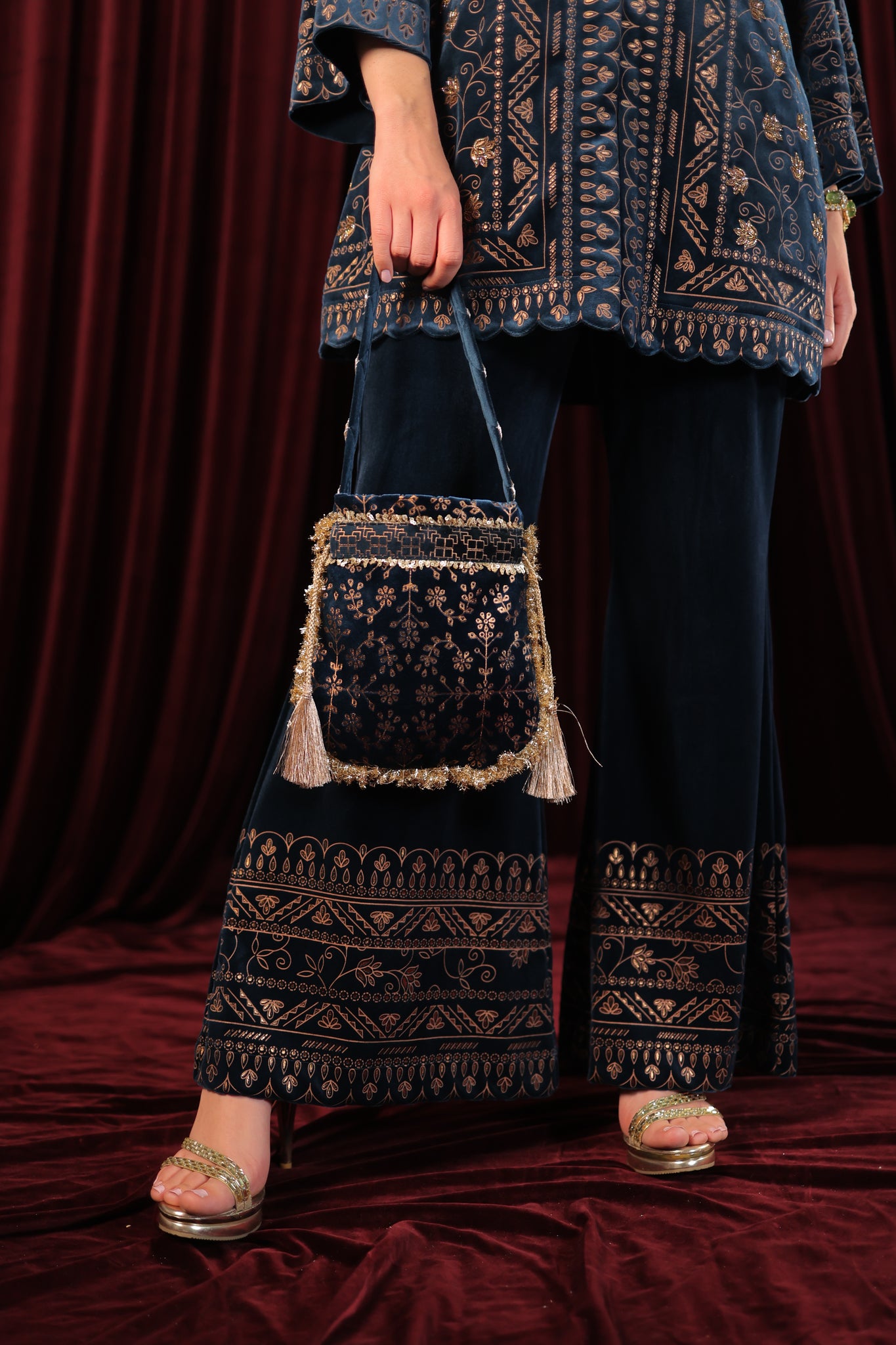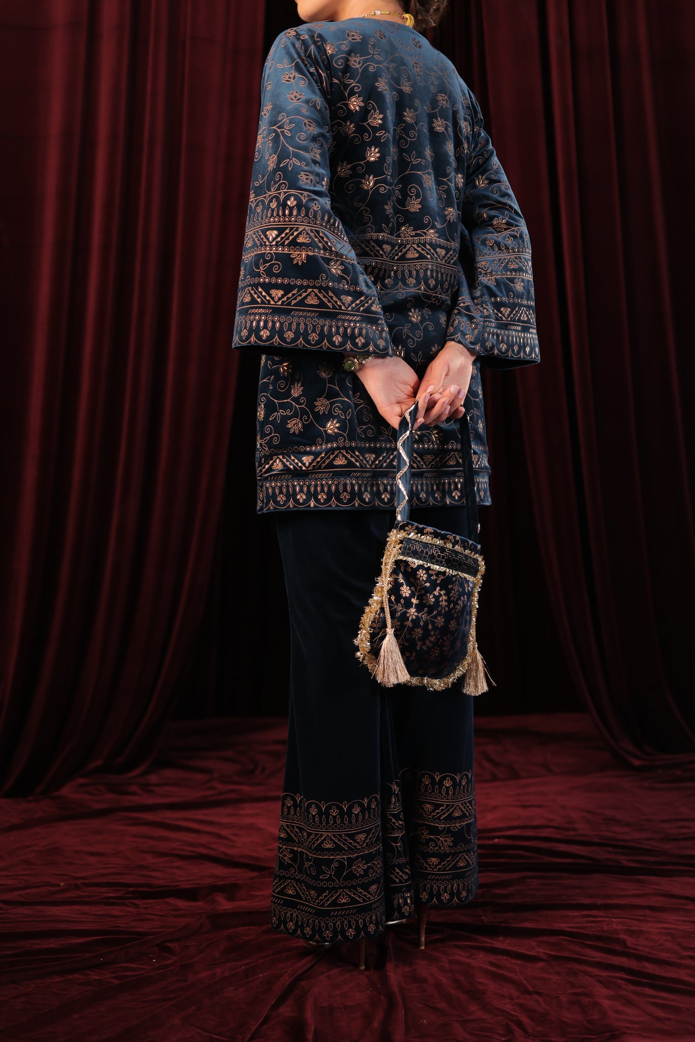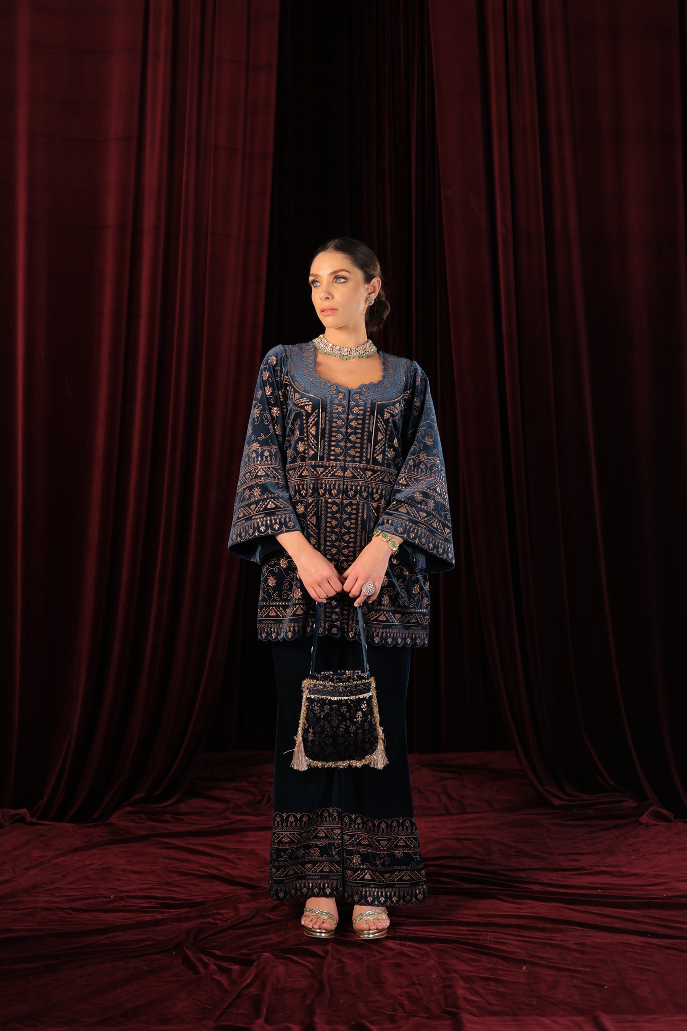 A must-have addition to your festive wardrobe, this Velvet Co-ord Set blends grace, comfort, and contemporary charm. Featuring an all-over printed pattern with intricate embroidery detailing, it exudes effortless sophistication. The rich velvet fabric offers a formal yet comfortable feel, perfect for wedding functions or festive gatherings. Each set comes with a matching potli bag, adding an Indo-Western touch that completes the look with finesse.