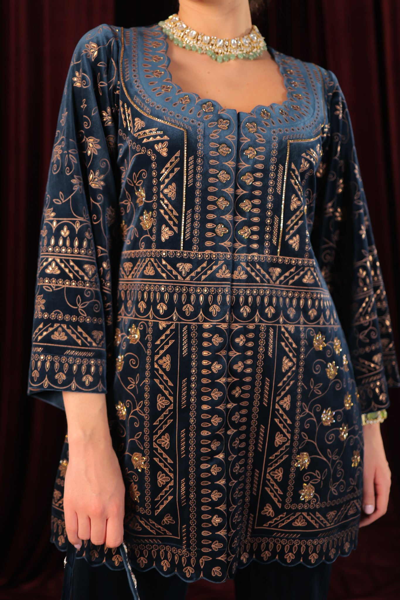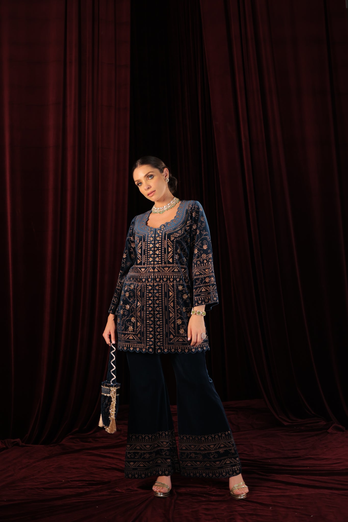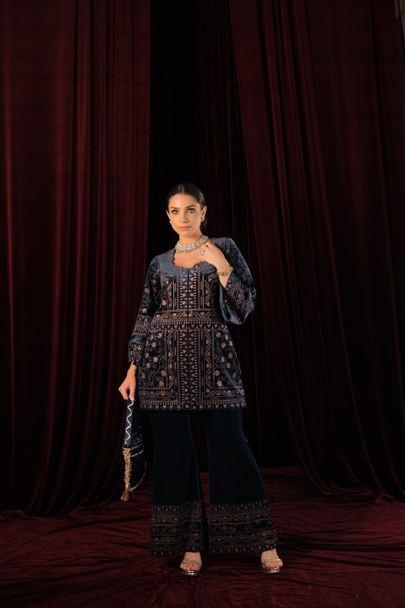 A must-have addition to your festive wardrobe, this Velvet Co-ord Set blends grace, comfort, and contemporary charm. Featuring an all-over printed pattern with intricate embroidery detailing, it exudes effortless sophistication. The rich velvet fabric offers a formal yet comfortable feel, perfect for wedding functions or festive gatherings. Each set comes with a matching potli bag, adding an Indo-Western touch that completes the look with finesse.