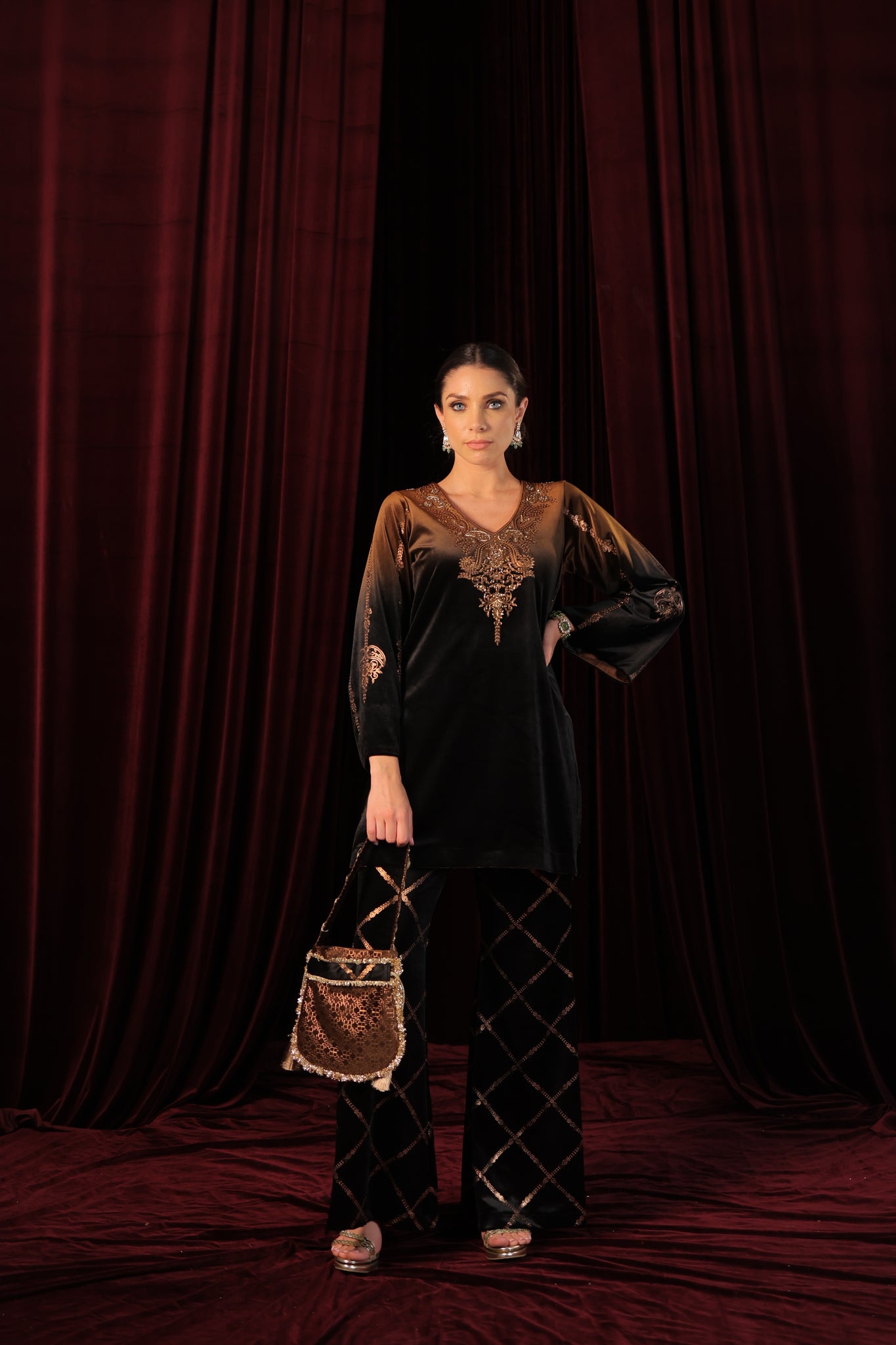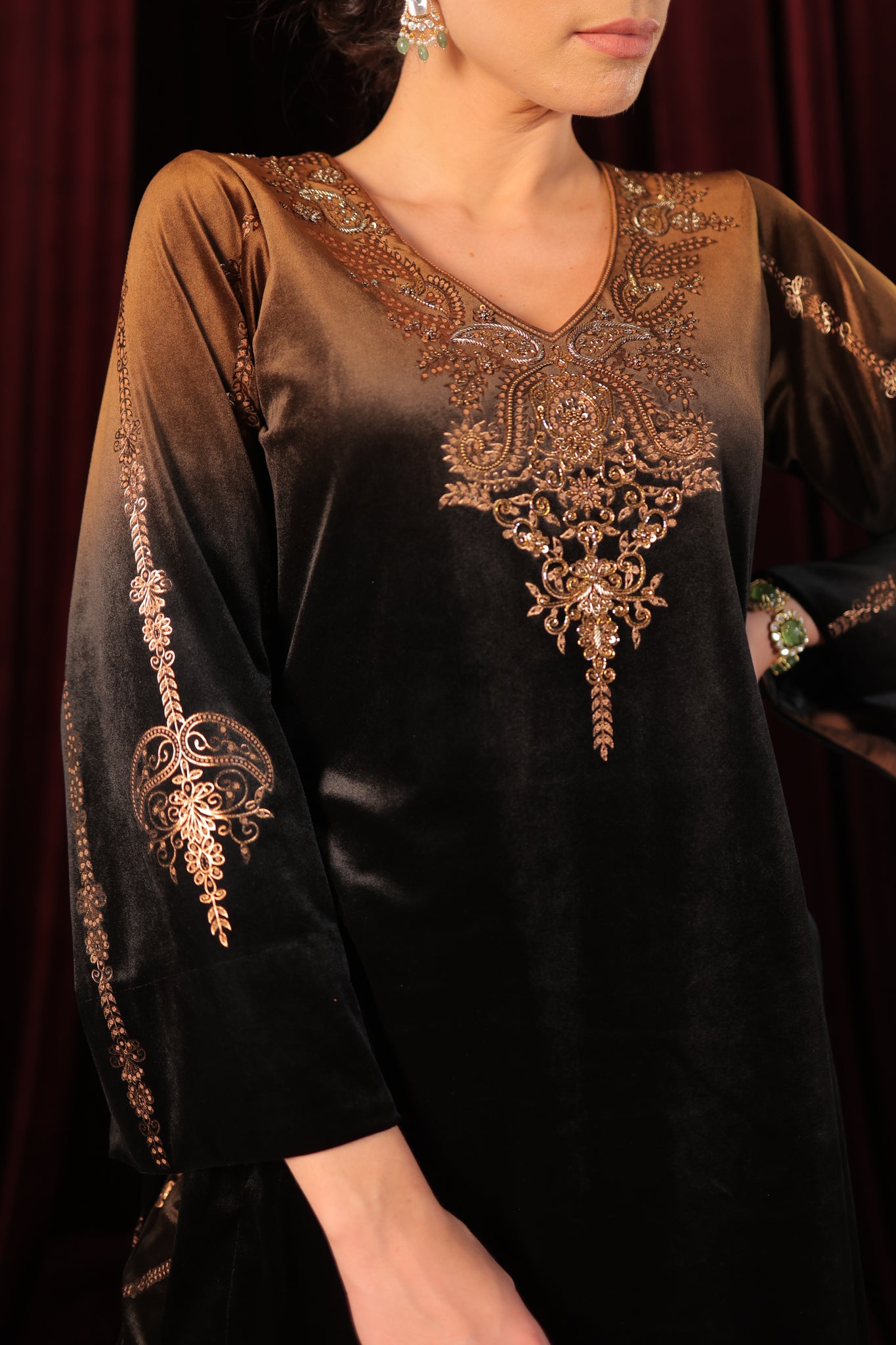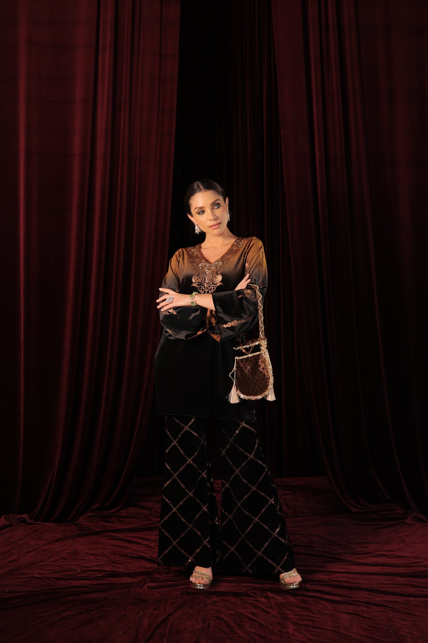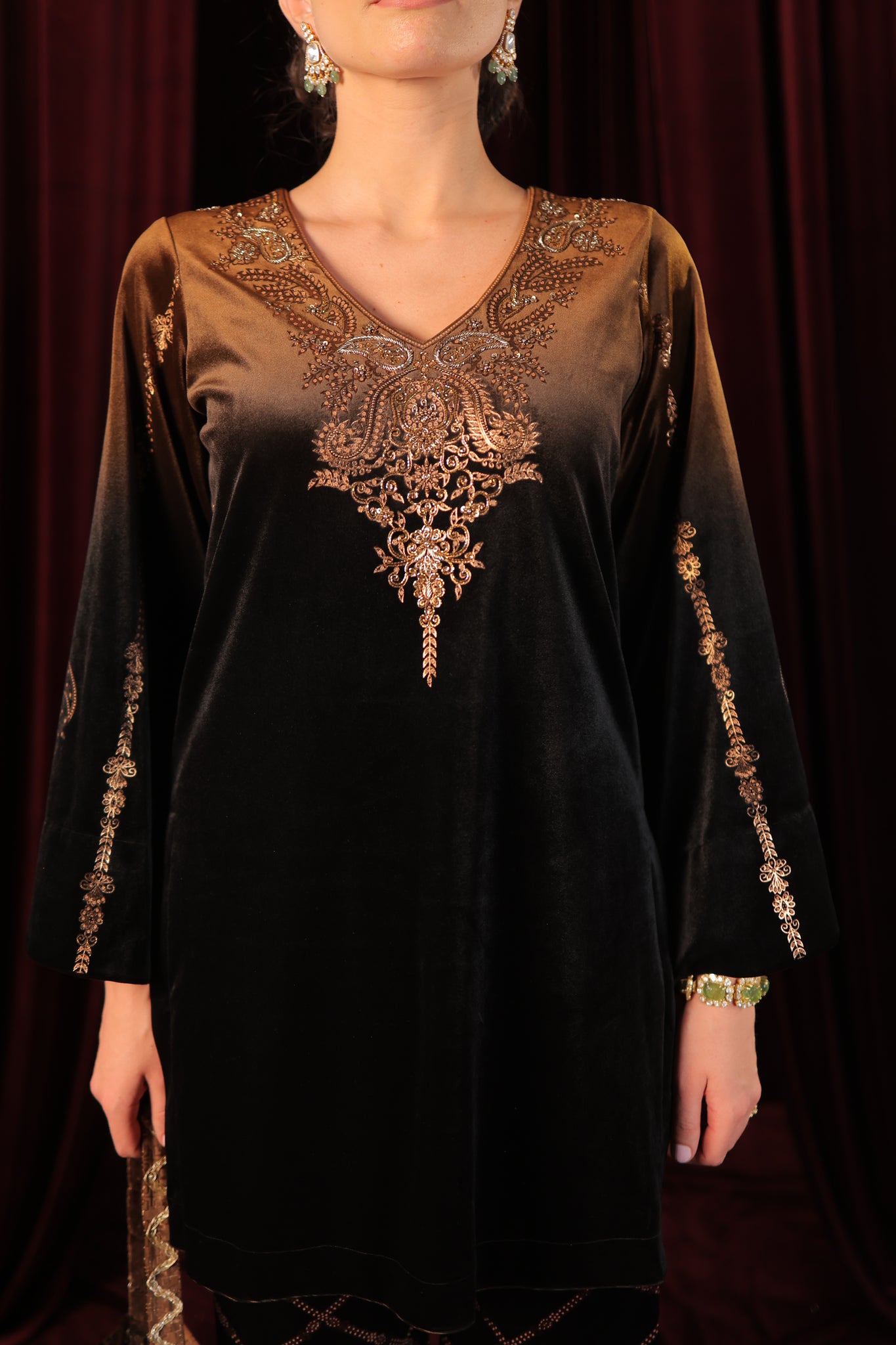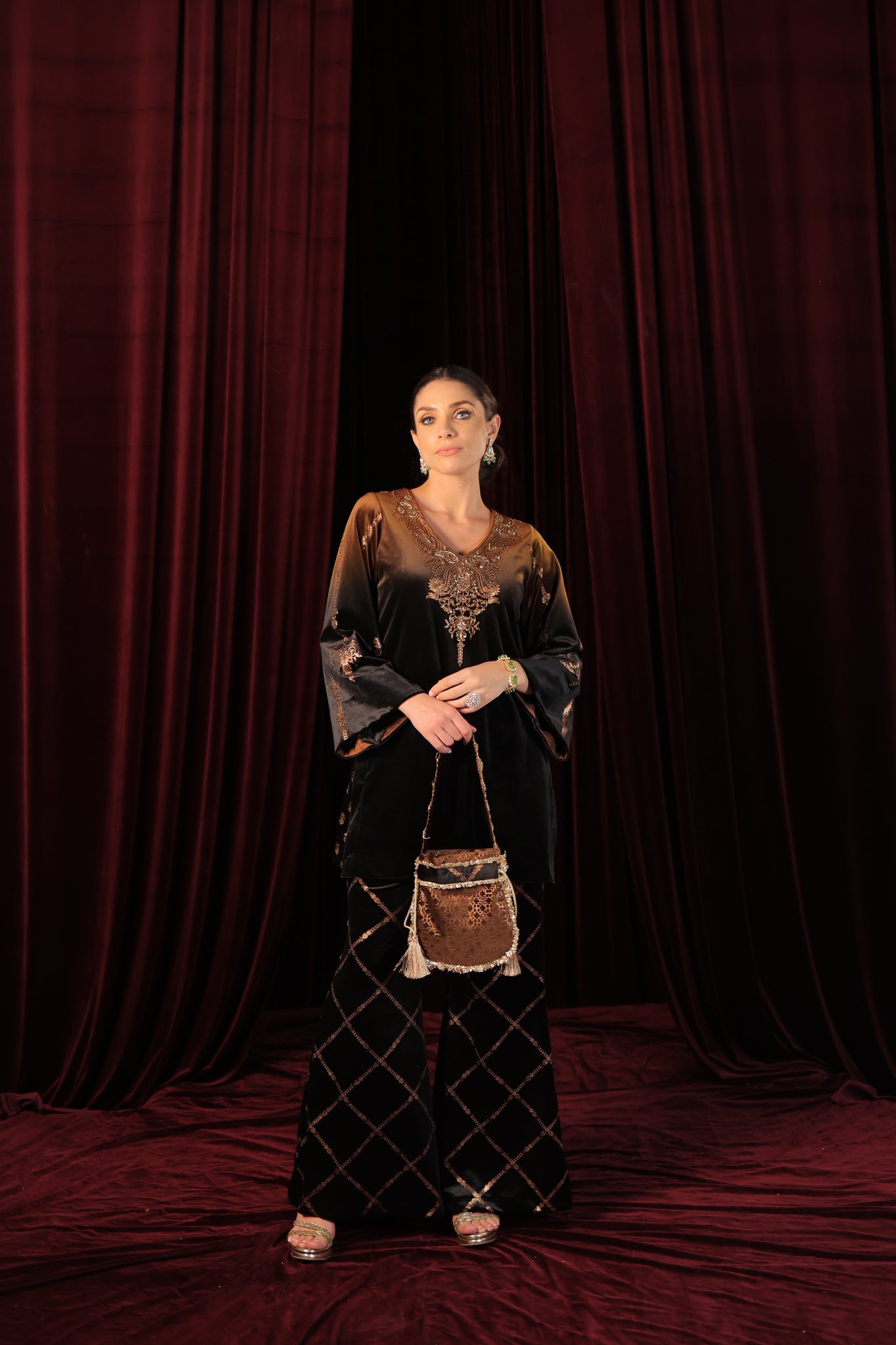 Make a statement this season with our exquisite Velvet Co-ord Set, crafted to bring together elegance and comfort. The ensemble features intricate embroidery detailing and beautiful printed patterns that add depth and charm to the rich velvet fabric....Read more