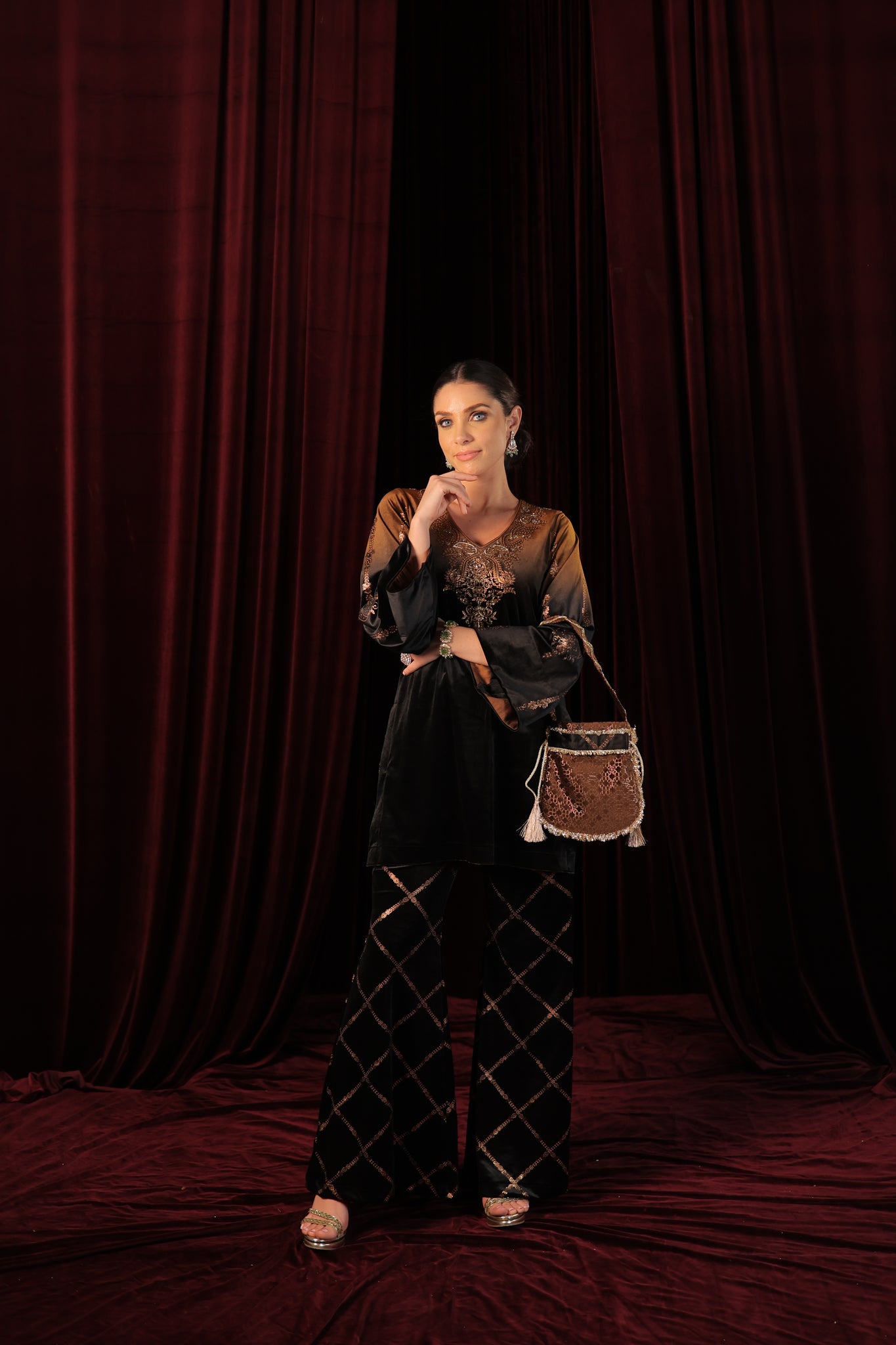 Make a statement this season with our exquisite Velvet Co-ord Set, crafted to bring together elegance and comfort. The ensemble features intricate embroidery detailing and beautiful printed patterns that add depth and charm to the rich velvet fabric. The abstract print on the pants enhances its contemporary appeal, making it a perfect choice for wedding festivities, evening celebrations, or any special occasion.
