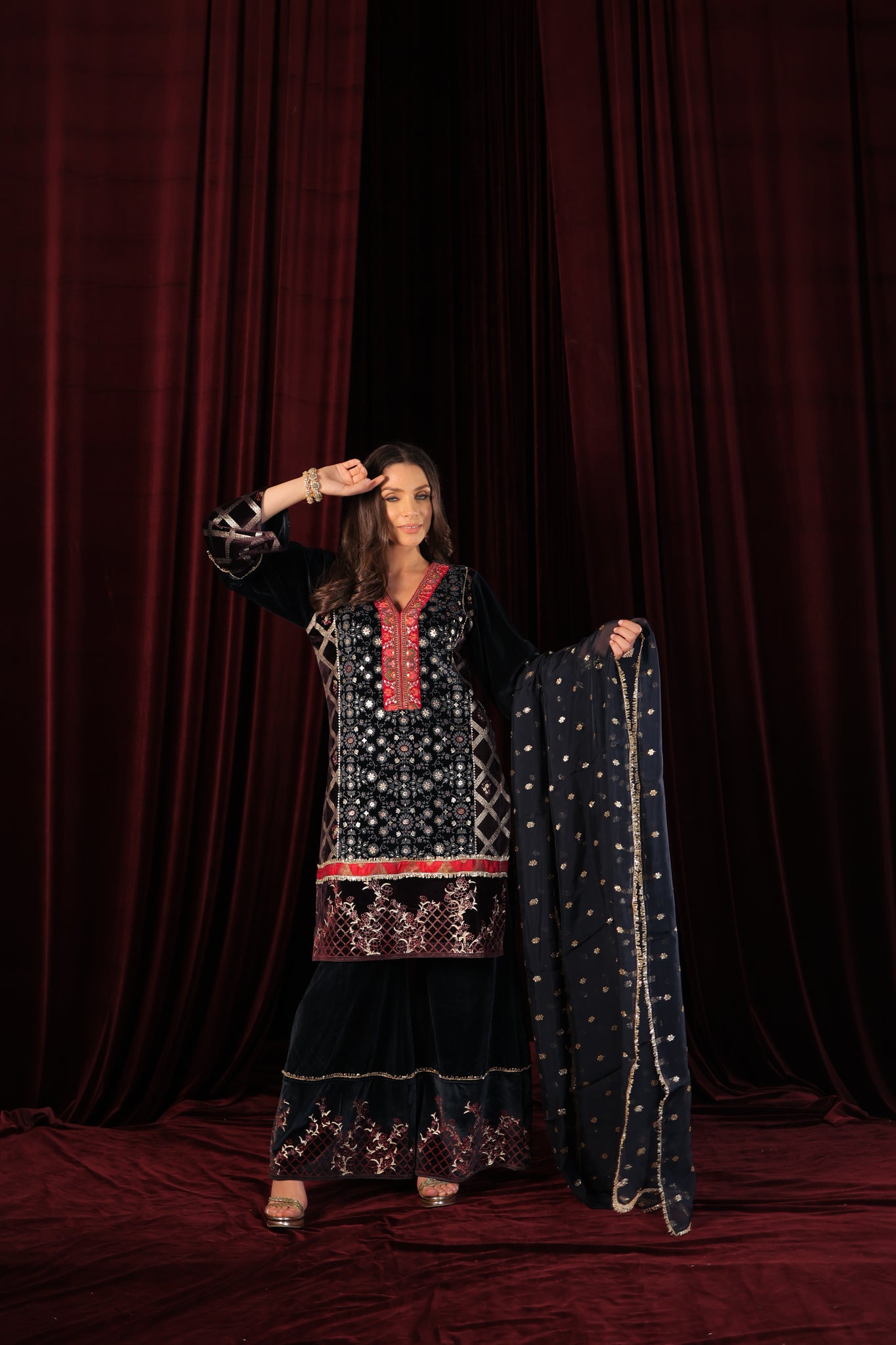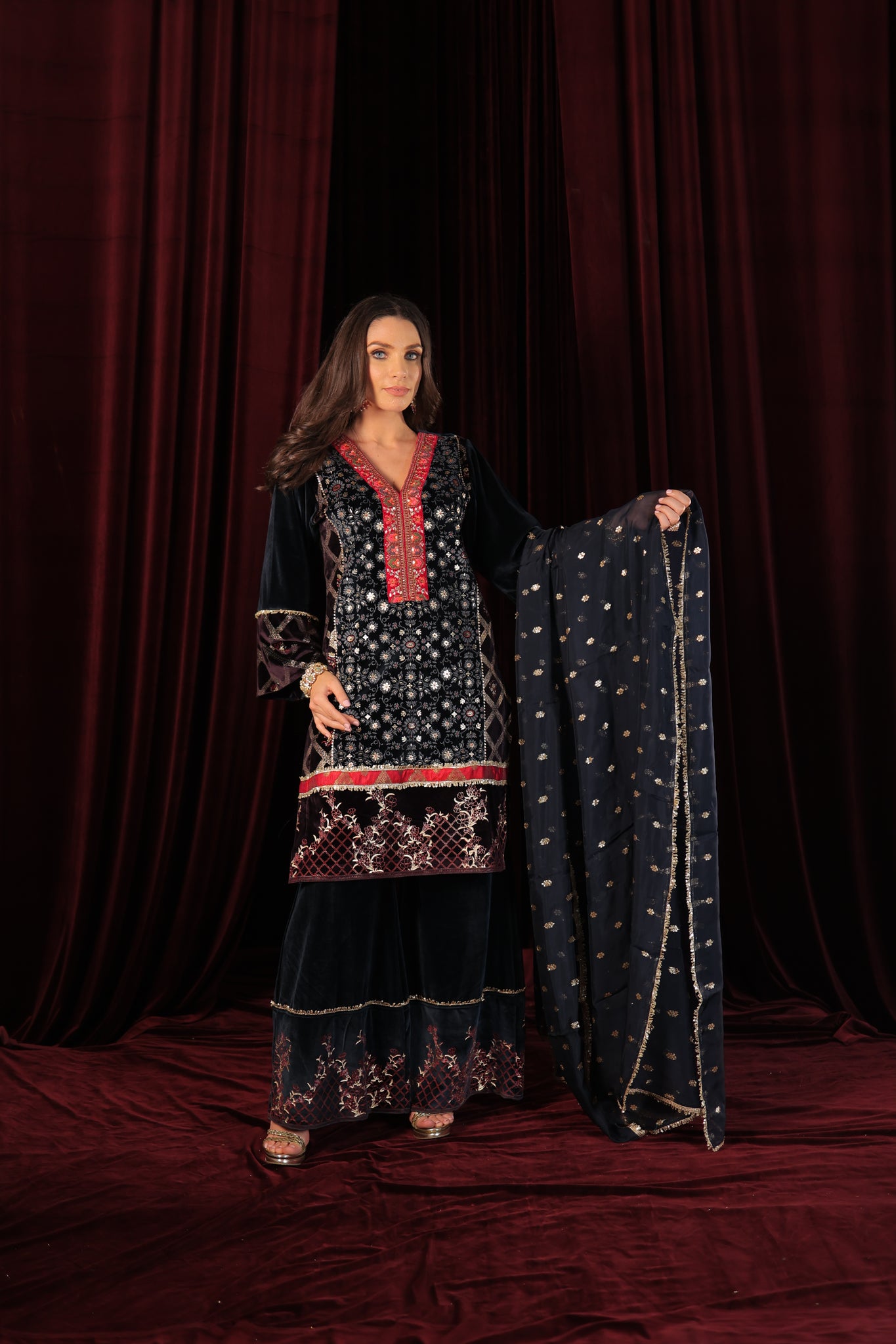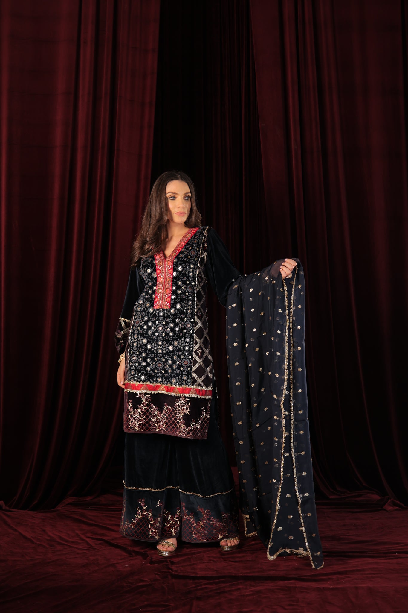 Make Heads Turn in our Air Force Suit Set, a perfect blend of tradition and contemporary charm. Featuring intricate handwork lace detailing on the neckline and delicate print accents, this ensemble exudes effortless grace. Paired with a Banarasi Chinon dupatta, it adds a luxurious touch, making it perfect for festive occasions, weddings, and special celebrations. Step out in style and let your elegance speak for itself.