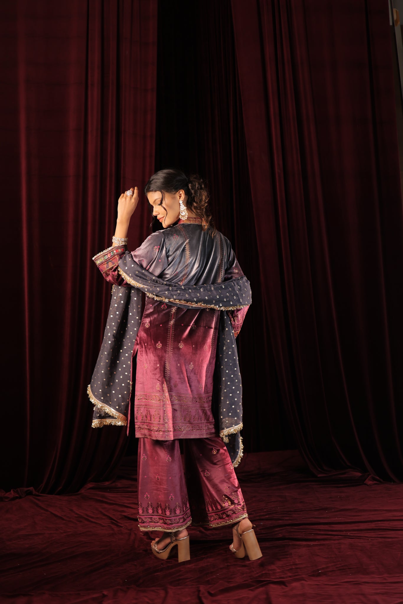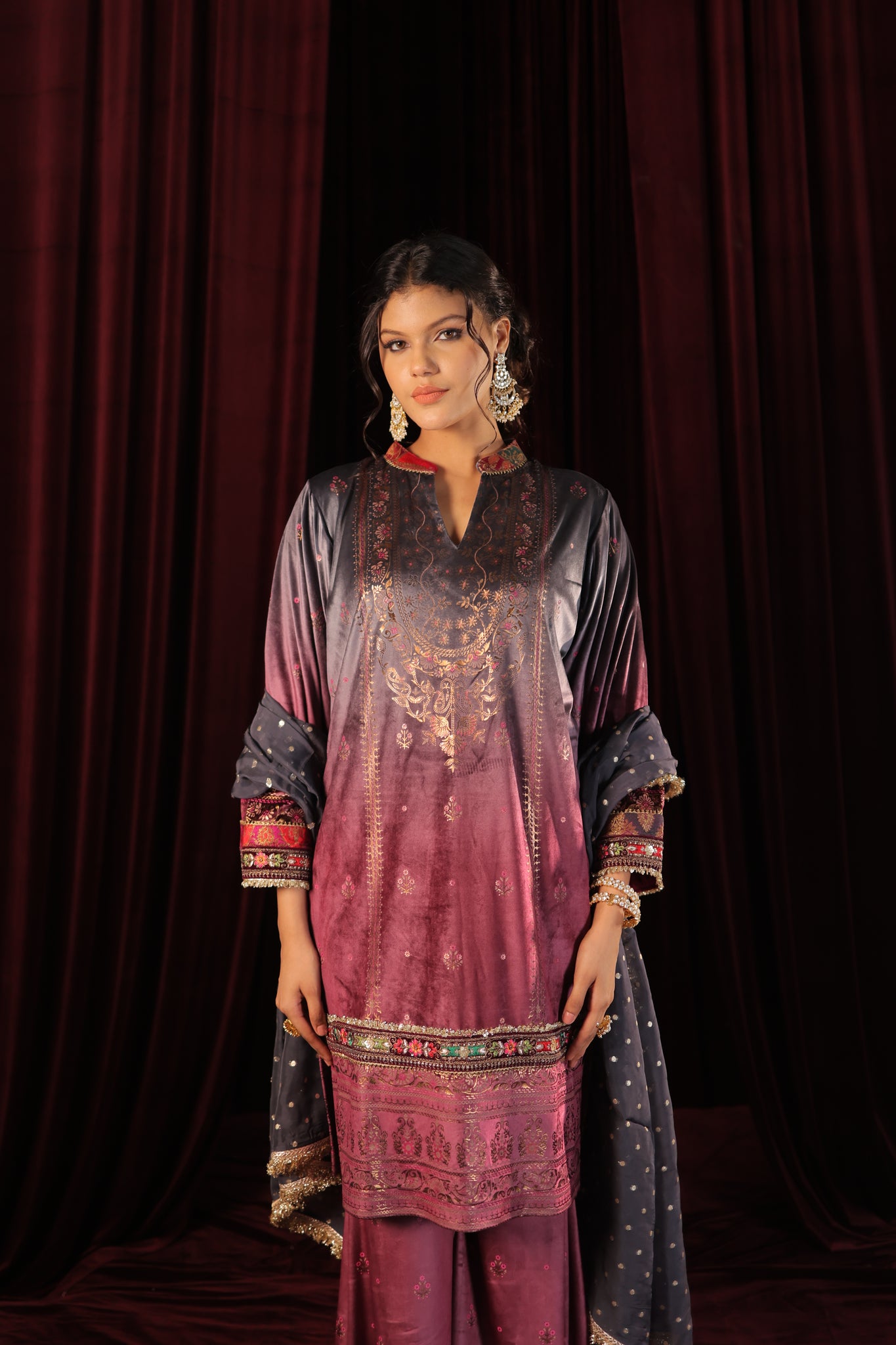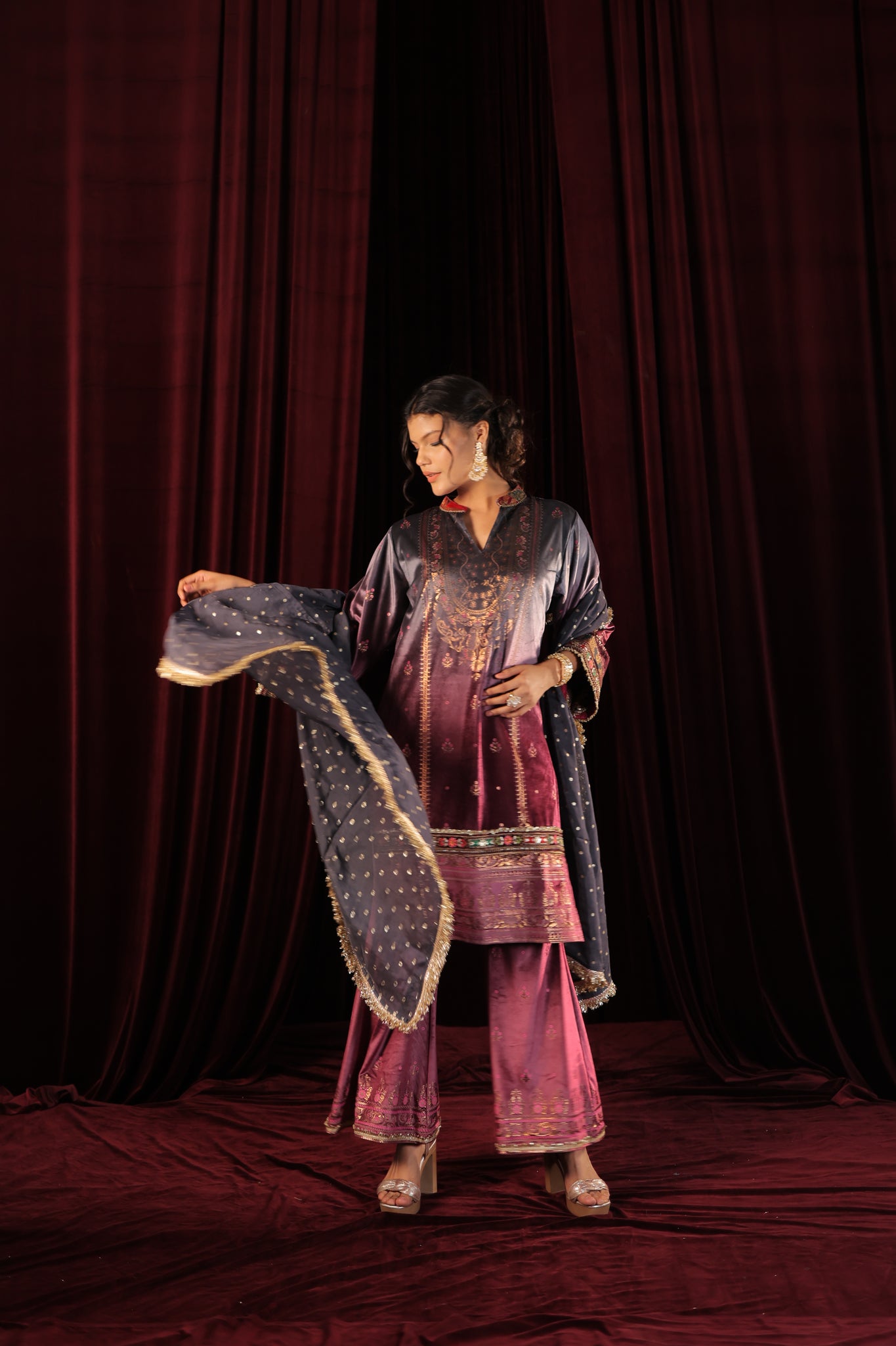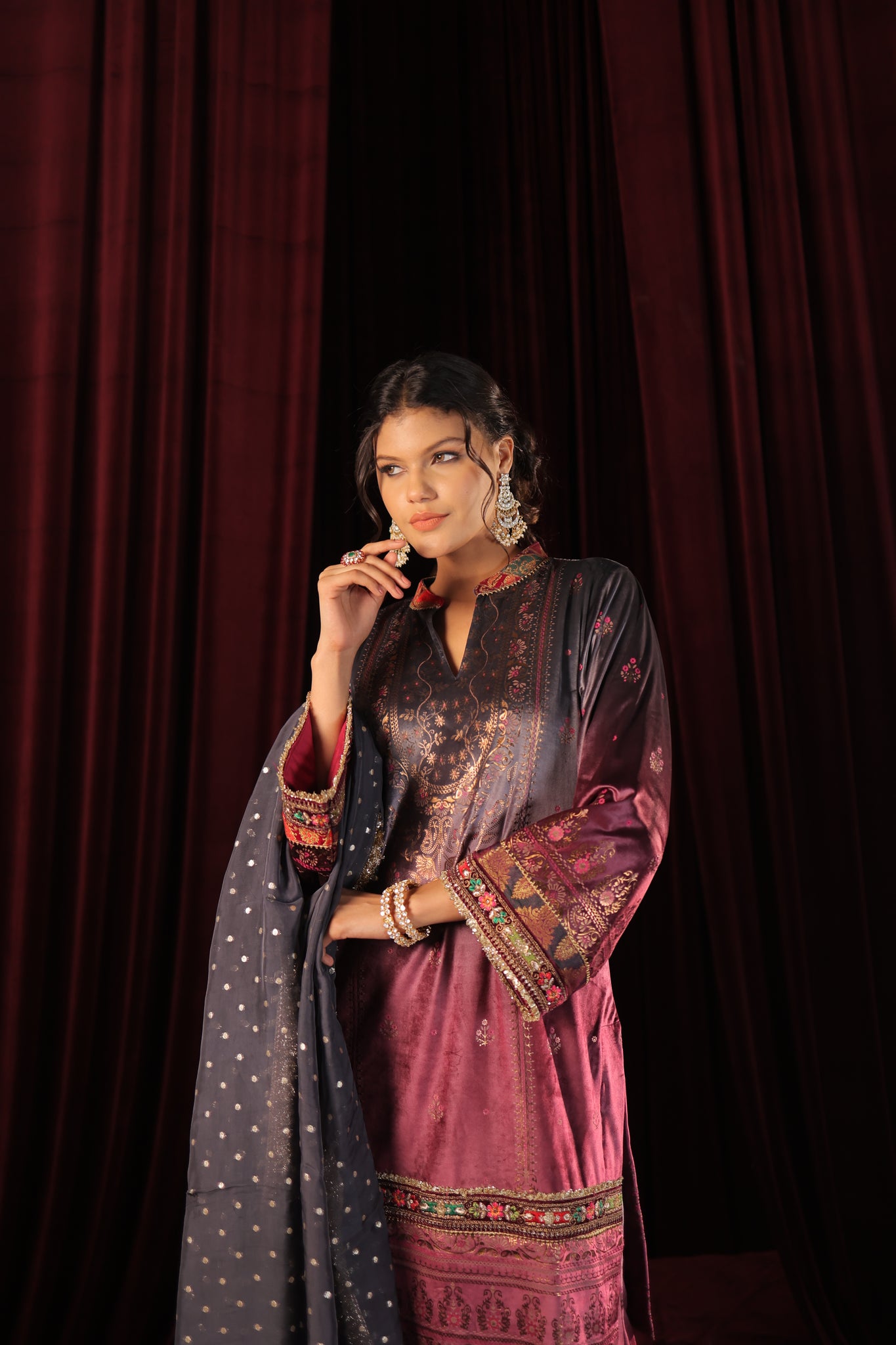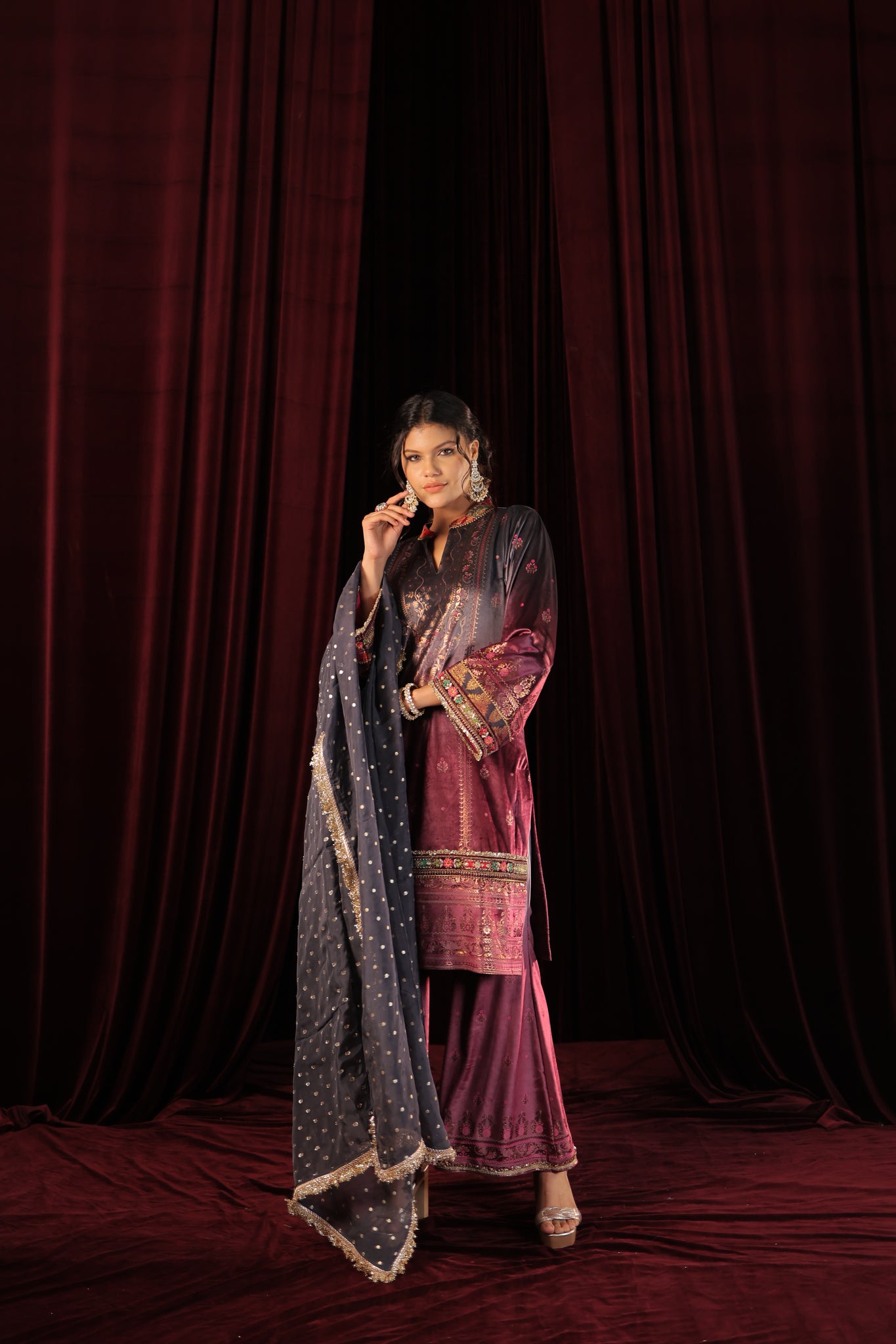 Elevate your festive wardrobe with this elegant Ombre Suit Set, featuring a stunning ombre print technique and intricate print detailing. Accented with delicate lacework, this ensemble exudes grace and sophistication, making it perfect for weddings and special occasions.