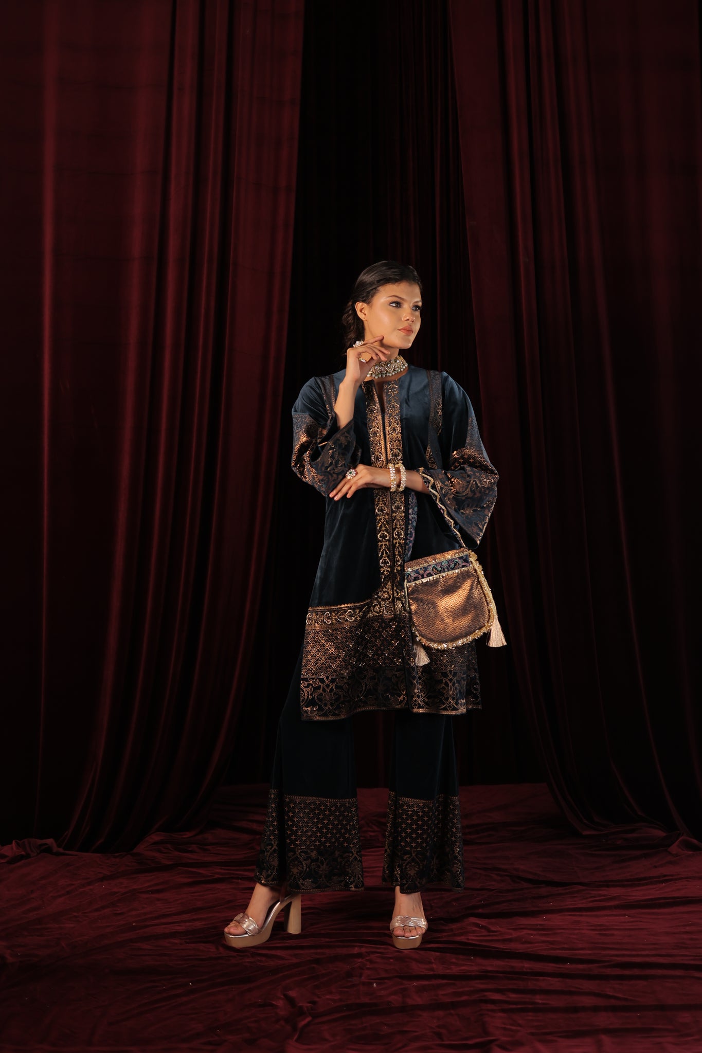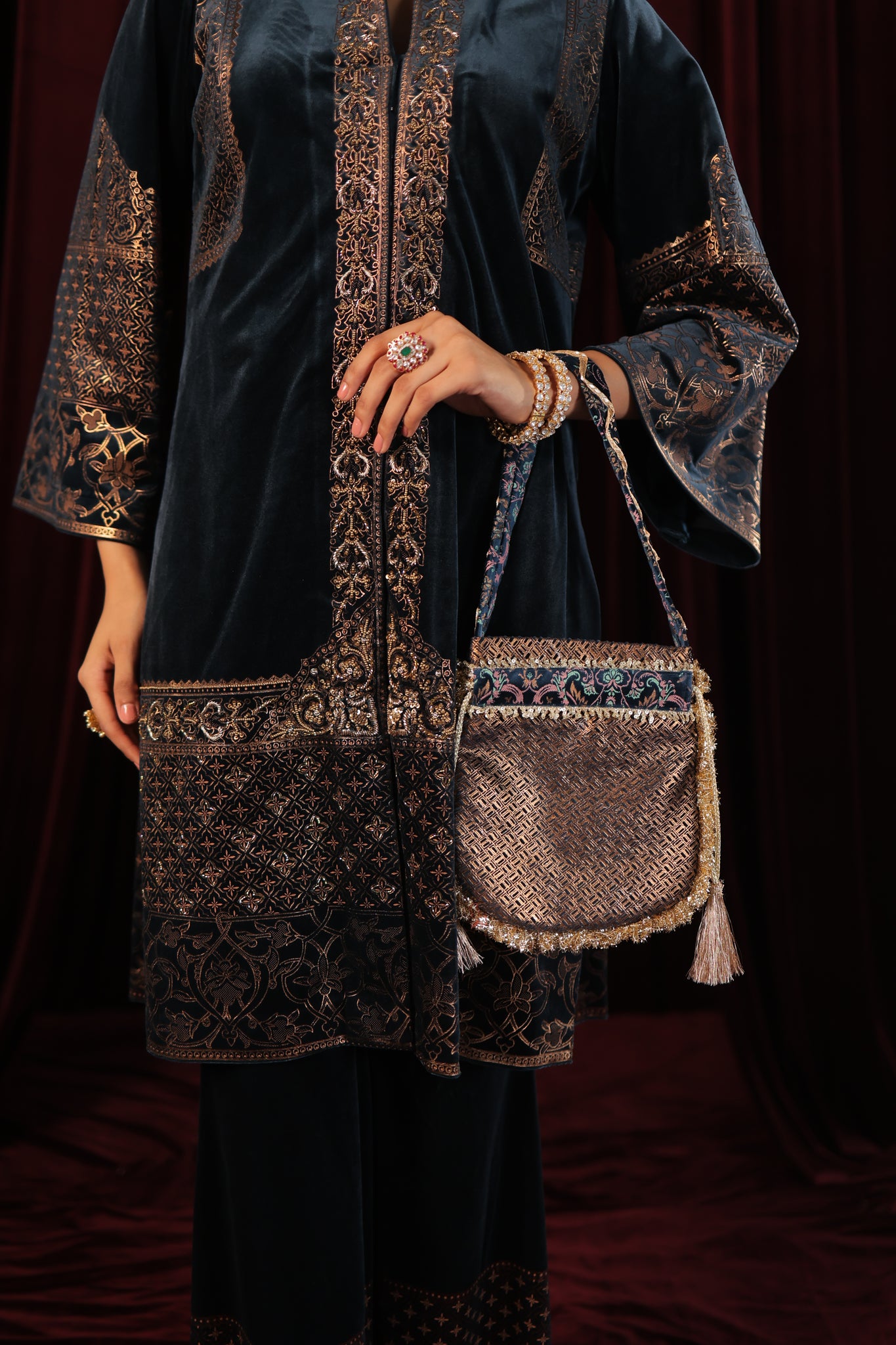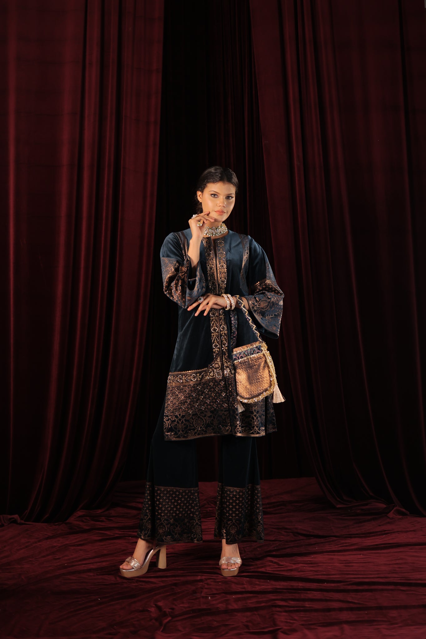 must-have addition to your festive wardrobe, this Velvet Co-ord Set from YOUR MINE STORY blends grace, comfort, and contemporary charm. Featuring an all-over printed pattern with intricate embroidery detailing, it exudes effortless sophistication. The rich velvet fabric offers a formal yet comfortable feel, perfect for wedding functions or festive gatherings. Each set comes with a matching potli bag, adding an Indo-Western touch that completes the look with finesse.