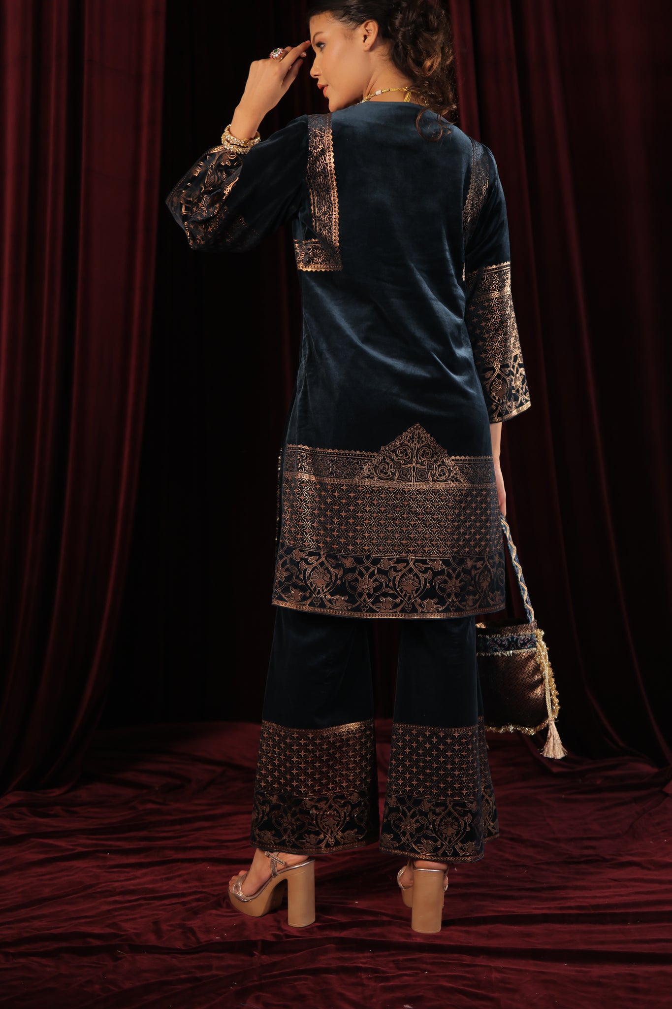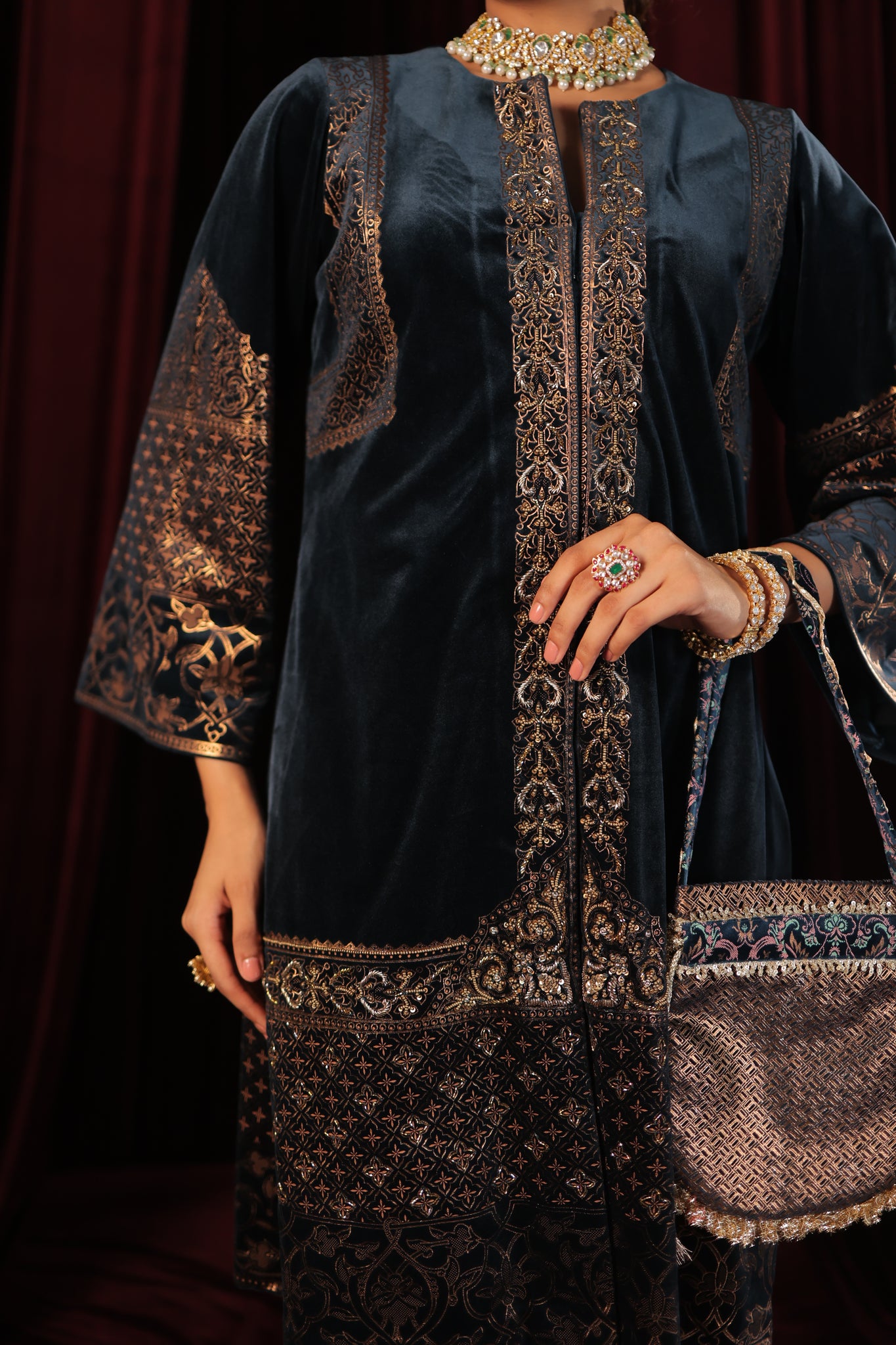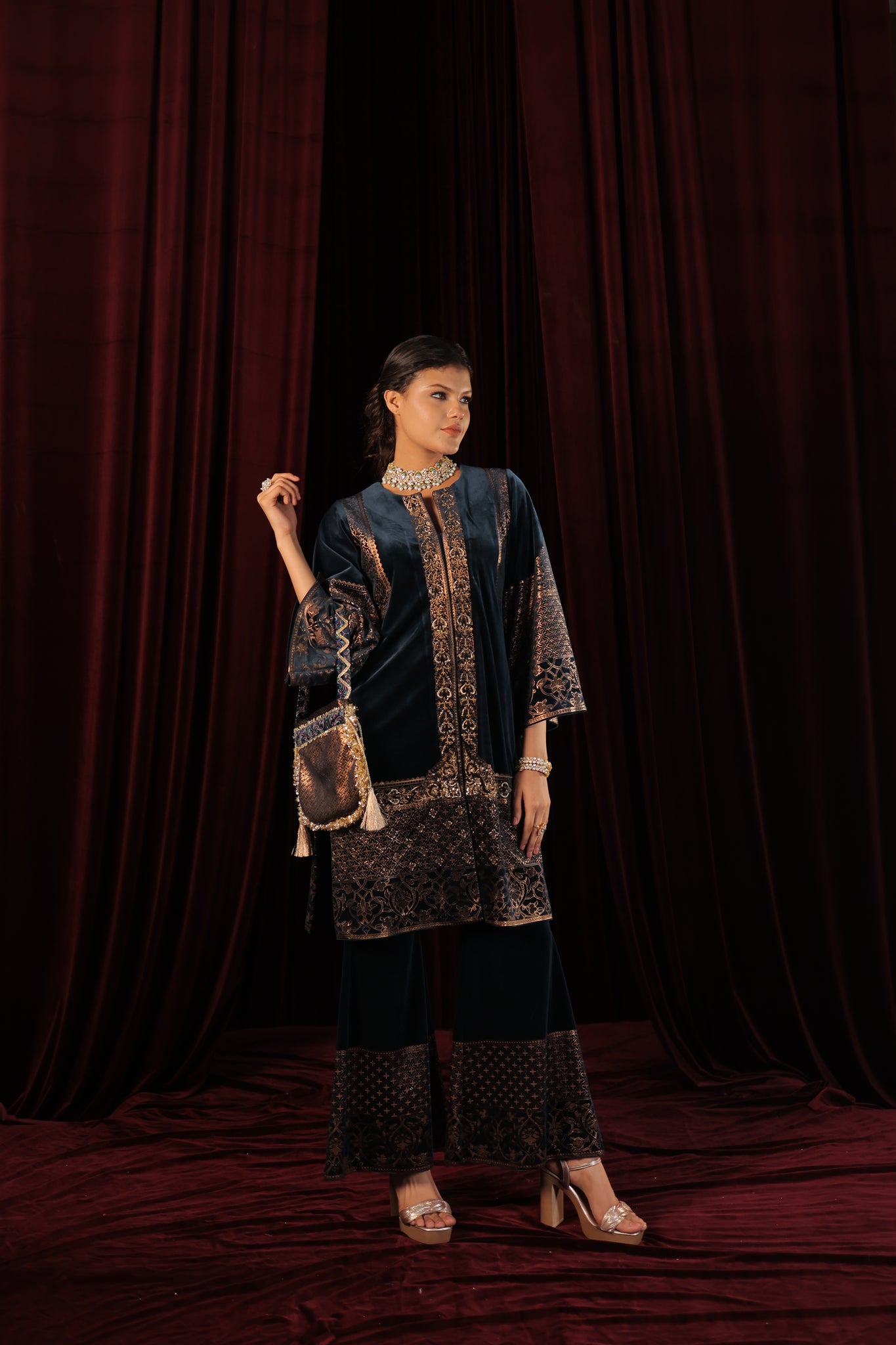 must-have addition to your festive wardrobe, this Velvet Co-ord Set from YOUR MINE STORY blends grace, comfort, and contemporary charm. Featuring an all-over printed pattern with intricate embroidery detailing, it exudes effortless sophistication. The rich velvet fabric offers a formal yet comfortable feel, perfect for wedding functions or festive gatherings. Each set comes with a matching potli bag, adding an Indo-Western touch that completes the look with finesse.