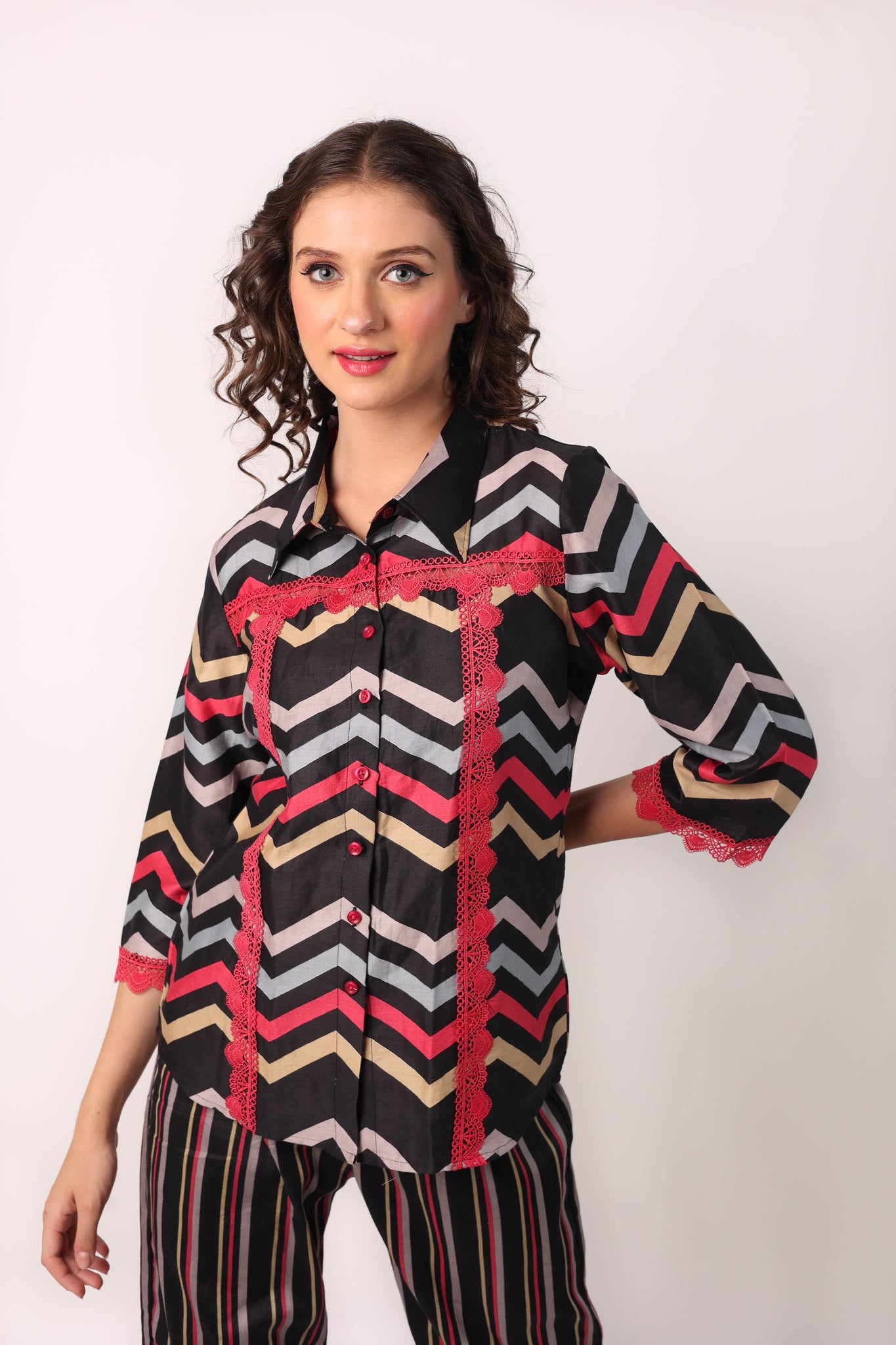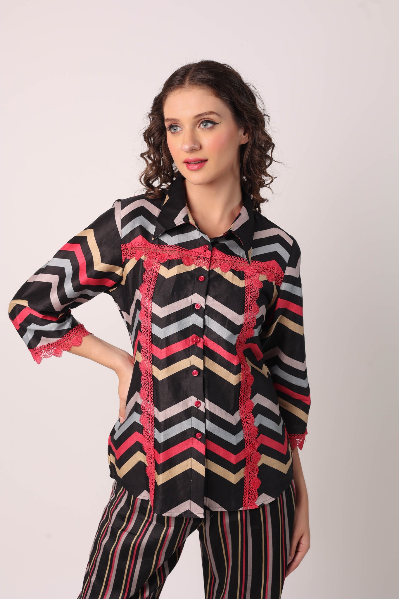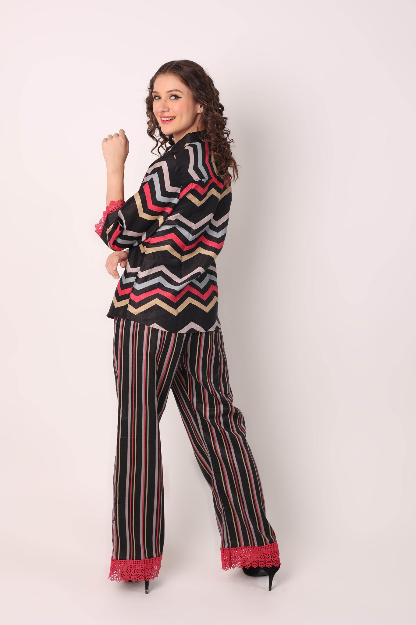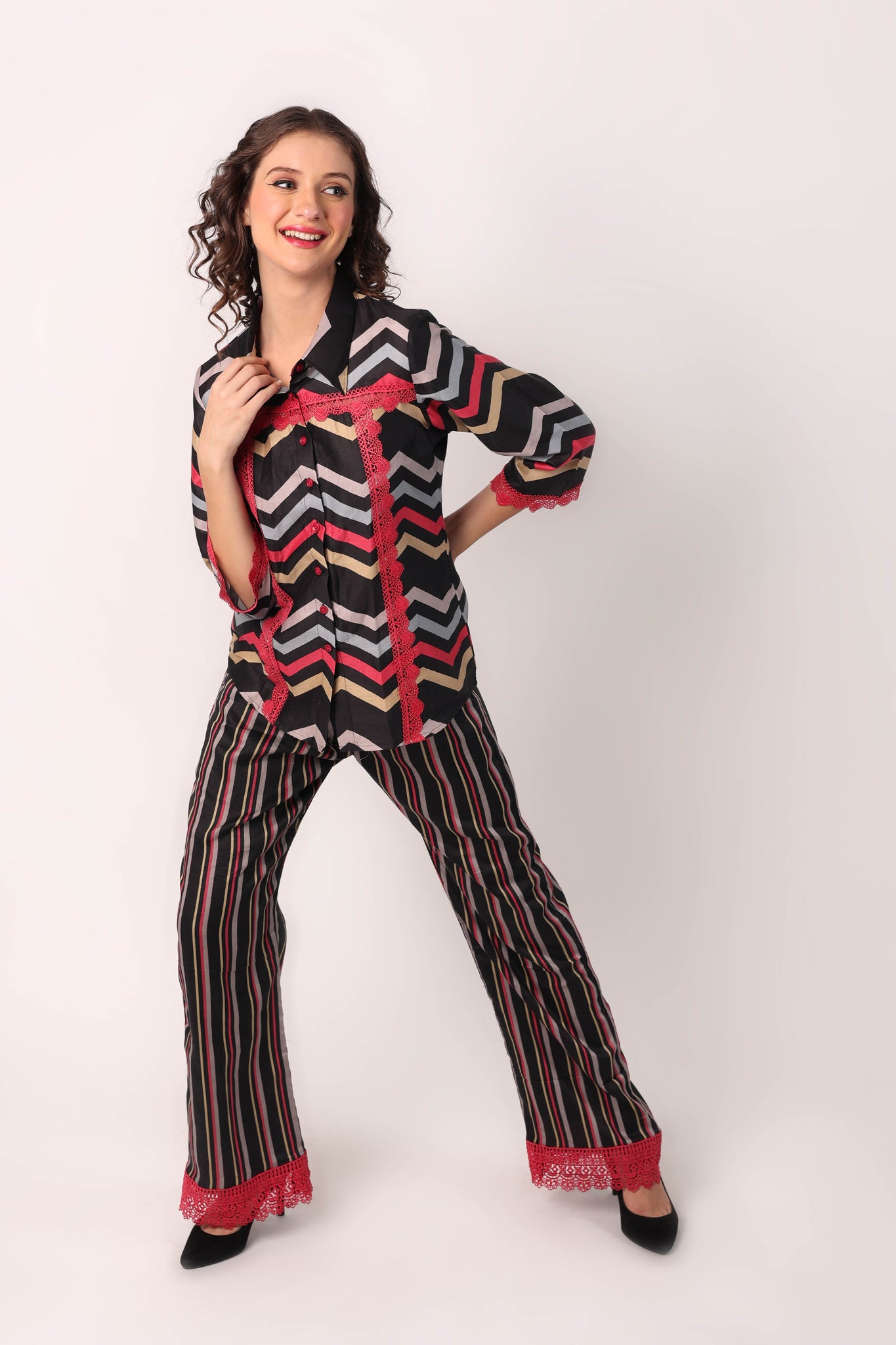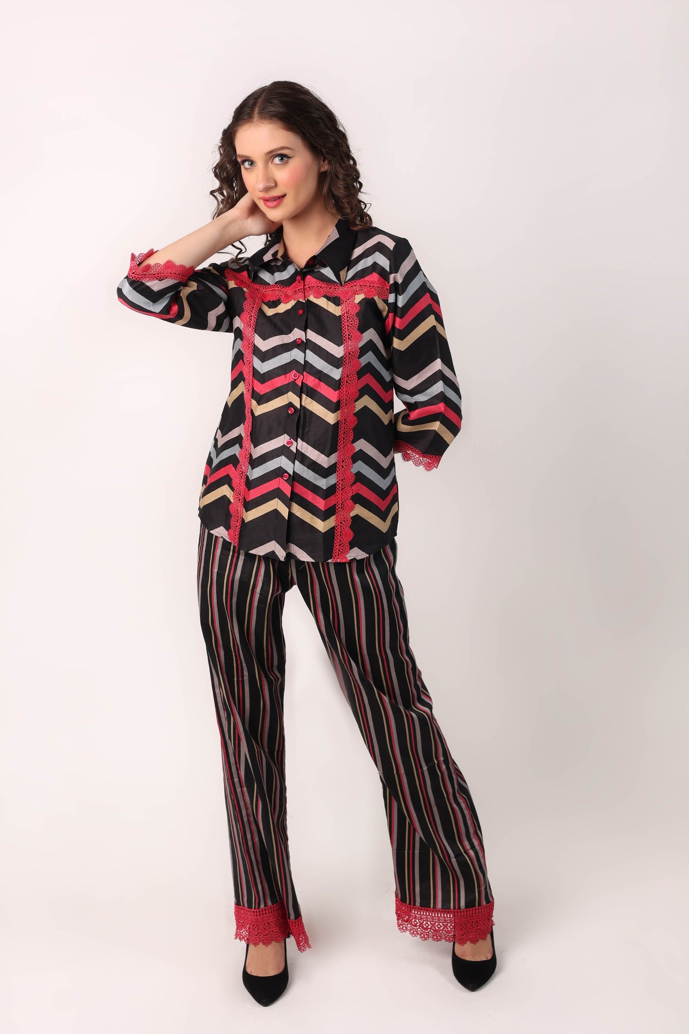 THIS COTTON COORD SET WITH BEAUTIFUL PRINT AND LACE EMBELLISHMENTS IS THE IDEAL CHOICE WHETHER YOU WANT TO DRESS IT UP FOR AN EVENING OUTFIT OR CURL UP ON THE COUCH! IF YOU NEED ANY CUSTOMIZATION WITH REGARD TO INCREASING TOP LENGTH, YOU CAN LET US KNOW IN THE NOTES SECTION BEFORE CHECKOUT.