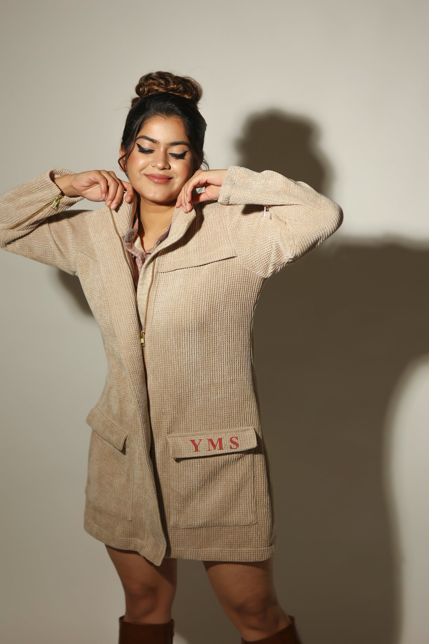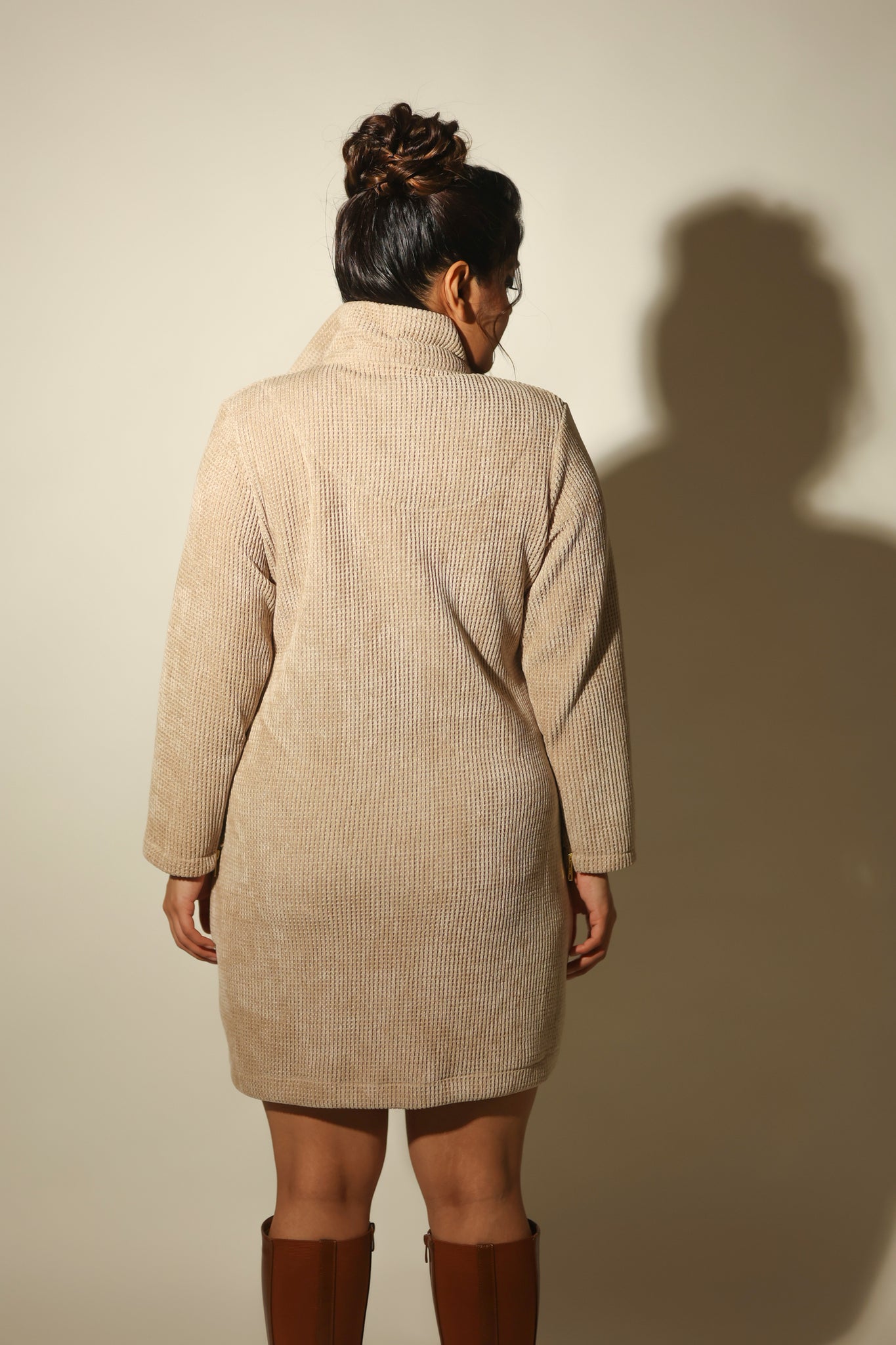 THIS KNEE LENGTH WOOLEN DRESS FEATURING FRONT GOLD ZIPPER DETAILING AND POCKETS MAKES IT LOOK ALL CLASSIC AND ELEGANT! THE PRINTED ADD-ON ATTACHED TO THE COLLAR MAKES IT UNIQUE ON ITS OWN. PAIR IT UP WITH YOUR BOOTS AND YOU ARE GOOD TO GO!