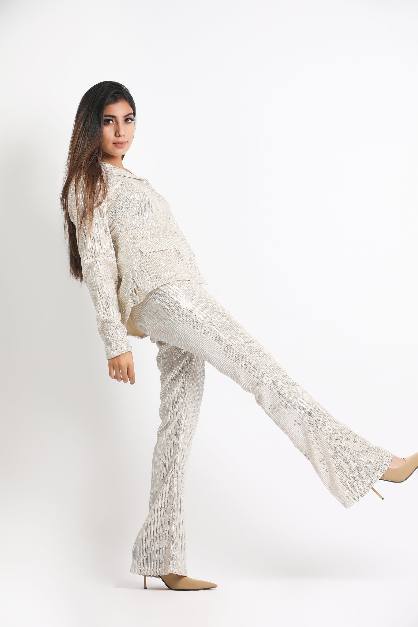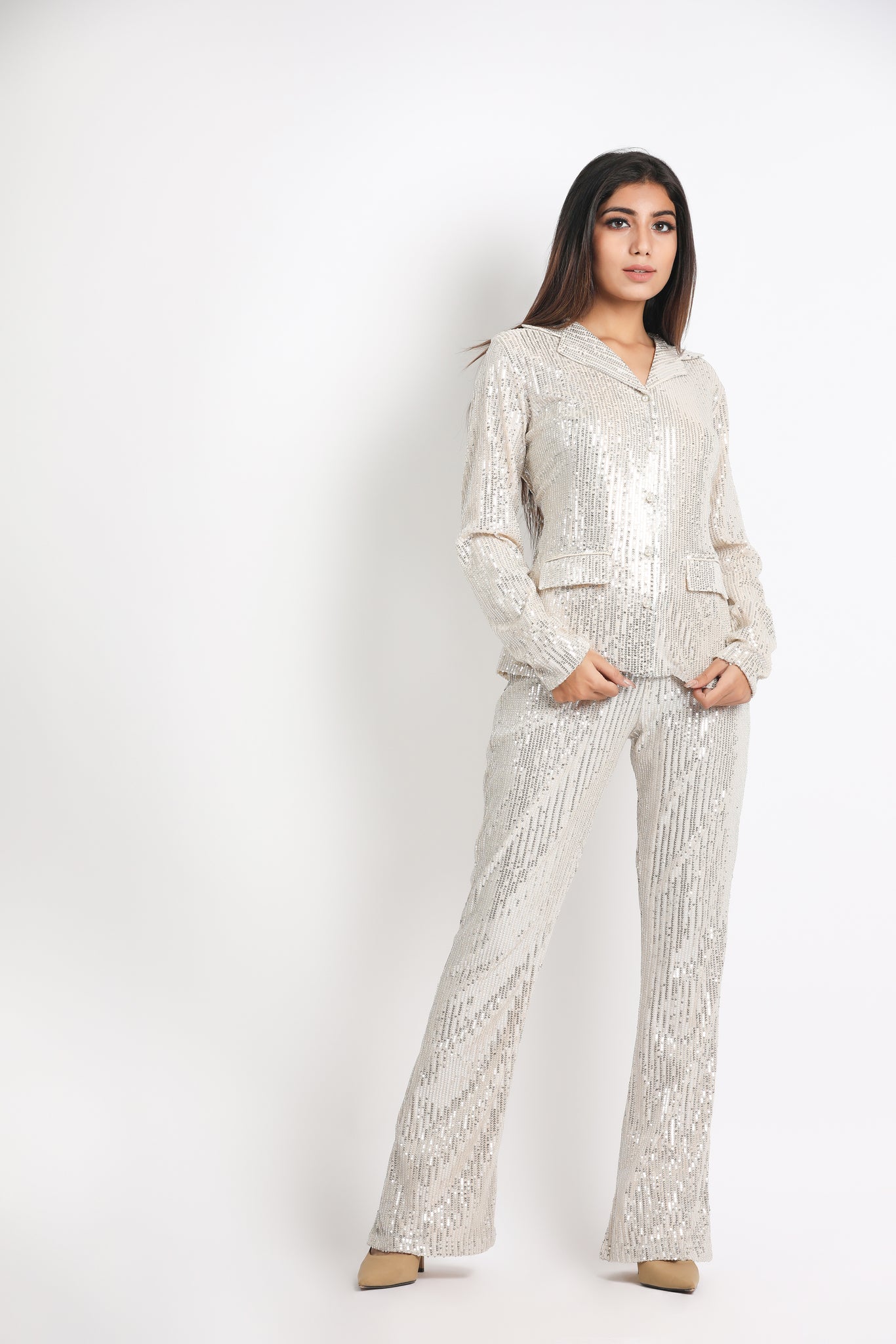 Glam up your party outfit in this silver sequin Pants suit.