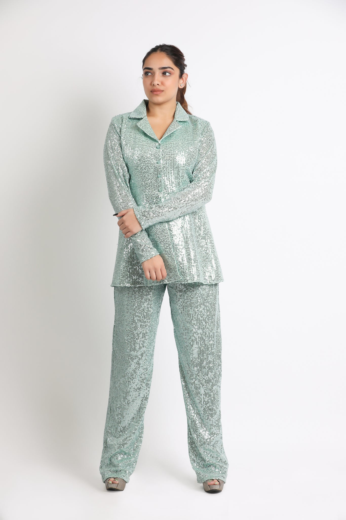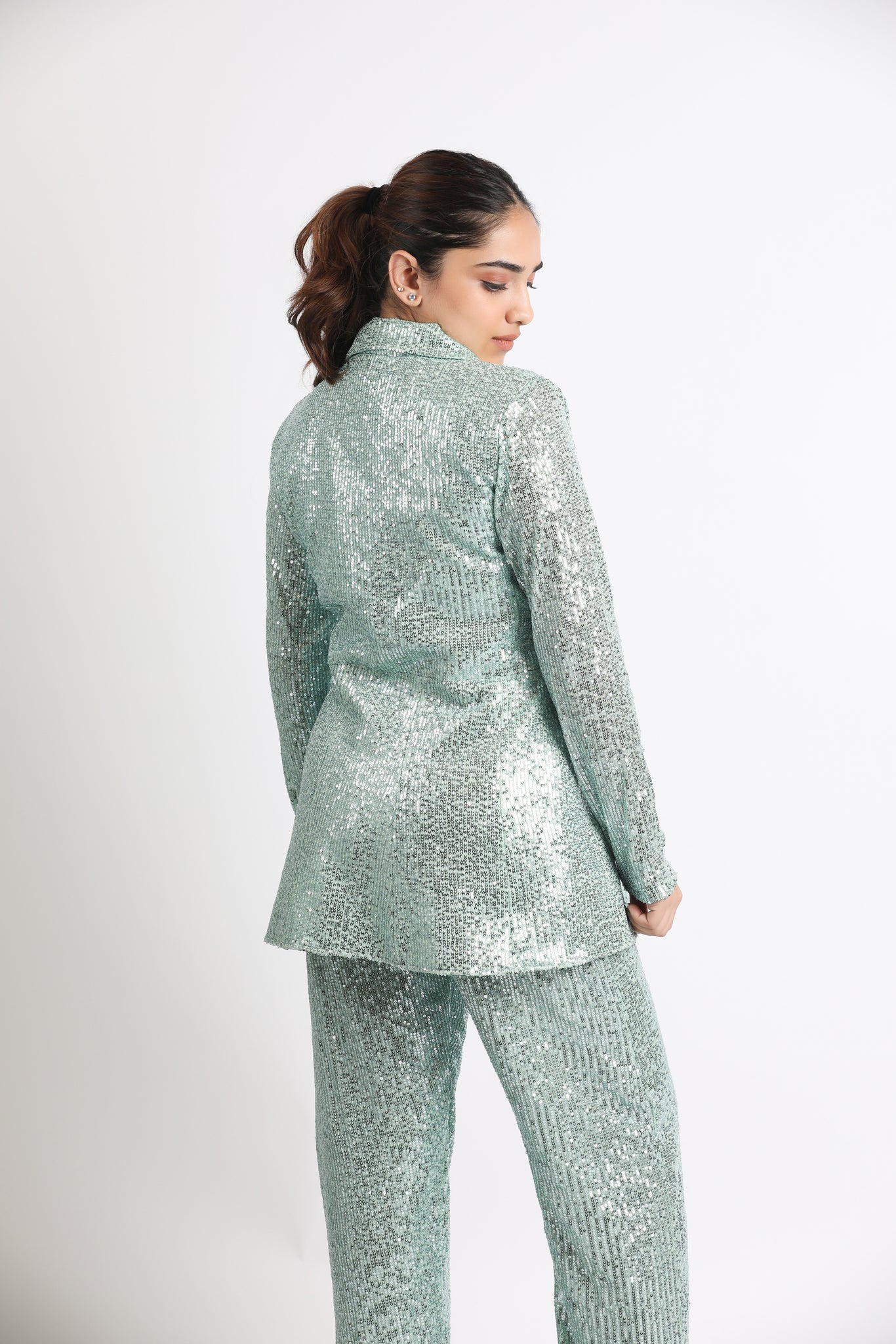Change the fashion game with THIS mint sequin Pant suit this winter. it's time to ditch your boring clothes!