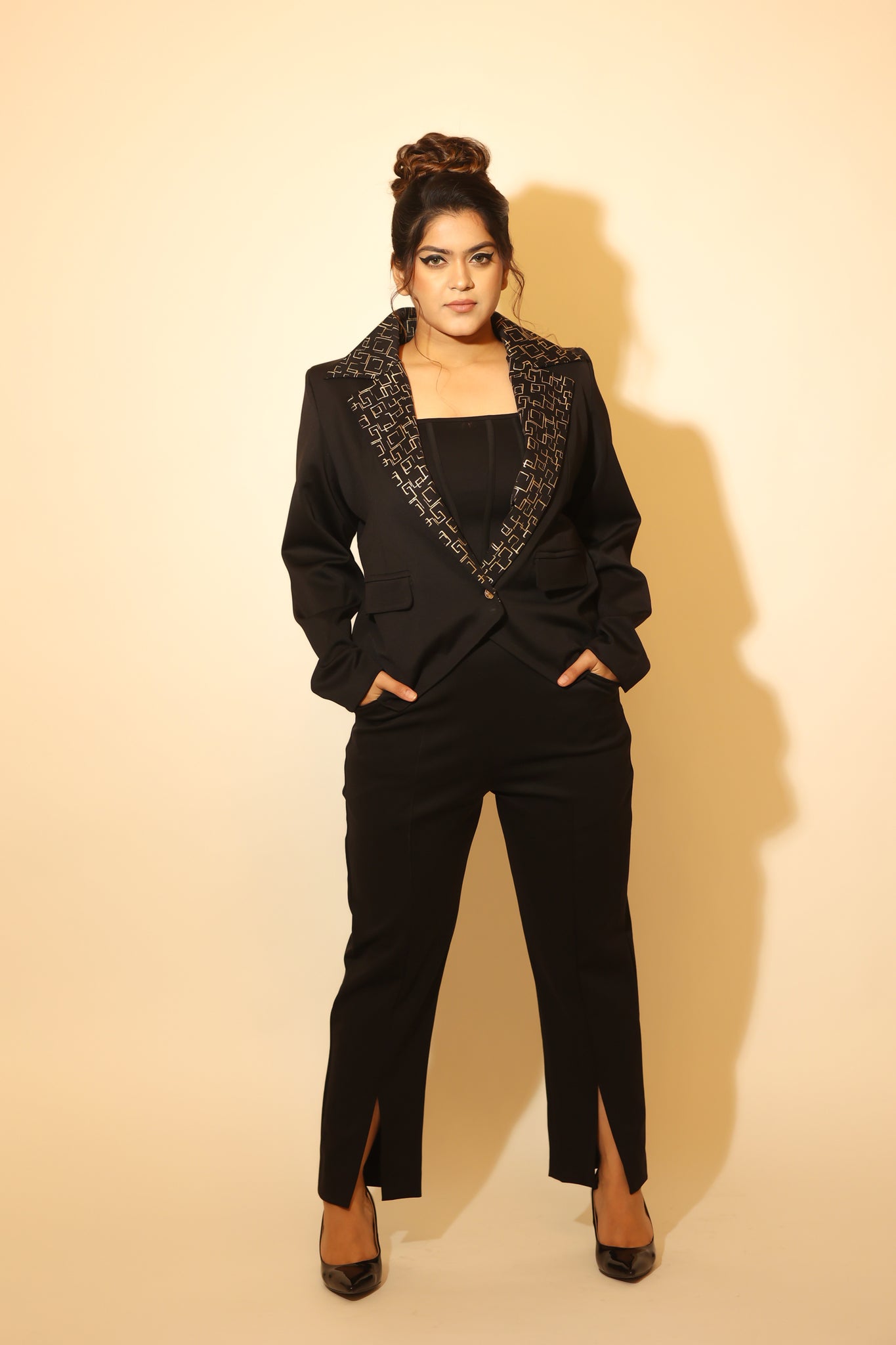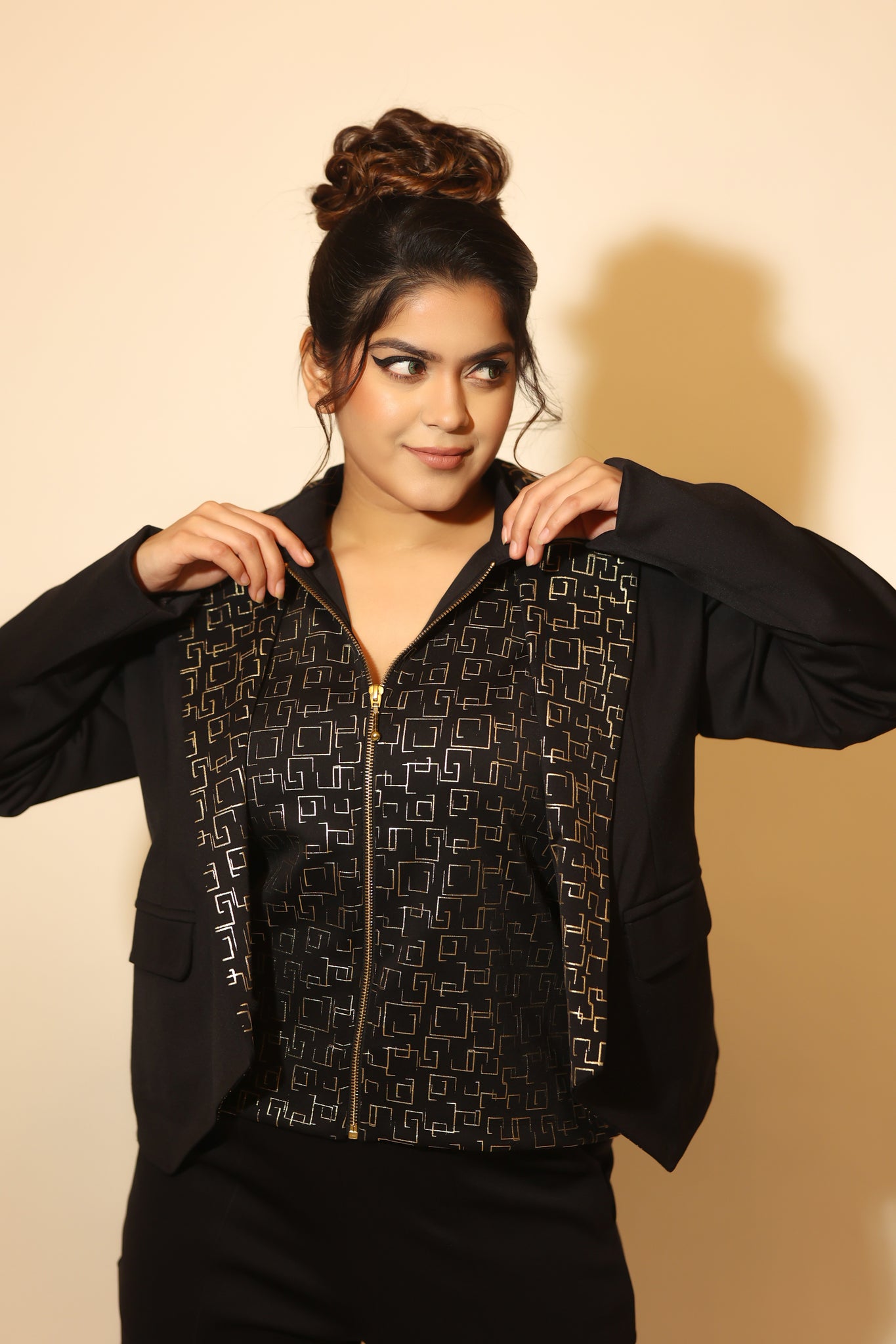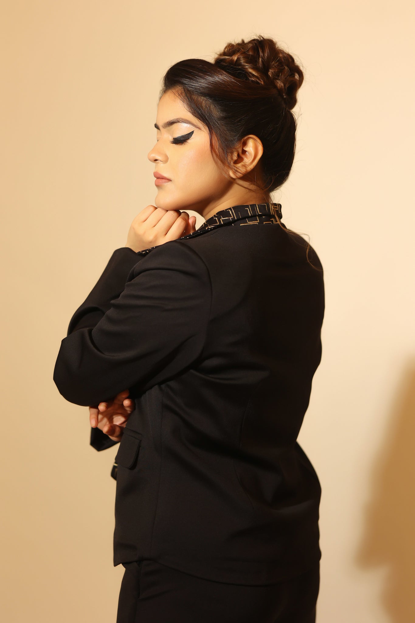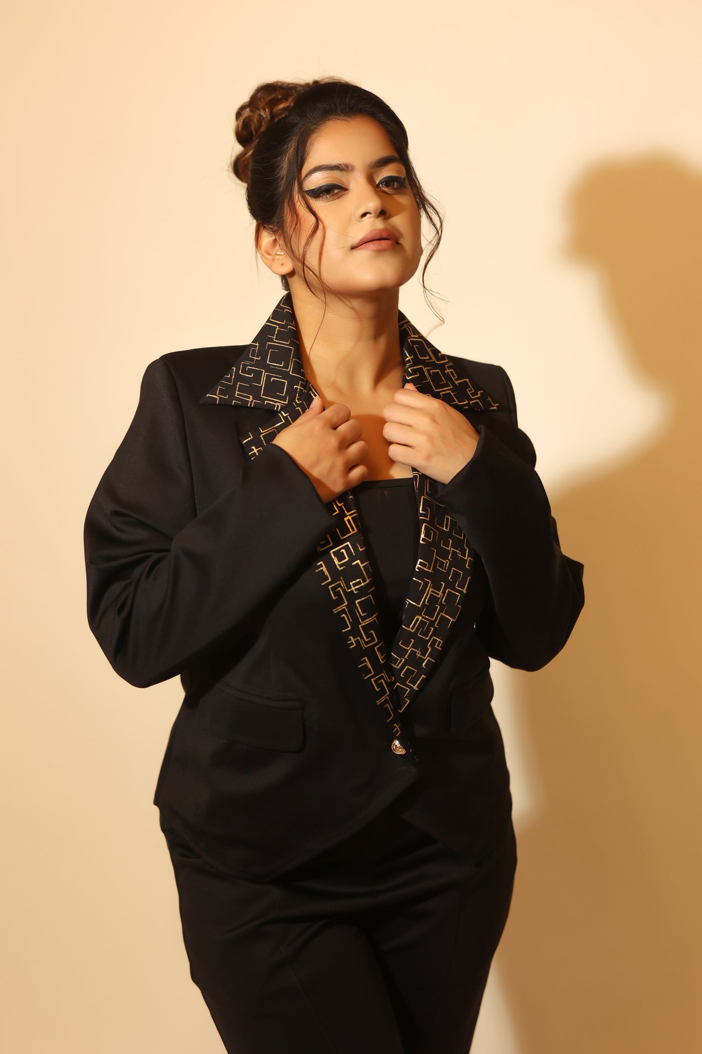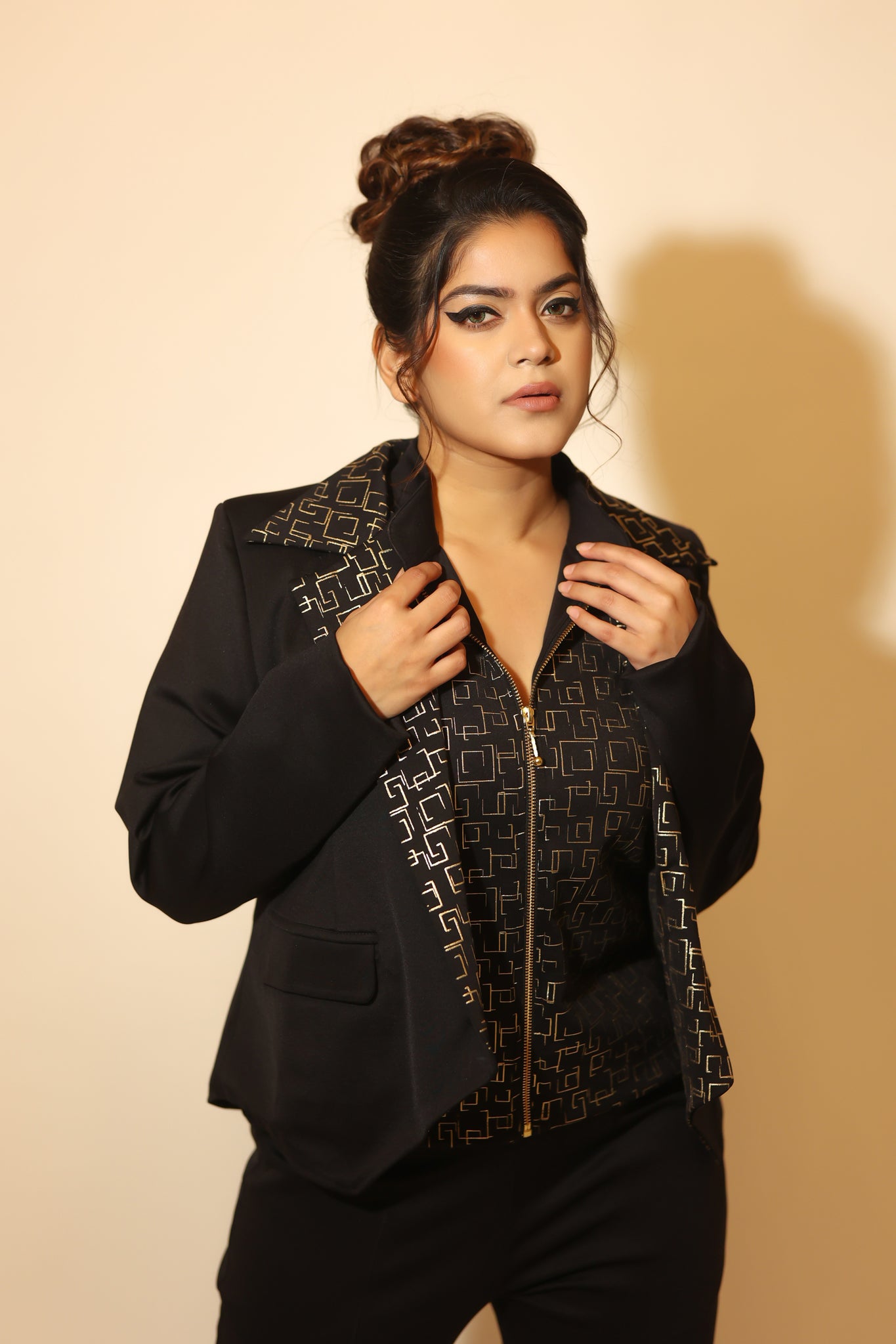 THE GEOMETRIC GOLD PRINT DETAILING IN THIS BLAZER MAKES IT LOOK ONE OF ITS KIND. WITH SHARPLY TAILOR AESTHETIC THIS BLAZER FEATURING SIGNATURE GOLD BUTTON AND BROAD PRINTED COLLAR CAN GRACE ANY FORMAL EVENING.