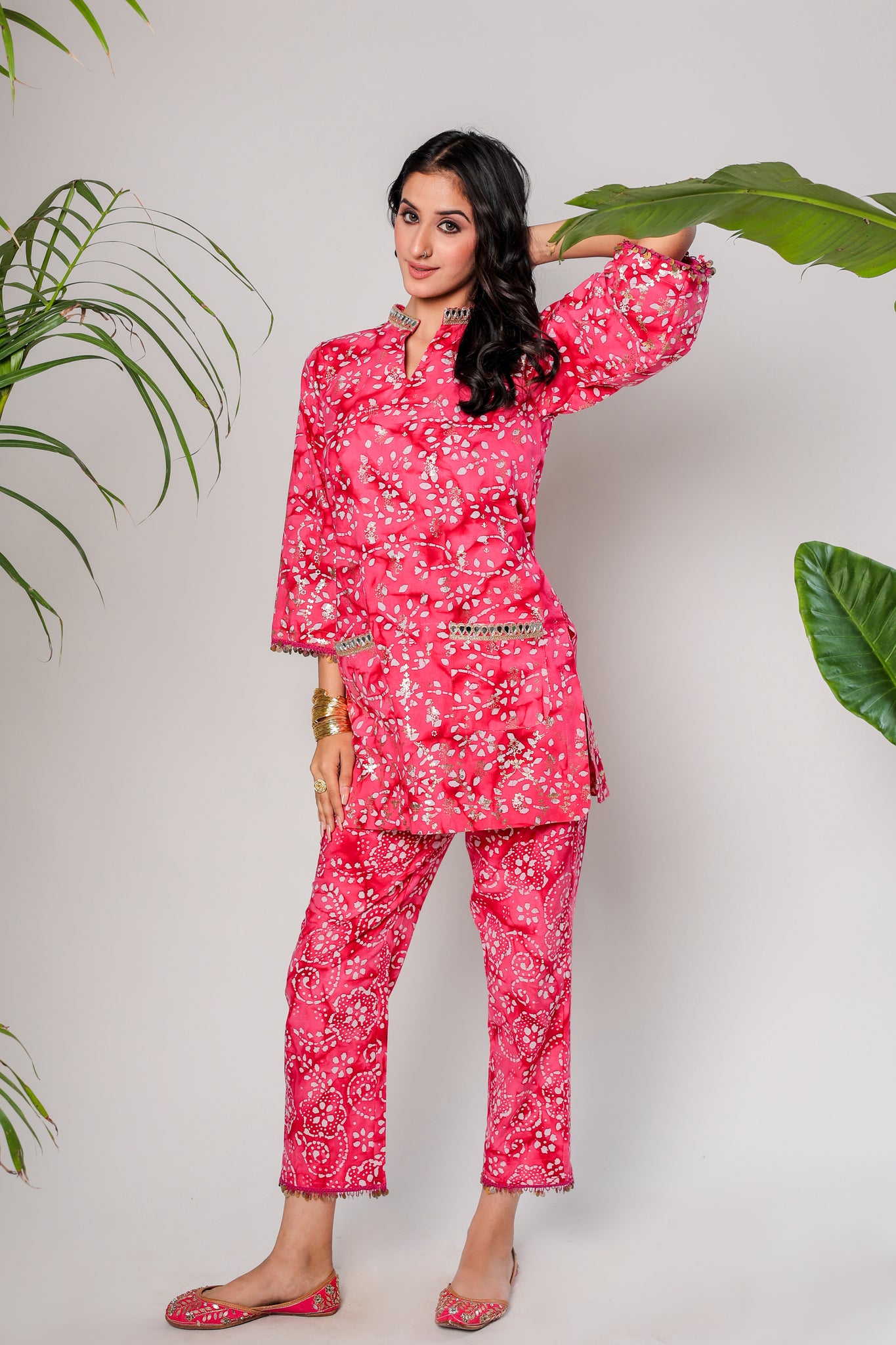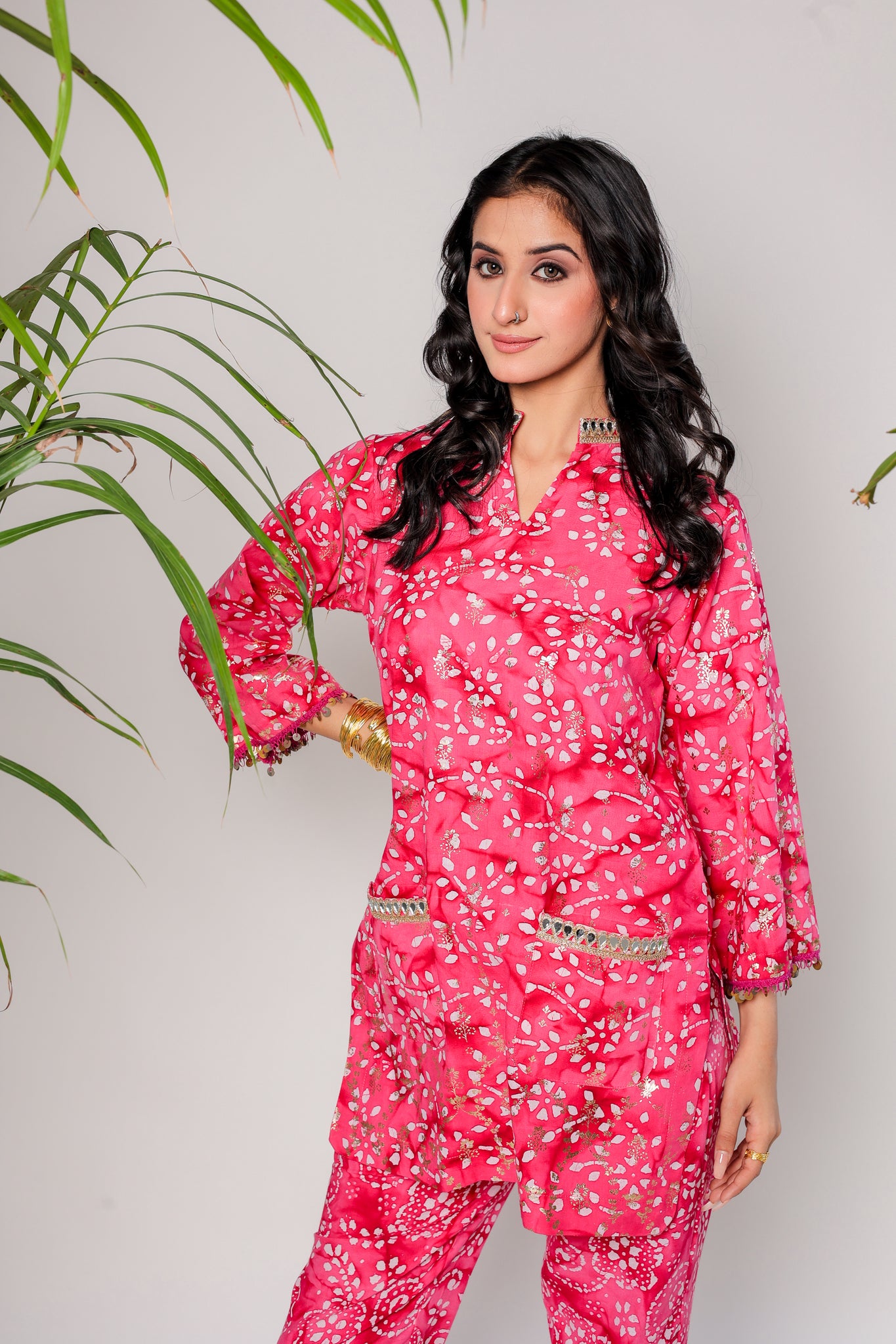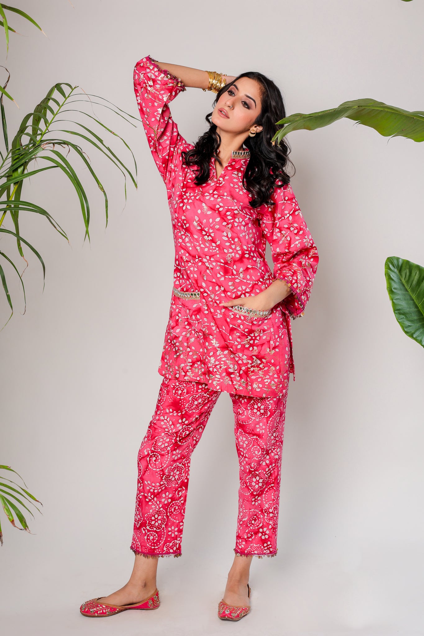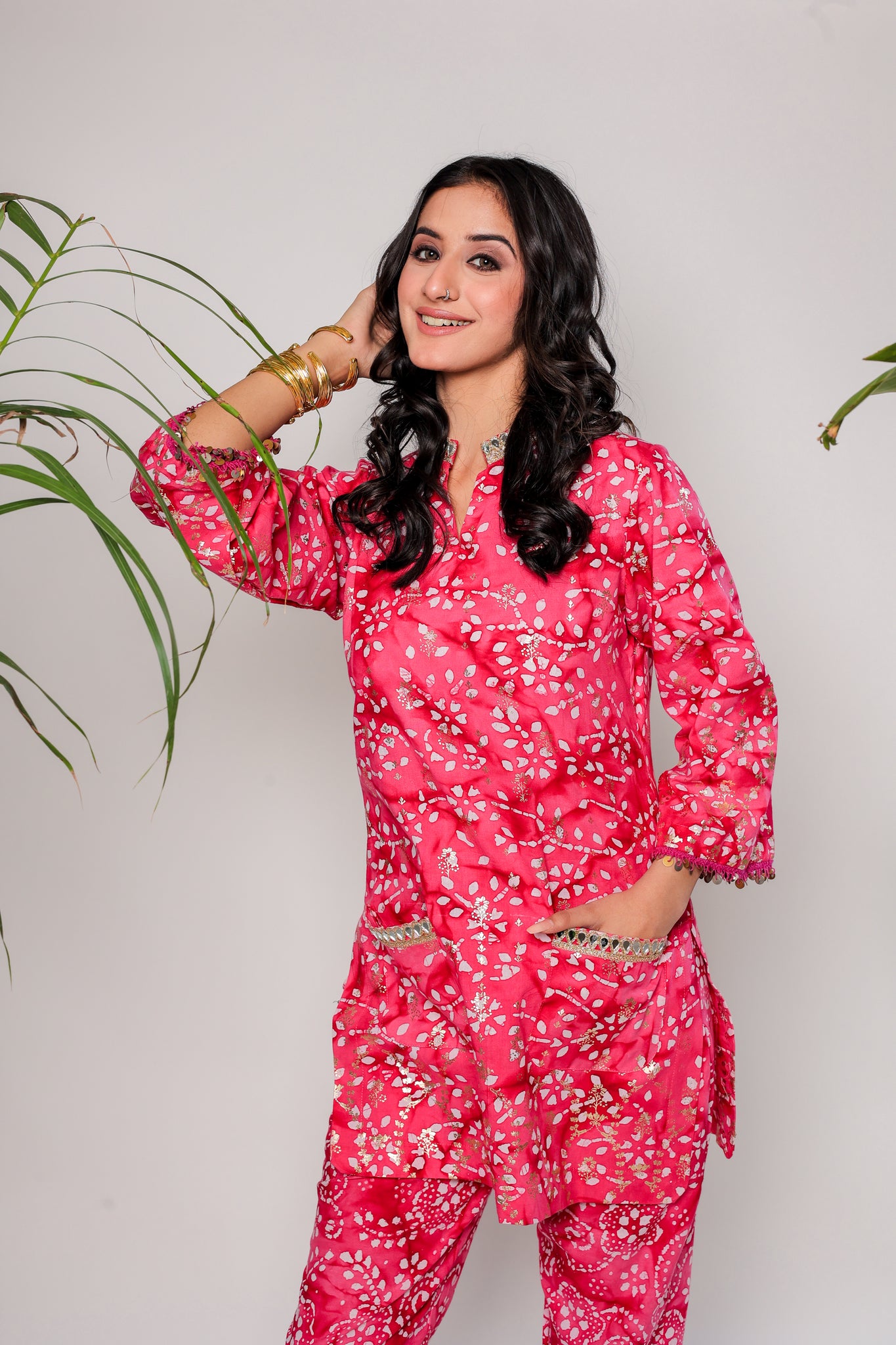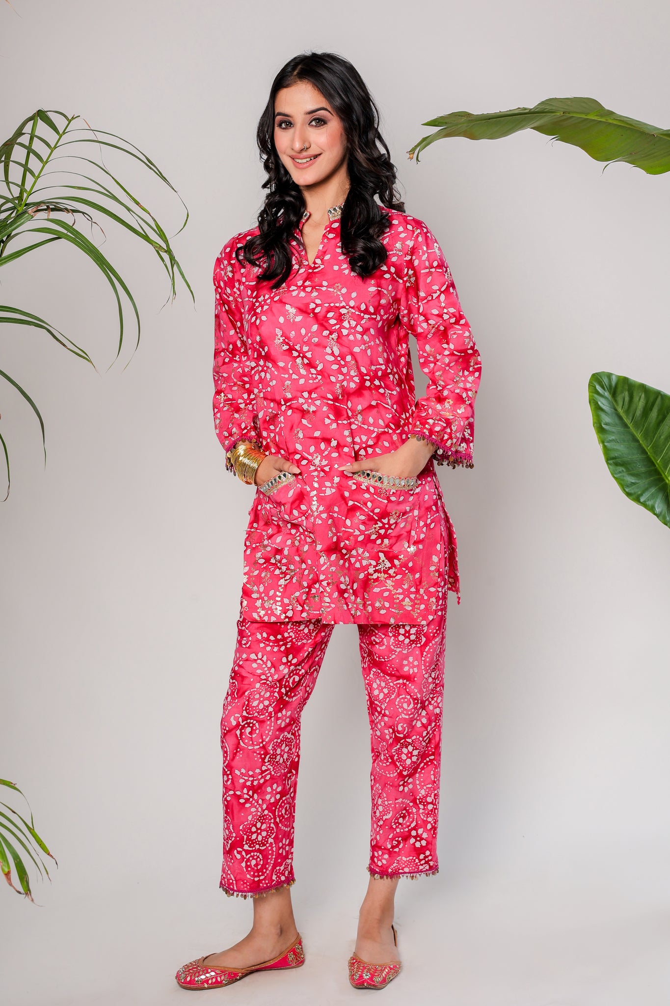 Bright and festive, this cosy coord set is ideal for summertime get-togethers. The outfit is adorned with lace details on the salwar bottoms and pockets. The kurta's striking foil design is something you cannot ignore.