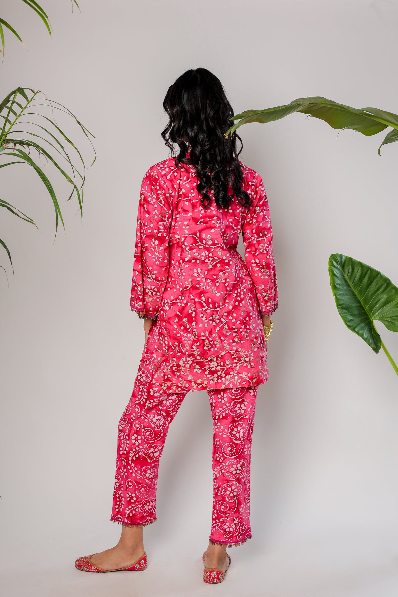 Bright and festive, this cosy coord set is ideal for summertime get-togethers. The outfit is adorned with lace details on the salwar bottoms and pockets. The kurta's striking foil design is something you cannot ignore. Elevate your style with touch of sophistication in this coord set from Your Mine Story.
