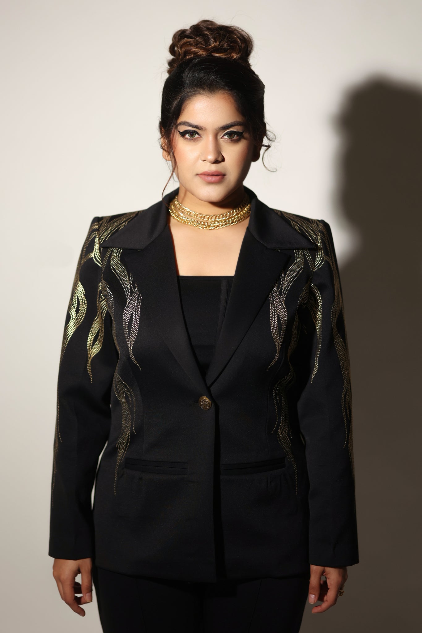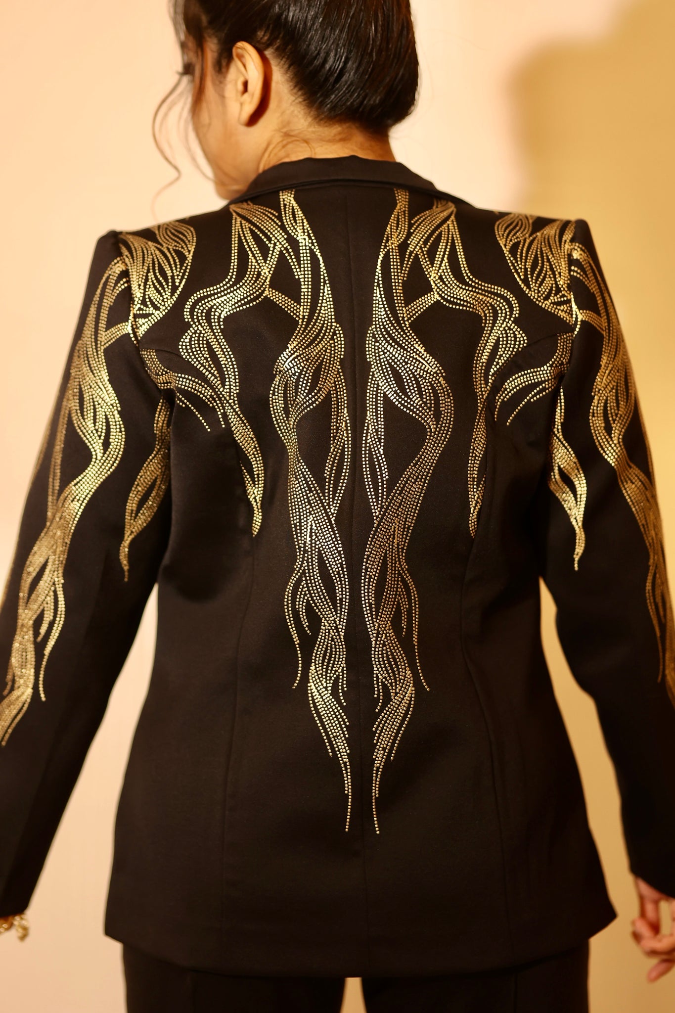 OH,THIS FORMAL BLAZER IS JUST SO EXTRAORDINARY! THE GOLD PRINT DETAILING MAKES IT STAND OUT WHICH MAKES IT A HEAD TURNER ON ANY FORMAL OCCASION.