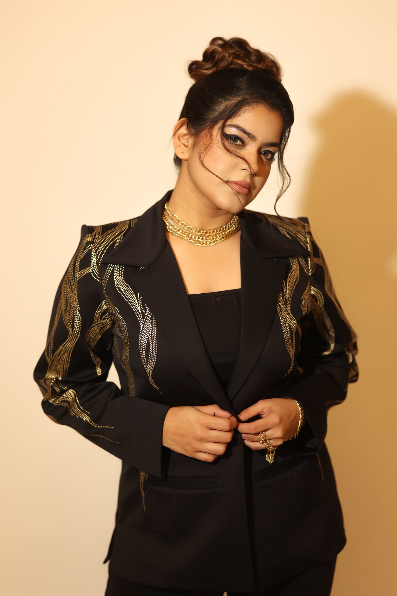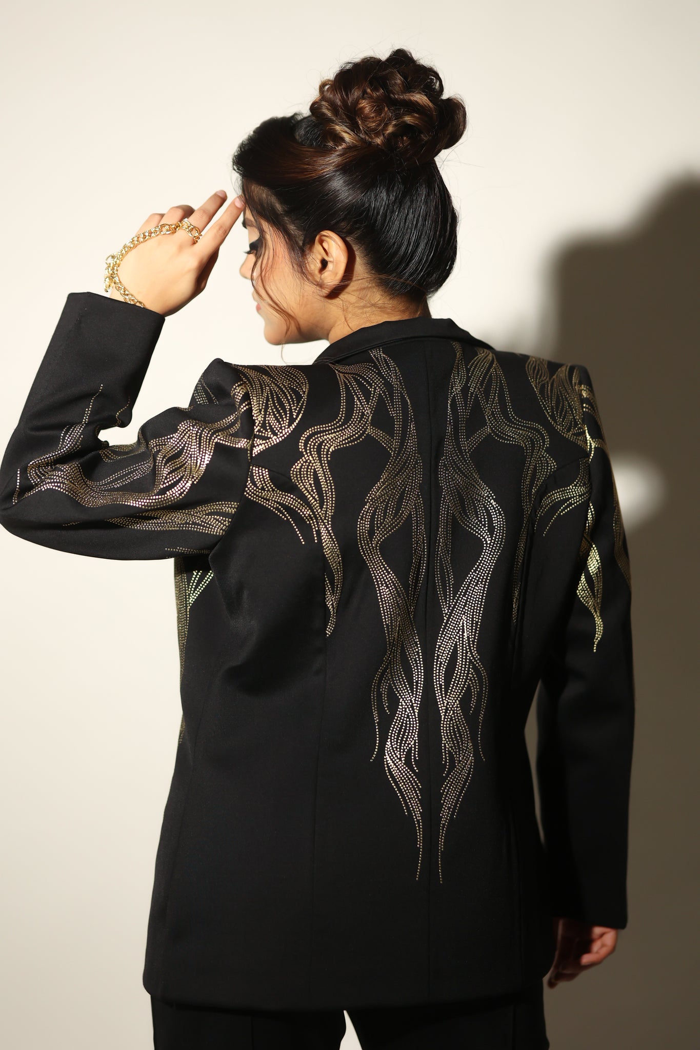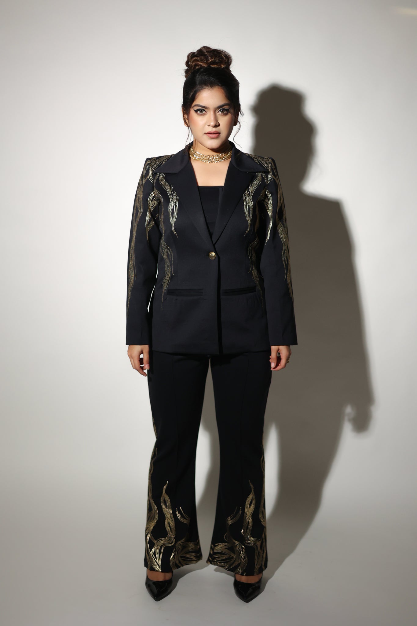 OH, This power Pant Suit (TWO PIECE) IS JUST SO EXTRAORDINARY! THE GOLD PRINT DETAILING MAKES IT STAND OUT WHICH MAKES IT A HEAD TURNER ON ANY FORMAL OCCASION.