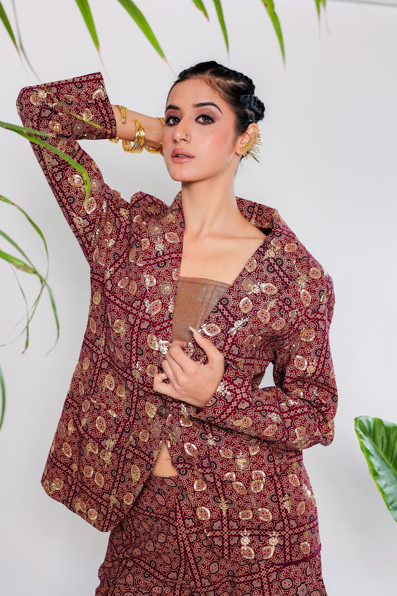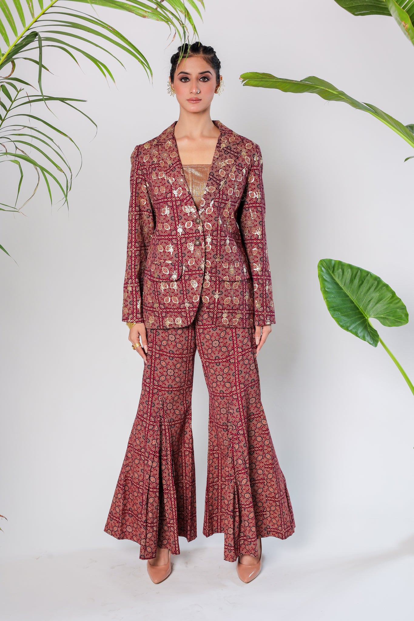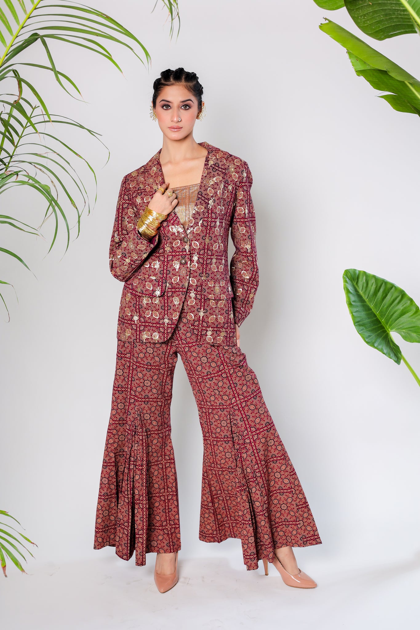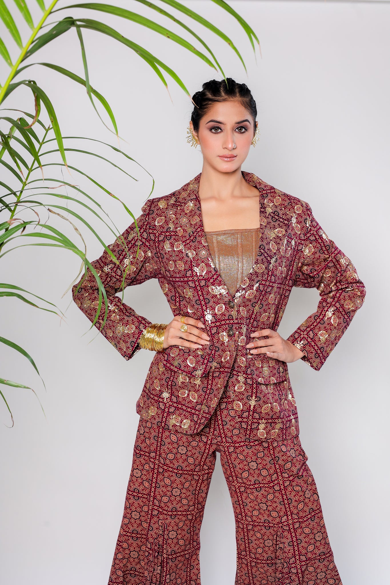 Presenting the hand-embroidered Summer Three-piece Suit from Your Mine Story! This ensemble, which includes exquisitely Flared Pants and a brilliantly hand-embroidered Blazer, exudes modern refinement. The gorgeous foil printed corset is an absolute desire and completes the outfit...Read more