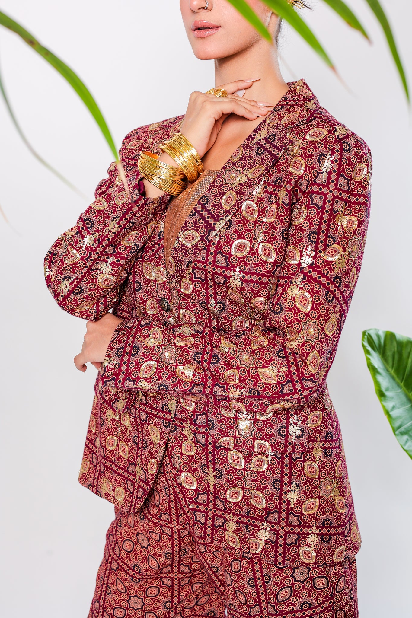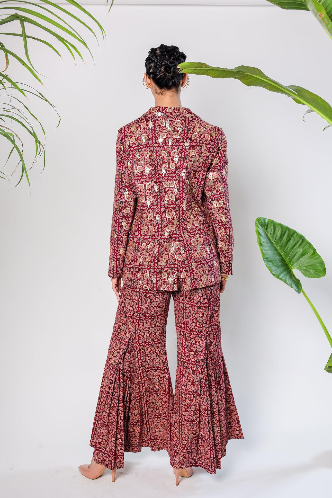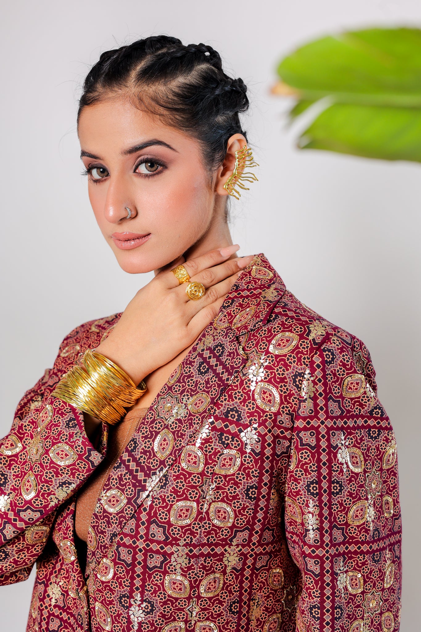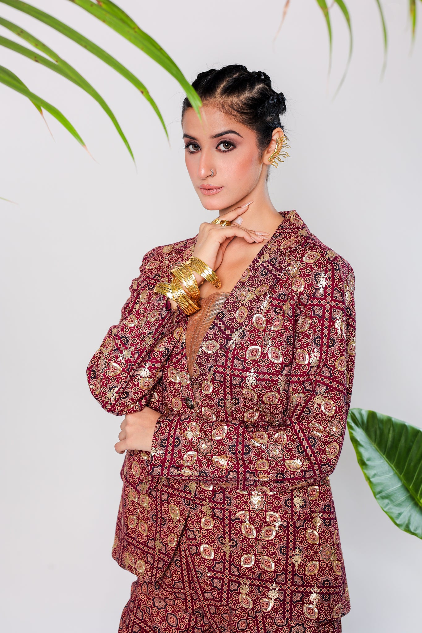 Presenting the hand-embroidered Summer Three-piece Suit from Your Mine Story! This ensemble, which includes exquisitely Flared Pants and a brilliantly hand-embroidered Blazer, exudes modern refinement. The gorgeous foil printed corset is an absolute desire and completes the outfit...Read more