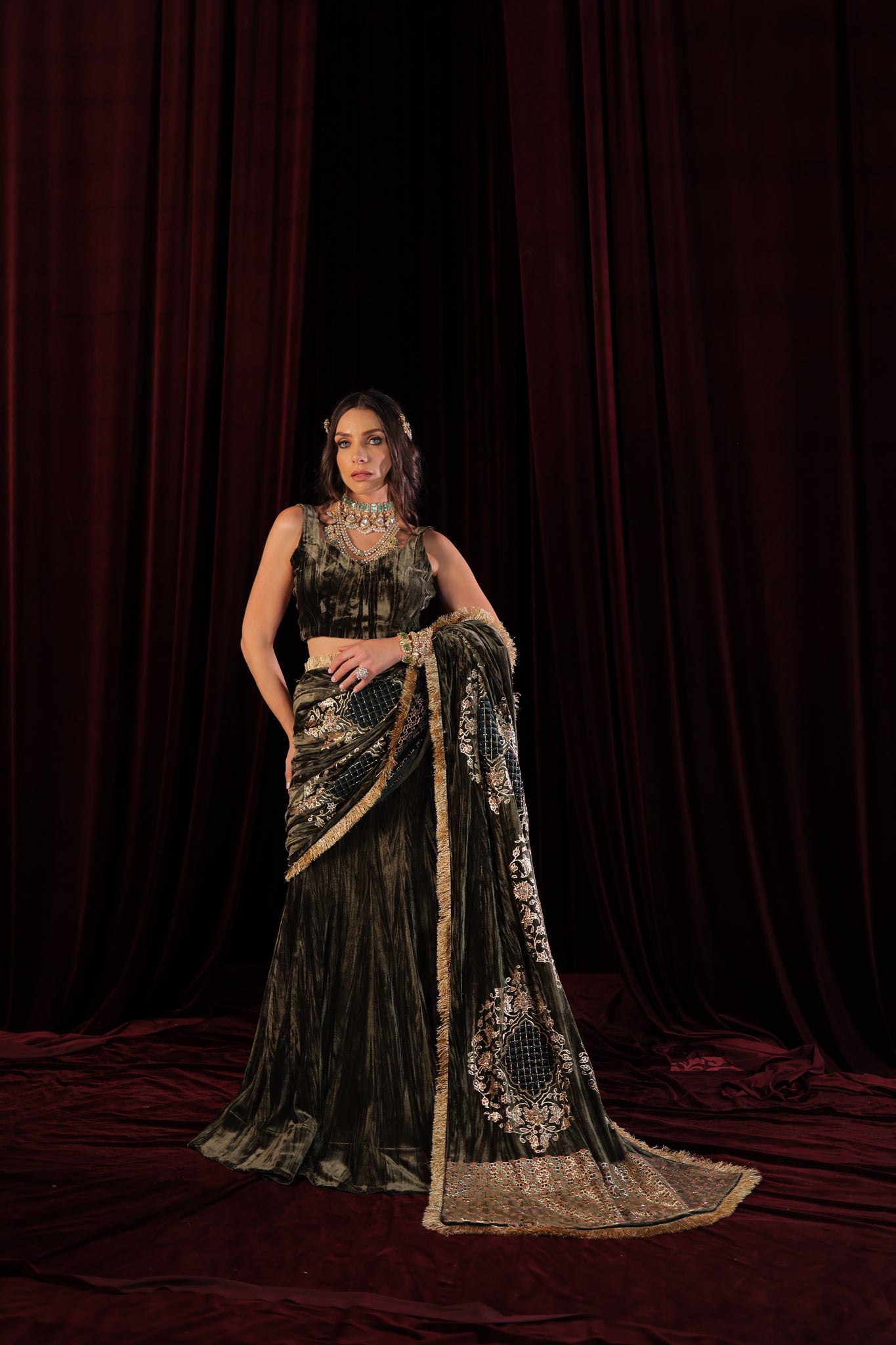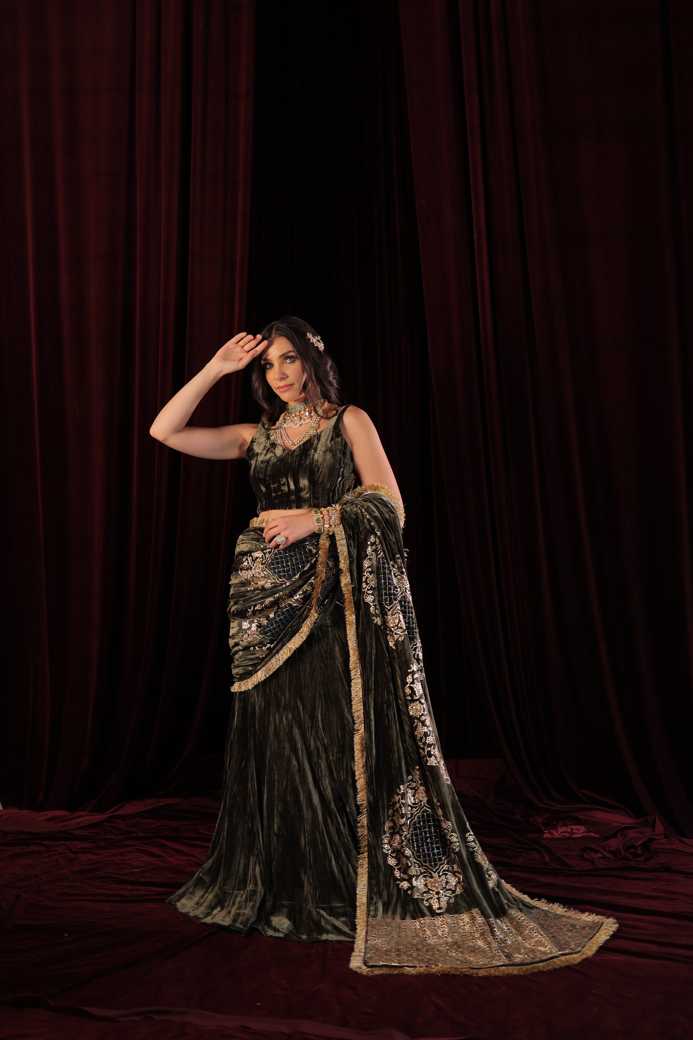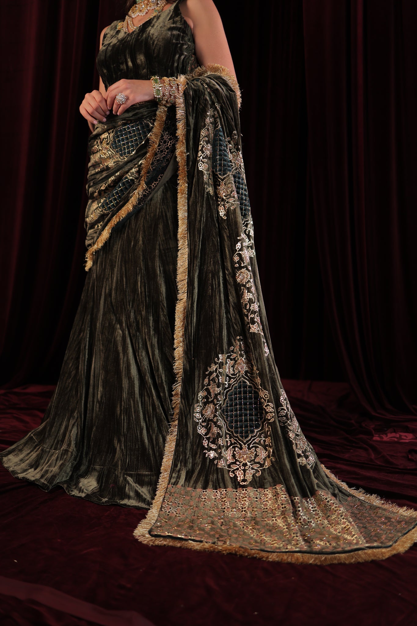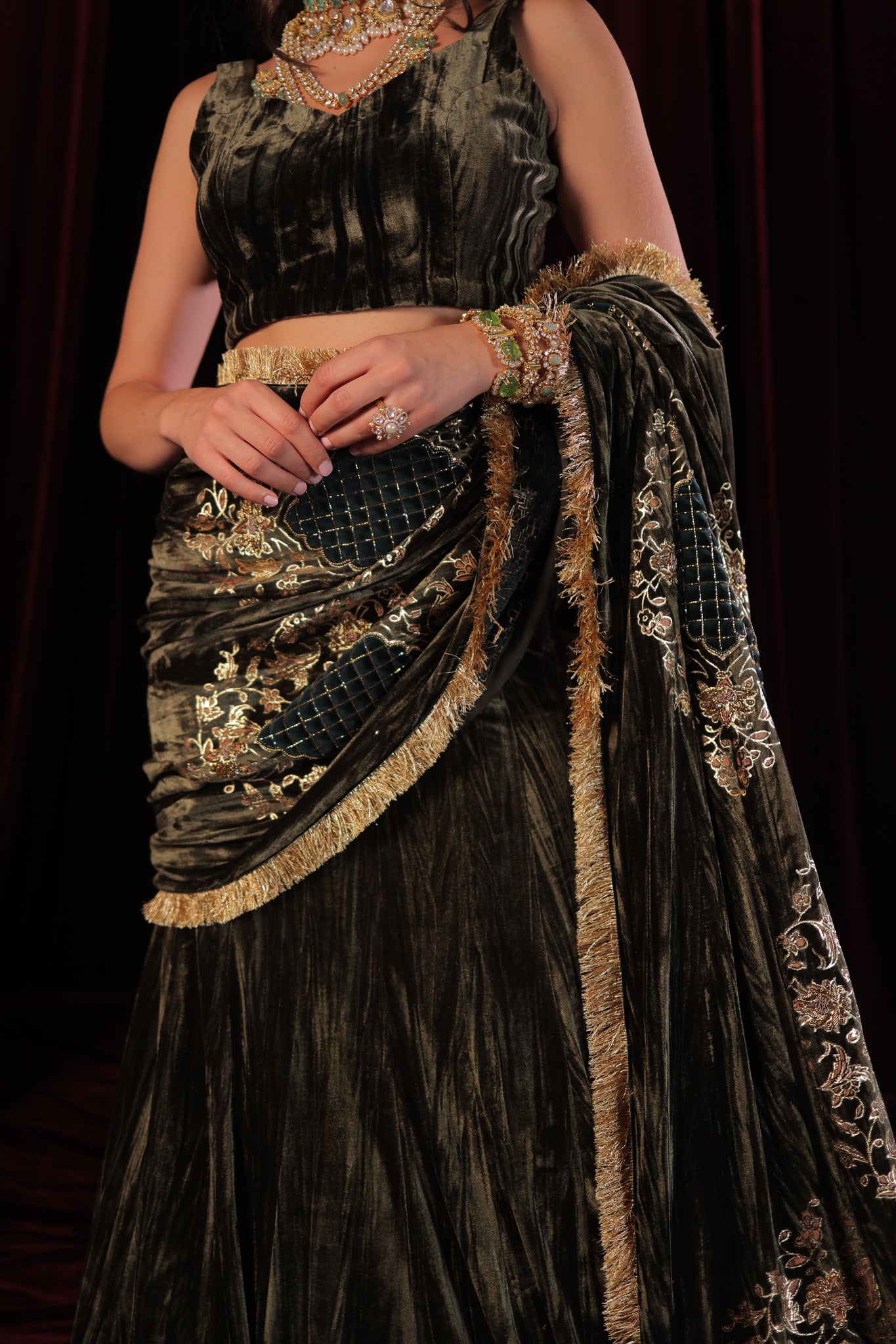 Designed for the modern woman, this ready-to-wear drape saree is effortless and elegant — giving you the perfect look without the hassle of traditional draping. Each piece is thoughtfully designed and meticulously handcrafted, making it truly one of a kind. Graceful, glamorous, and effortlessly sophisticated — a must-have addition to your festive wardrobe.