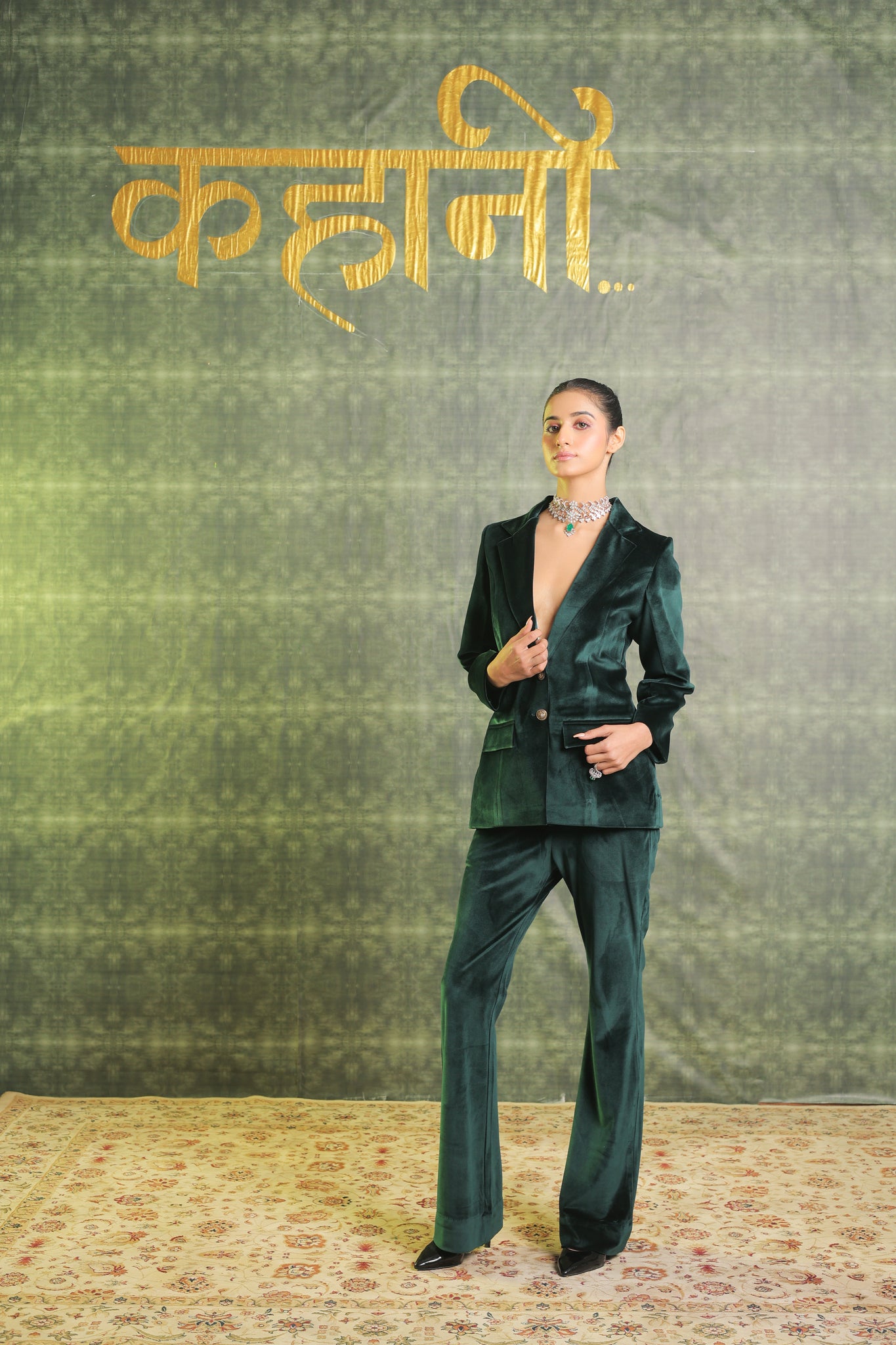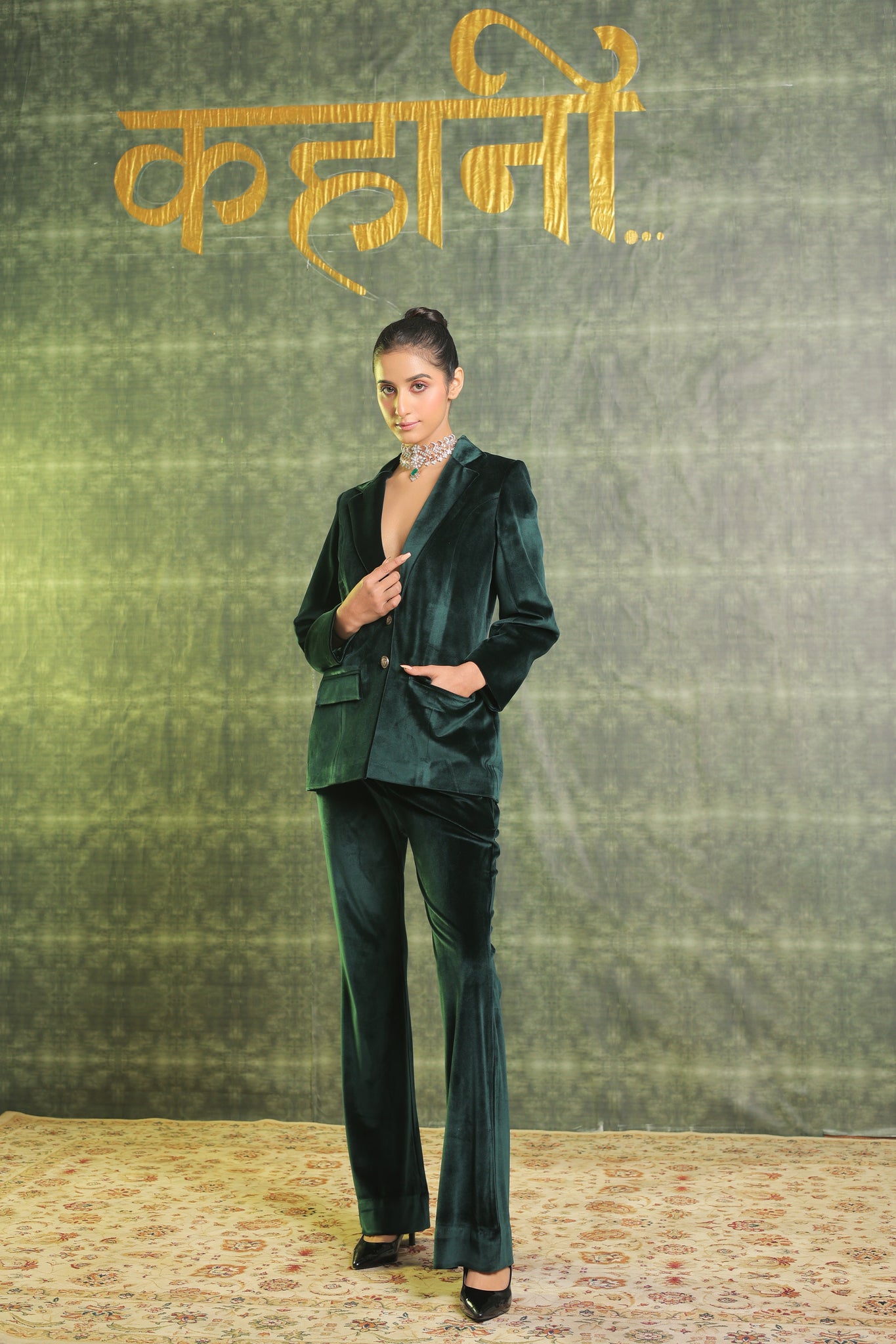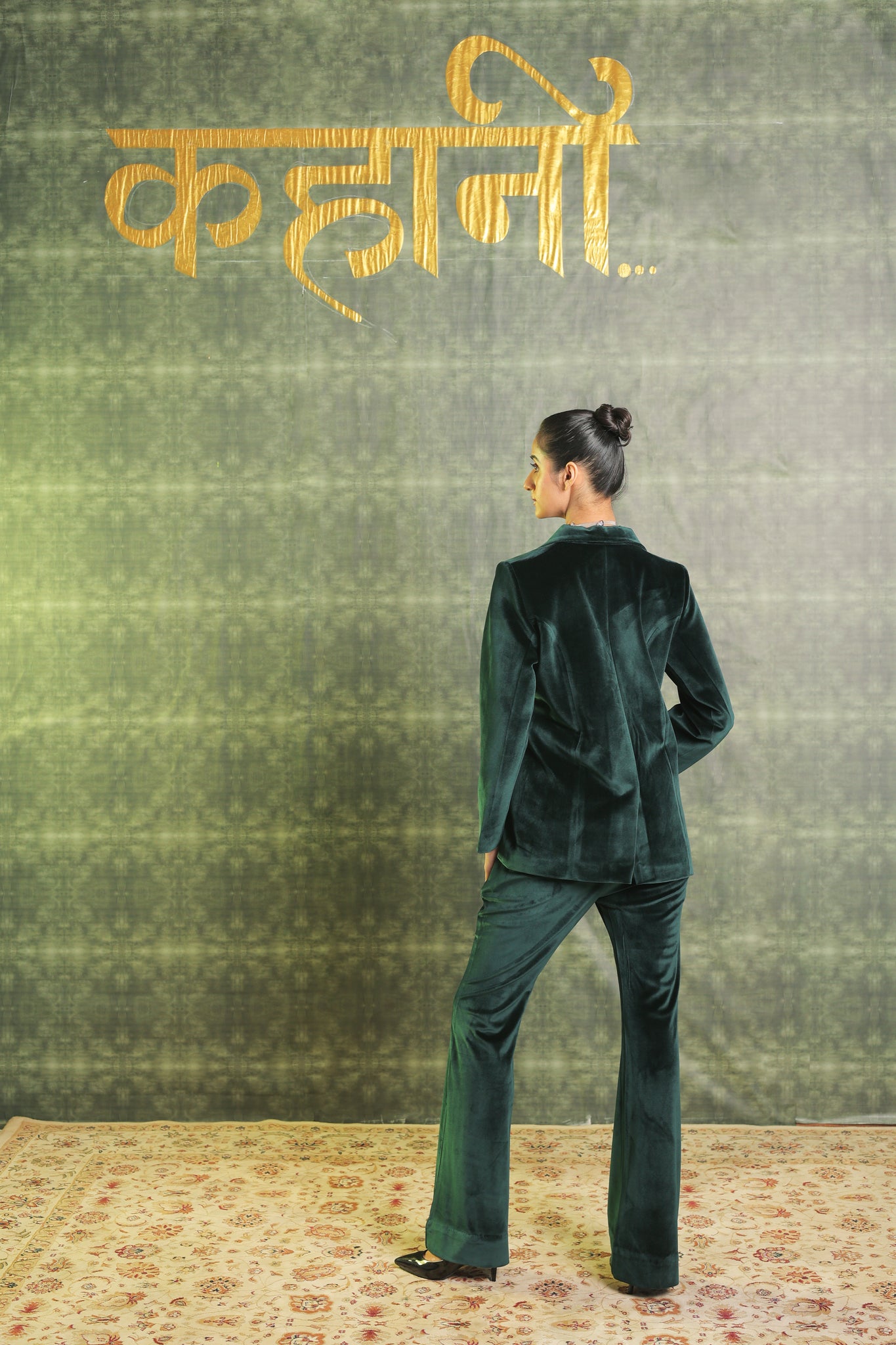 Impeccably constructed, this Power suit combines a sculpted coat and tailored trousers, providing a powerful presence for the modern woman. This contemporary silhouette combines comfort stretch with sharp tailoring, wide collar details, and two button openings. Get a Custom Fit Pant Suit for your next formal evening.