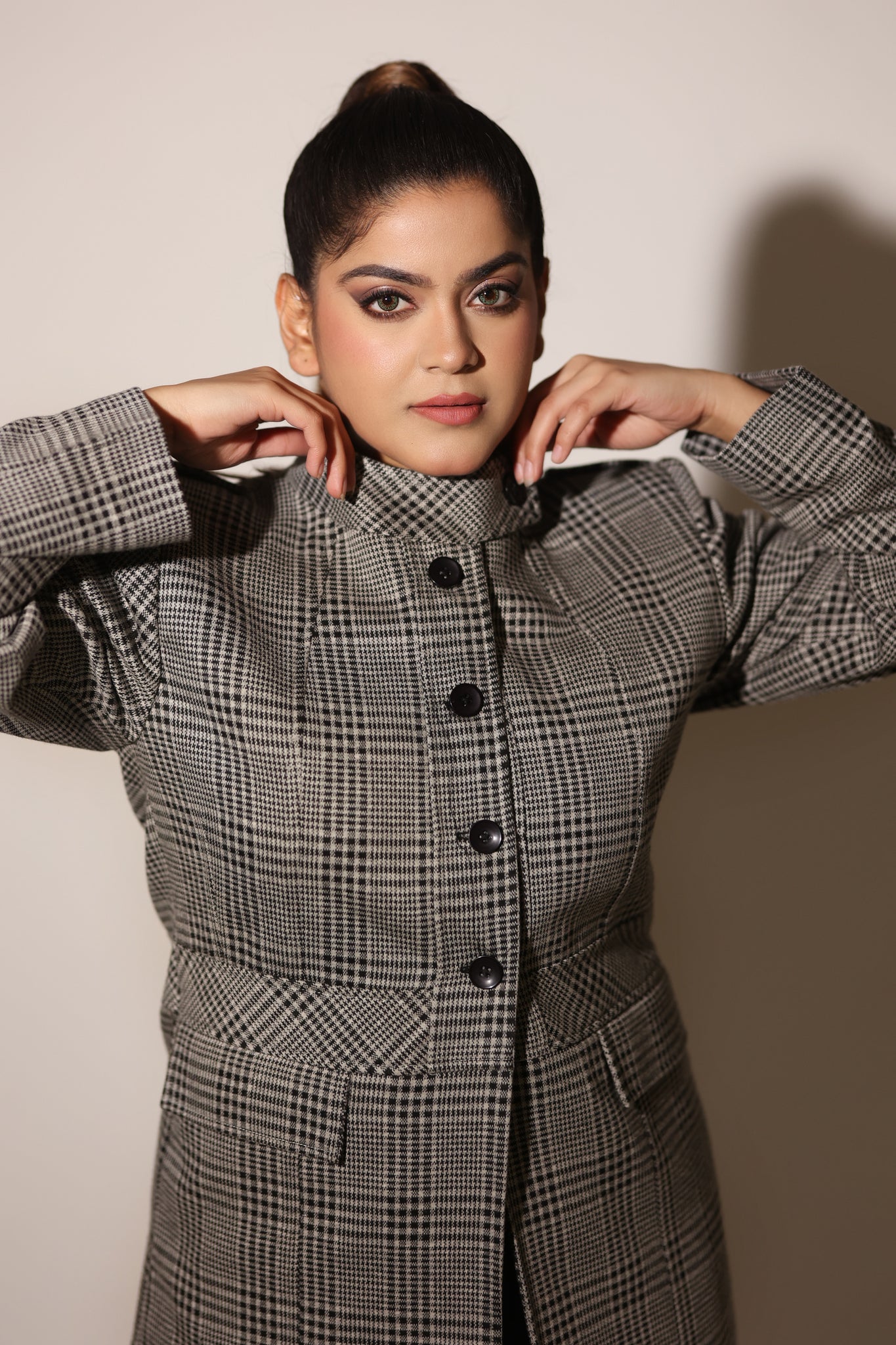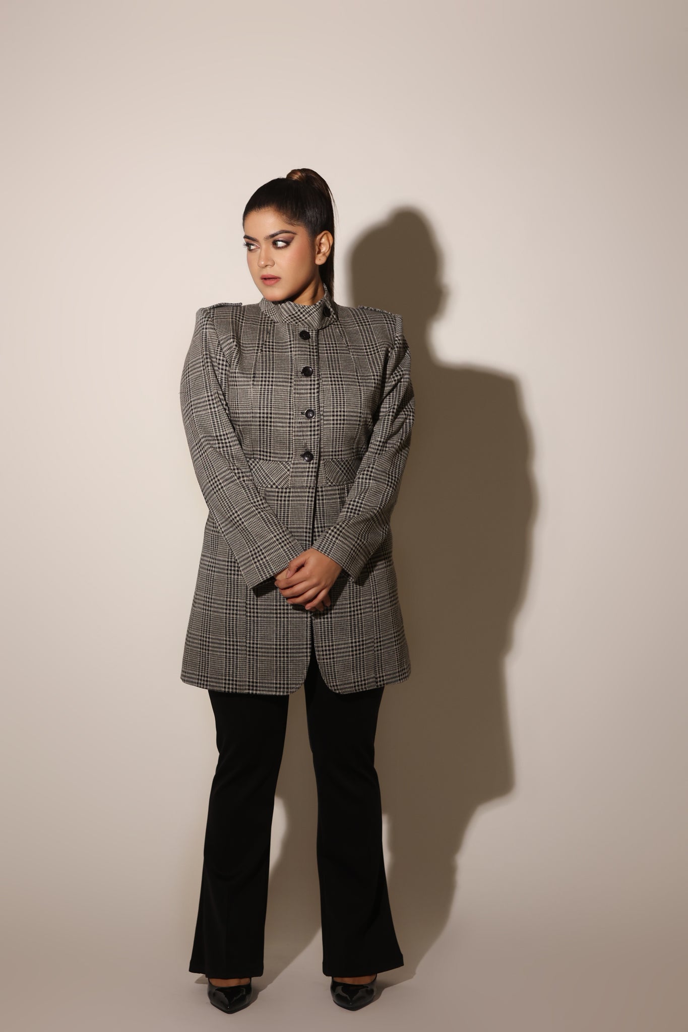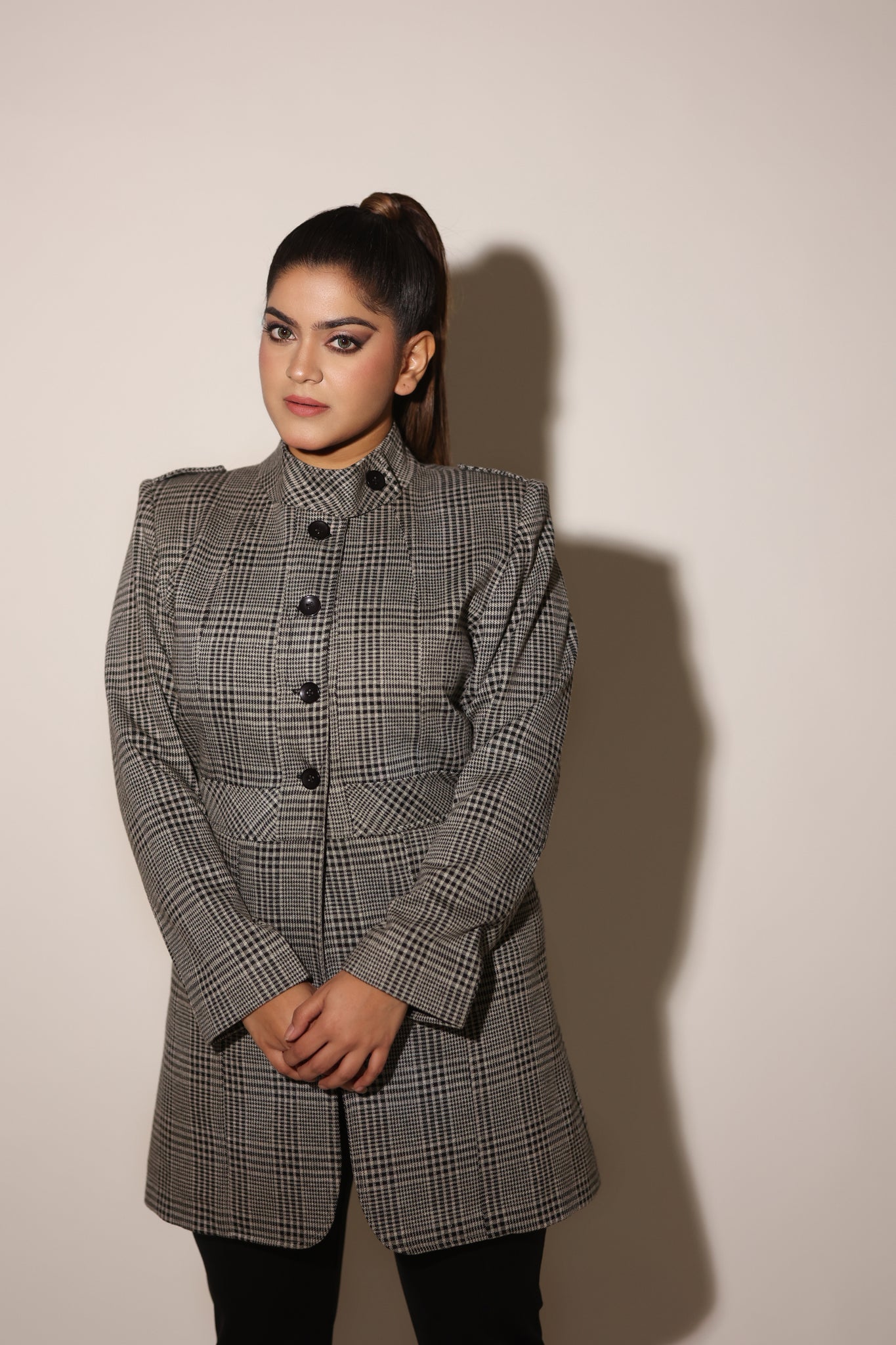 Featuring a full sleeves and checkered pattern, this blazer possesses a fashionable appeal. Style this blazer with a pair of denims/ Trousers and wedges for a classy Look! Fabric: WOOLEN JACQUARD MODEL SIZE & FITOur Founder, Neha Sood...Read more