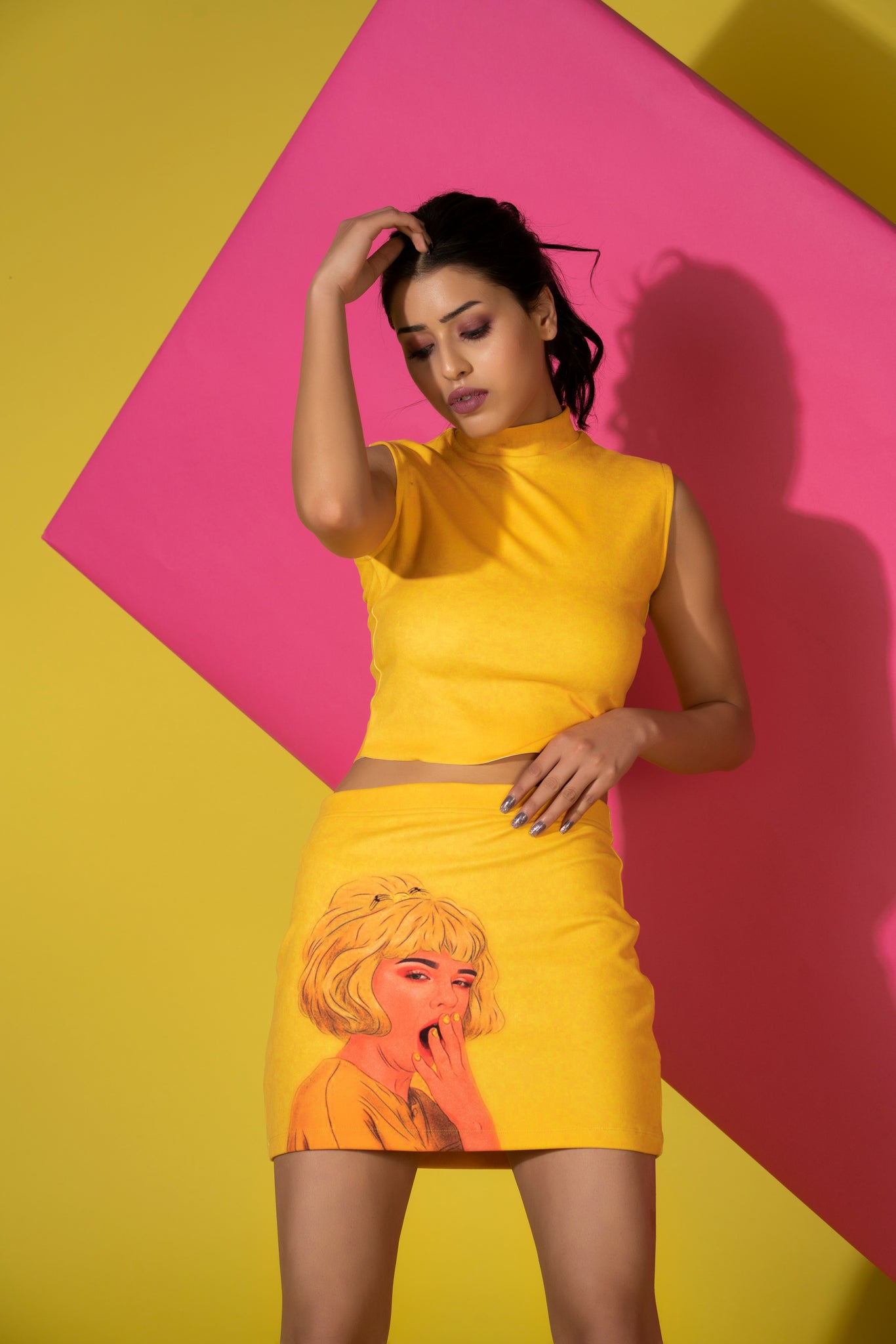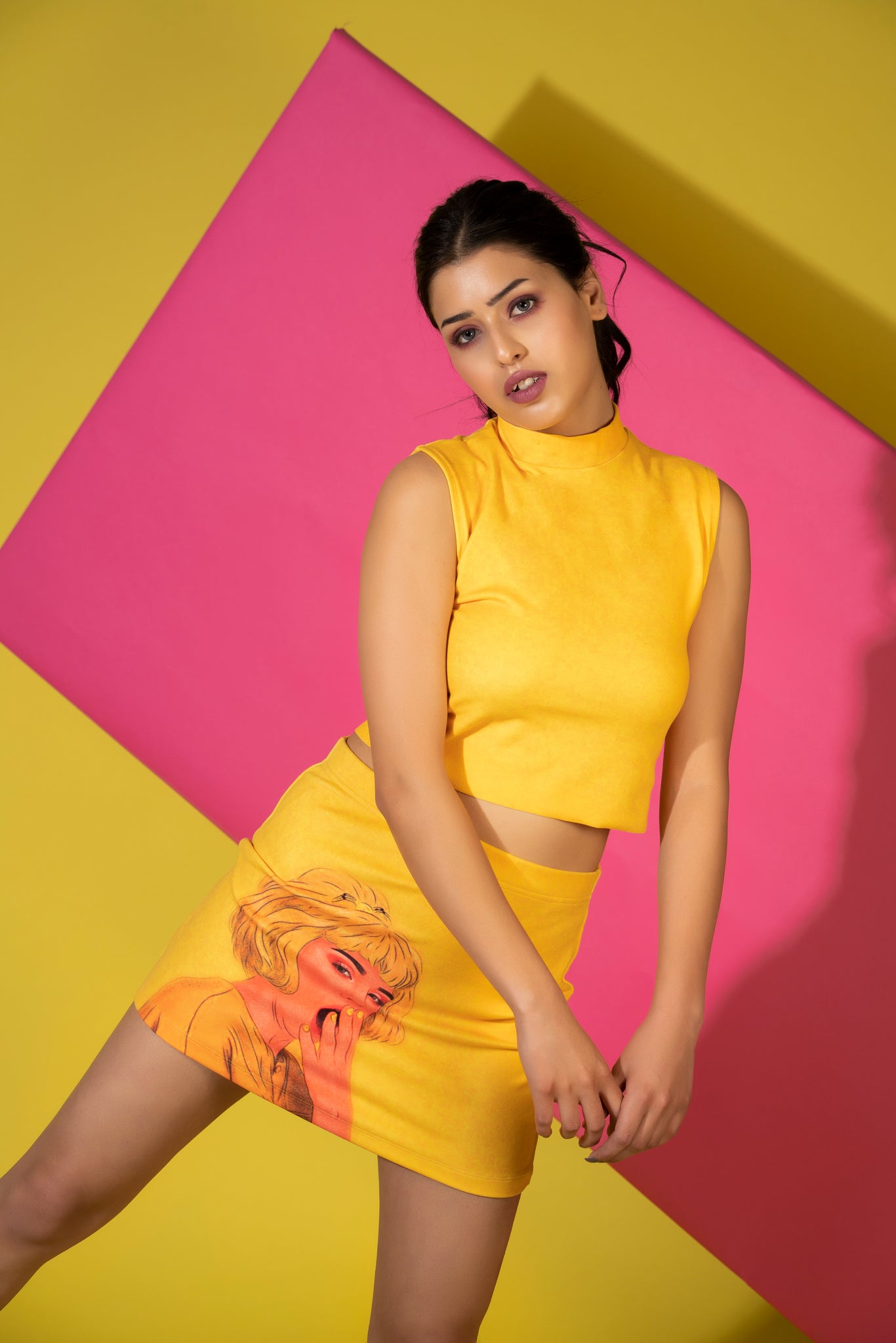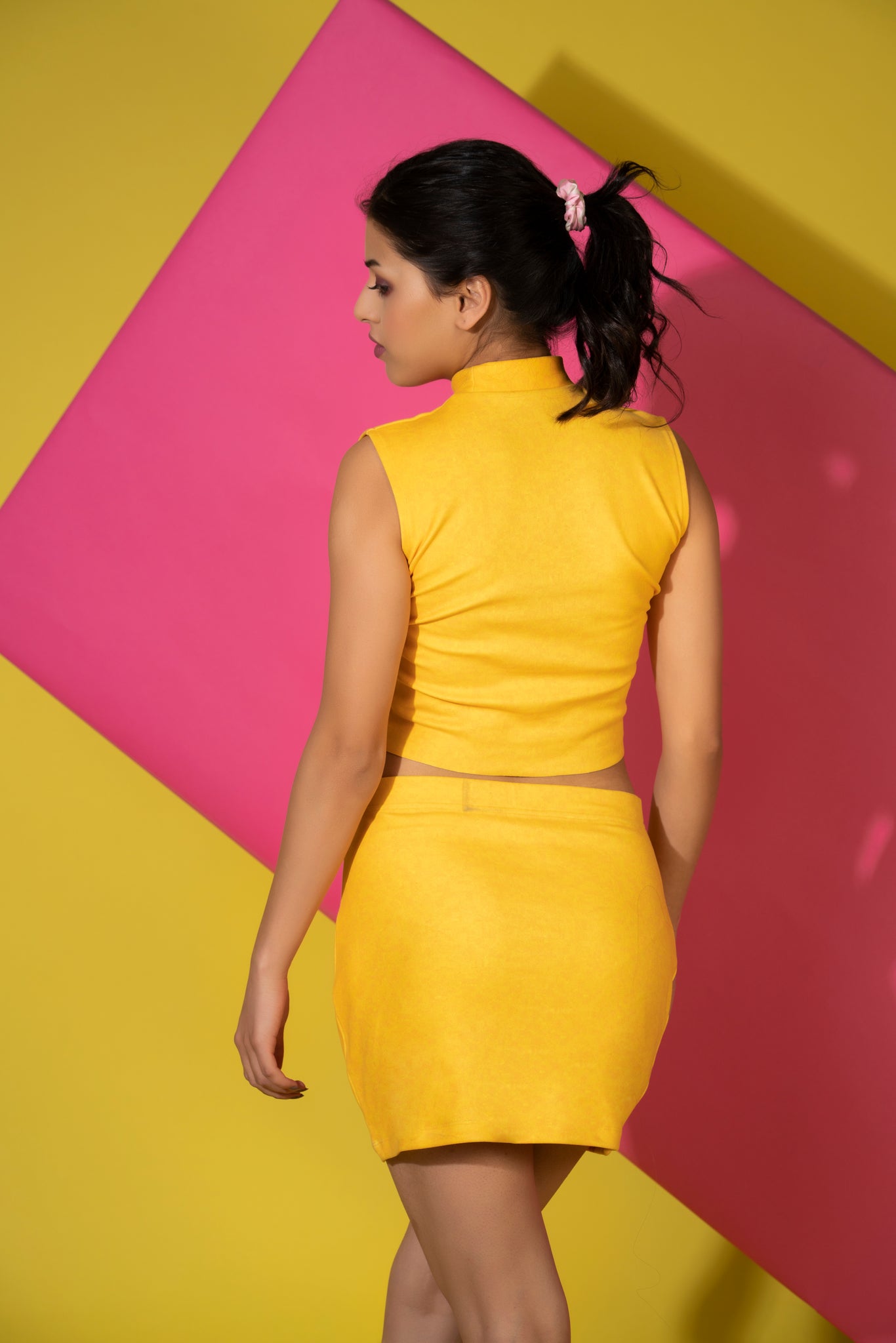 It doesn't get cooler than this yellow summerish co-ord set , it's time to own your street style with this mock neck sleeveless top paired with an elastic waist band skirt .