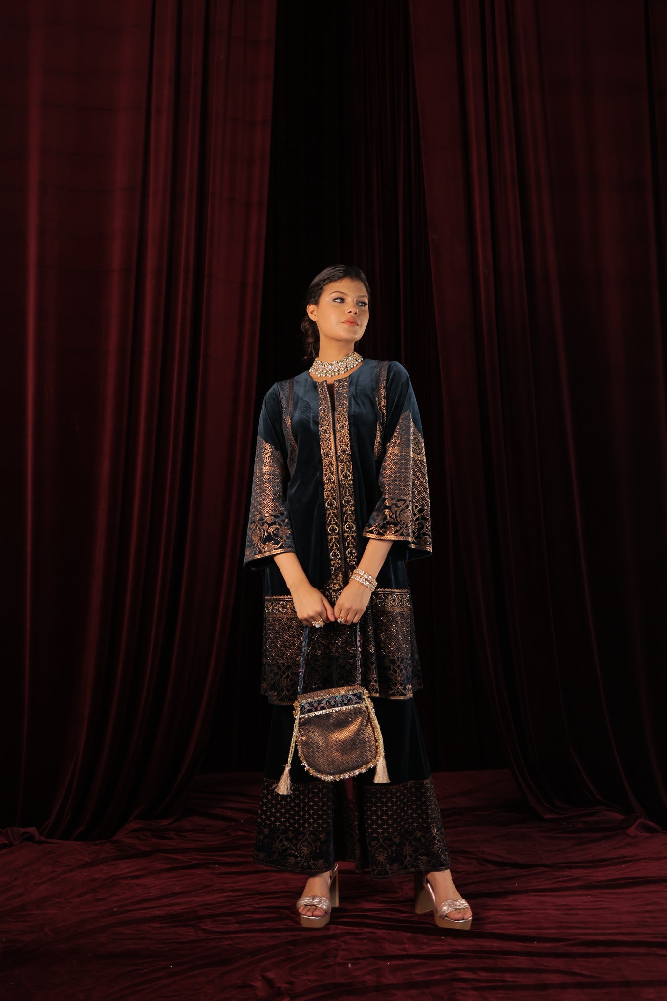must-have addition to your festive wardrobe, this Velvet Co-ord Set from YOUR MINE STORY blends grace, comfort, and contemporary charm. Featuring an all-over printed pattern with intricate embroidery detailing, it exudes effortless sophistication. The rich velvet fabric offers a formal yet comfortable feel, perfect for wedding functions or festive gatherings. Each set comes with a matching potli bag, adding an Indo-Western touch that completes the look with finesse.